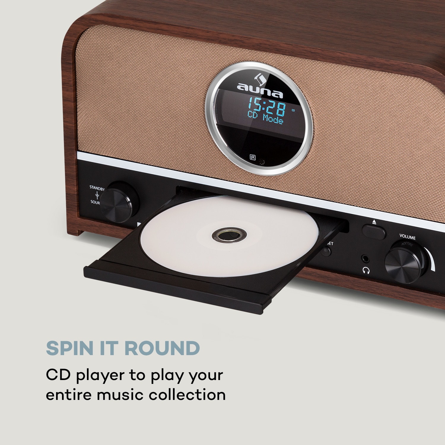 S rádiom DAB Columbia od auna môžete do vašej kuchyne vniesť vysoký výkon, maximálnu funkčnosť a dokonale tvarovaný nostalgický šarm. Kuchynské rádio Columbia od auna je na polceste medzi minulosťou a budúcnosťou. V nadčasovom dizajne s klasickým vzhľadom sa ukrývajú moderné technológie, ako napríklad Bluetooth a digitálny rozhlasový tuner pre príjem DAB+. Nostalgické rádio ponúka možnosť prístupu k rôznym hudobným médiám: CD prehrávač číta okrem bežných typov diskov aj disky MP3. Podobne ako pripojenie USB, aj CD prehrávač dokáže prehrávať formát WMA. Smartfóny možno pripojiť bezdrôtovo prostredníctvom Bluetooth a stereo vstup AUX uľahčuje pripojenie externých zariadení. USB port možno použiť na nahrávanie zvukových súborov z rádia DAB, CD, MP3 CD a Bluetooth do zariadení USB a tiež na pohodlné dobíjanie mobilných zariadení. Okrem toho ponúka DAB Radio Columbia od auna prehľadný LCD displej, časovač spánku a budík. Zakrivený retro dizajn celého krytu podčiarkuje šarmantný nostalgický tón, ktorý kompletizuje látkový kryt reproduktorov.