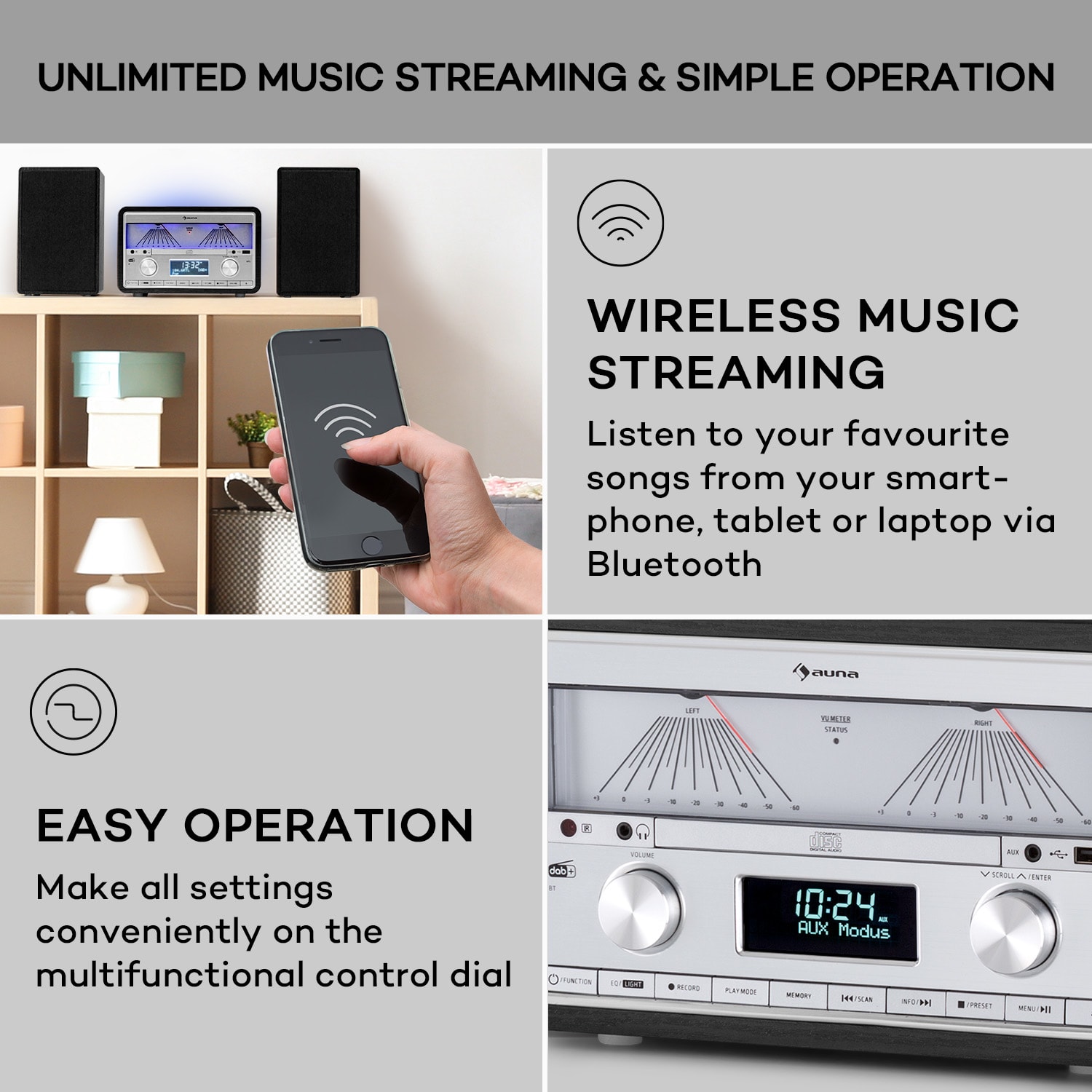 Roztočte párty s Rocket Man: Stereo systém Elton DAB od auna roztancuje bábiky stlačením tlačidla – samozrejme, v najlepšej zvukovej kvalite.Tento kompaktný multitalent prijíma analógový aj digitálny signál a poskytuje prístup k nespočetnému množstvu rozhlasových staníc z frekvenčných pásiem DAB+ a FM. Funkcia RDS ponúka dodatočný obsah programu, napríklad interpreta, názov, album alebo správy, ktoré sa vám zobrazia na 2,4″ LCD displeji. Na druhej strane, ak sa vám nechce počúvať rádio, CD prehrávač s predným slotom, USB port, pripojenie Bluetooth a AUX vstup vám z hľadiska multimediálneho prehrávača splnia všetky vaše želania. A ak vám v zbierke stále chýbajú hity, môžete si ich nahrať zo zvukových zdrojov Eltonu priamo na pripojený kľúč USB. Optimálny zvuk zabezpečujú dva 2-pásmové reproduktory s výkonom 2 x 25 W RMS, ktoré možno jednoducho nastaviť vďaka integrovanému VU-metru. A tí, ktorí si chcú vychutnať len Eltonove najväčšie hity, môžu použiť 3,5 mm výstup na slúchadlá. Vďaka jednoduchej a prehľadnej navigácii v menu je ovládanie veľmi jednoduché. Okrem toho možno rádio Elton DAB pohodlne obsluhovať pomocou dodaného diaľkového ovládača.Zvláštny dojem robí viacfarebné podsvietenie, ktoré osvetľuje zadnú stranu prístroja a integrovaný VU meter modrou, oranžovou, bielou farbou alebo farebnou slučkou podľa nálady. Mikro systém Elton DAB od auna určite nie je „the last one standing“, čo sa týka potešenia z počúvania hudby.