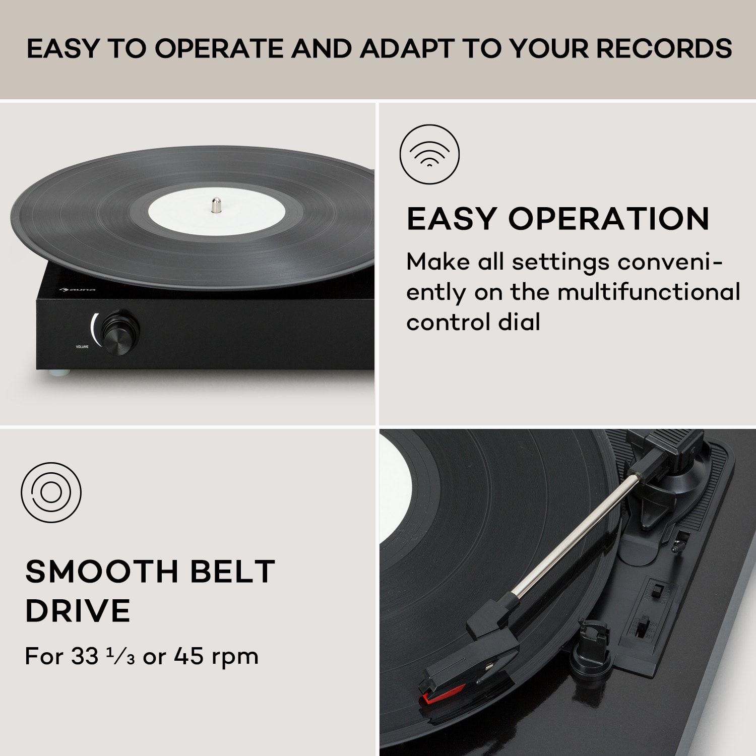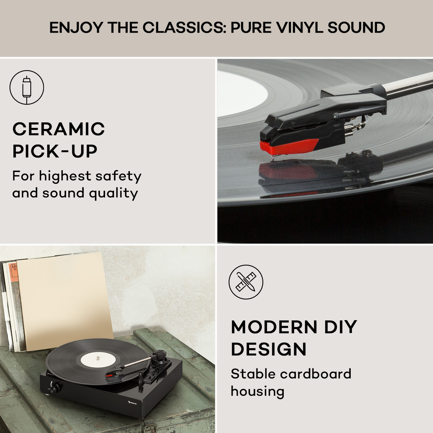 Klasický hudobný zážitok, ktorý si sami vytvoríte: Gramofón The Player od auna nielenže z vinylových platní vytiahne skvelý zvuk, ale urobí radosť aj hobby kutilom. Tento gramofón sa dodáva ako súprava pre domácich majstrov: všetky diely sú k dispozícii a zostavujú sa pomocou jednoduchých pokynov. Puzdro je vyrobené z pevného a štýlového kartónu – samozrejme, všetky potrebné otvory sú preddierované. Samozrejme, skutoční nadšenci môžu gramofón nainštalovať aj do vlastnej skrine.Zredukovaný na to najnutnejšie, gramofón The Player od auna zaujme jednoduchým ovládaním a modernými komponentmi. Jeho tichý remeňový pohon pracuje pri 33 alebo 45 otáčkach za minútu a je vhodný na všetky štandardné platne. Zabudované stereofónne reproduktory zaručujú pôžitok z hudby bez ďalších zariadení. Gramofón môžete pripojiť aj k iným zvukovým zariadeniam prostredníctvom linkového vstupu. K dispozícii je aj výstup na slúchadlá na nerušené počúvanie hudby.Klasická zábava z gramofónových platní, ktorú si môžete vytvoriť sami: Gramofón The Player od auna rozbúši srdce nadšencov.