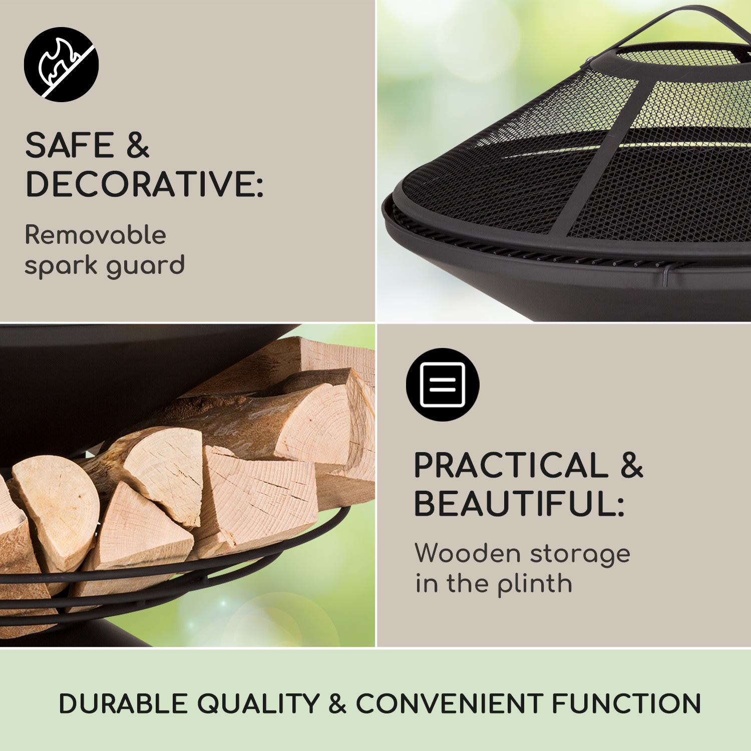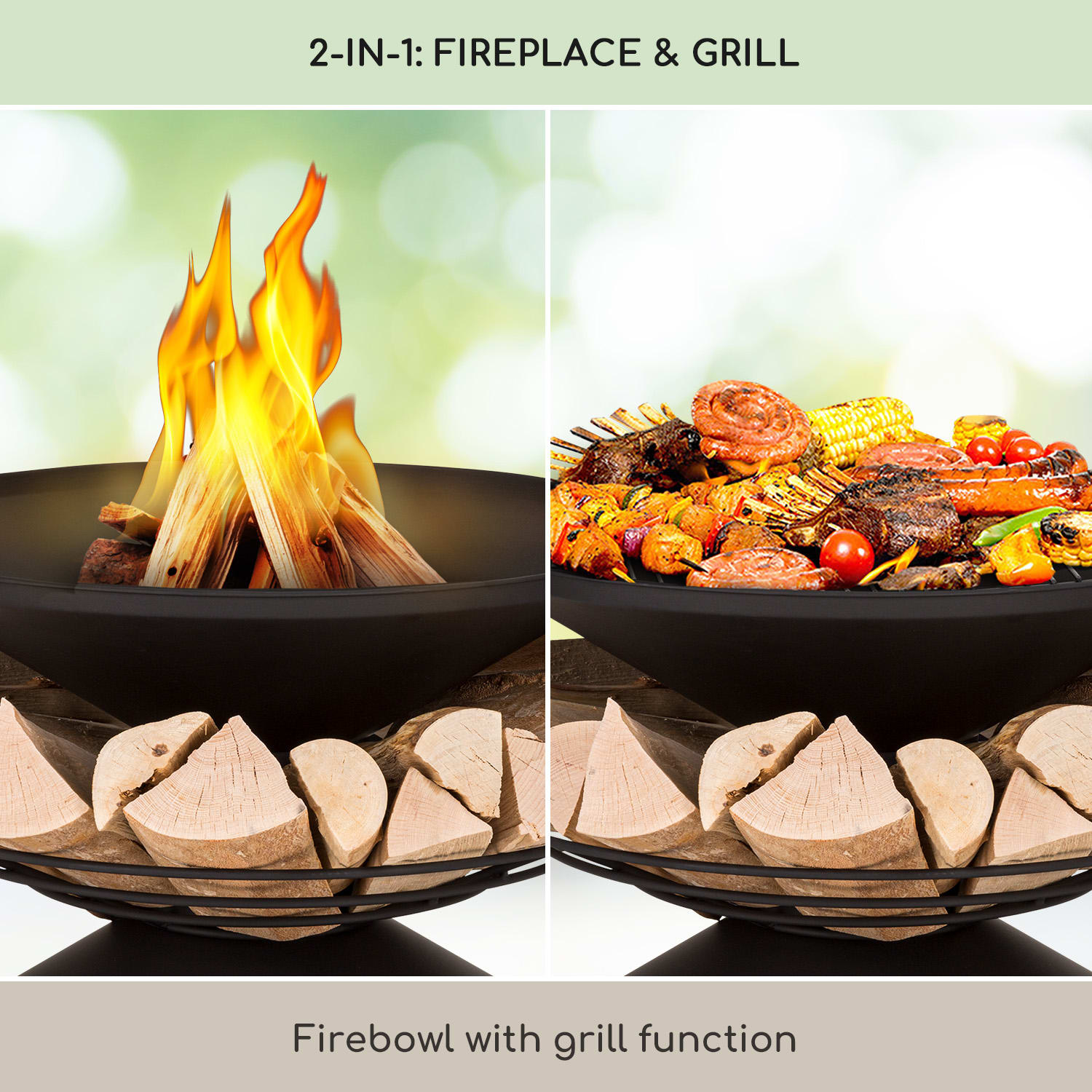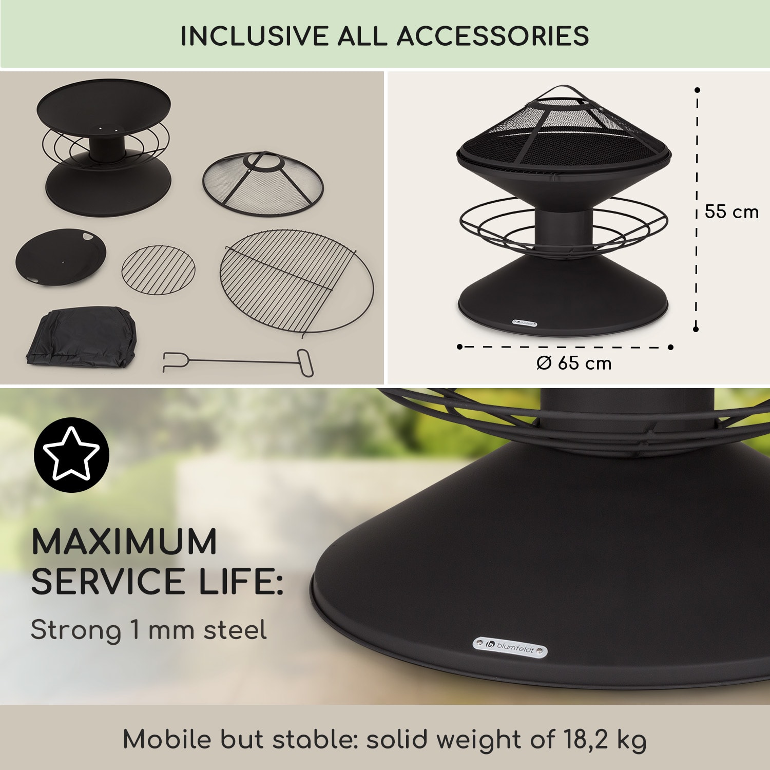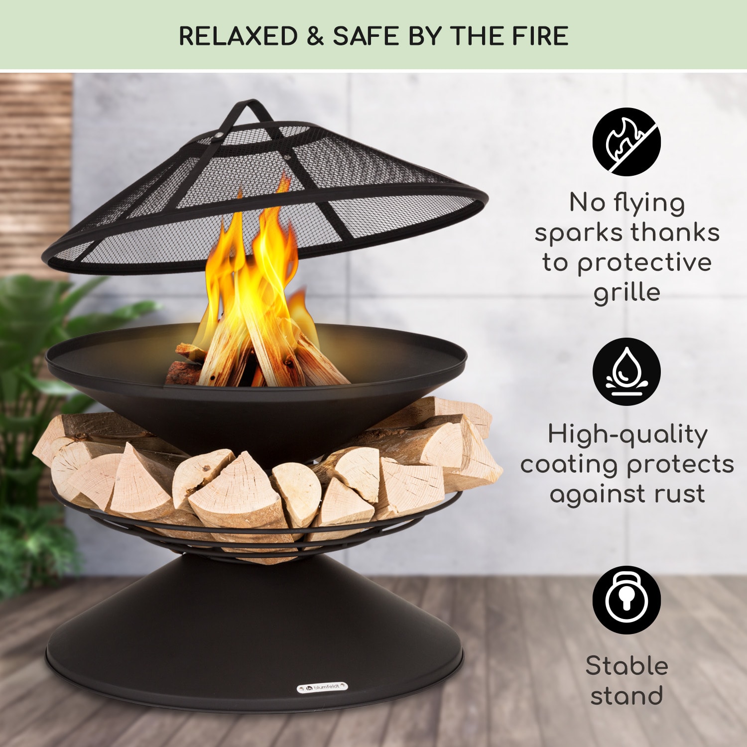 Uvoľnené hodiny relaxu v záhrade alebo na terase, dokonca aj počas chladných dní! Ohnisko s grilom Aguilera od blumfeldt to umožní dvomi spôsobmi. V ohnisku s priemerom 65 cm poskytujú drevené uhlie alebo drevo príjemné teplo a atmosféru táboráku. Ohnisko je vyrobené z ocele – takto vydrží nápory počasia a ohňa a po použití ho môžete vďaka priloženej nádobe na popol jednoducho očistiť. S ohniskom to bude aj plné chuti, keď na neho položíte grilovací rošt. Cez otvor v rošte môžete pohrabáčom rozhrabávať palivo, bez toho aby ste grilovací rošt odnímali. Aby plamene mali stále dostatok paliva, je stojan ohniska Aguilera od blumfeldt dizajnovaný ako úložný priestor na drevo. Okolo hlavného stojanu tak môžete uložiť množstvo drevených polien. Takto máte drevo neustále po ruke a zároveň zdobí ohnisko. Praktická ochrana proti iskrám sa stará o dodatočnú bezpečnosť a bráni tak nekontrolovanému lietaniu iskier.Romantický táborový oheň a praktický gril v jednom: ohnisko s grilom Aguilera od blumfeldt.