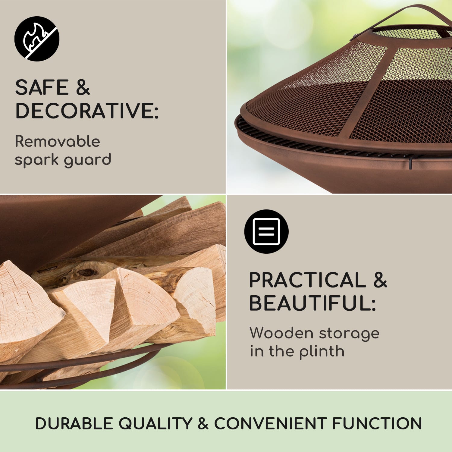 Uvoľnené hodiny relaxu v záhrade alebo na terase, dokonca aj počas chladných dní! Ohnisko s grilom Aguilera od blumfeldt to umožní dvomi spôsobmi. V ohnisku s priemerom 65 cm poskytujú drevené uhlie alebo drevo príjemné teplo a atmosféru táboráku. Ohnisko je vyrobené z ocele – takto vydrží nápory počasia a ohňa a po použití ho môžete vďaka priloženej nádobe na popol jednoducho očistiť. S ohniskom to bude aj plné chuti, keď na neho položíte grilovací rošt. Cez otvor v rošte môžete pohrabáčom rozhrabávať palivo, bez toho aby ste grilovací rošt odnímali. Aby plamene mali stále dostatok paliva, je stojan ohniska Aguilera od blumfeldt dizajnovaný ako úložný priestor na drevo. Okolo hlavného stojanu tak môžete uložiť množstvo drevených polien. Takto máte drevo neustále po ruke a zároveň zdobí ohnisko. Praktická ochrana proti iskrám sa stará o dodatočnú bezpečnosť a bráni tak nekontrolovanému lietaniu iskier.Romantický táborový oheň a praktický gril v jednom: ohnisko s grilom Aguilera od blumfeldt.