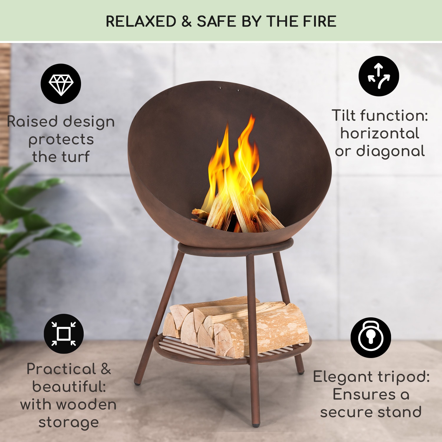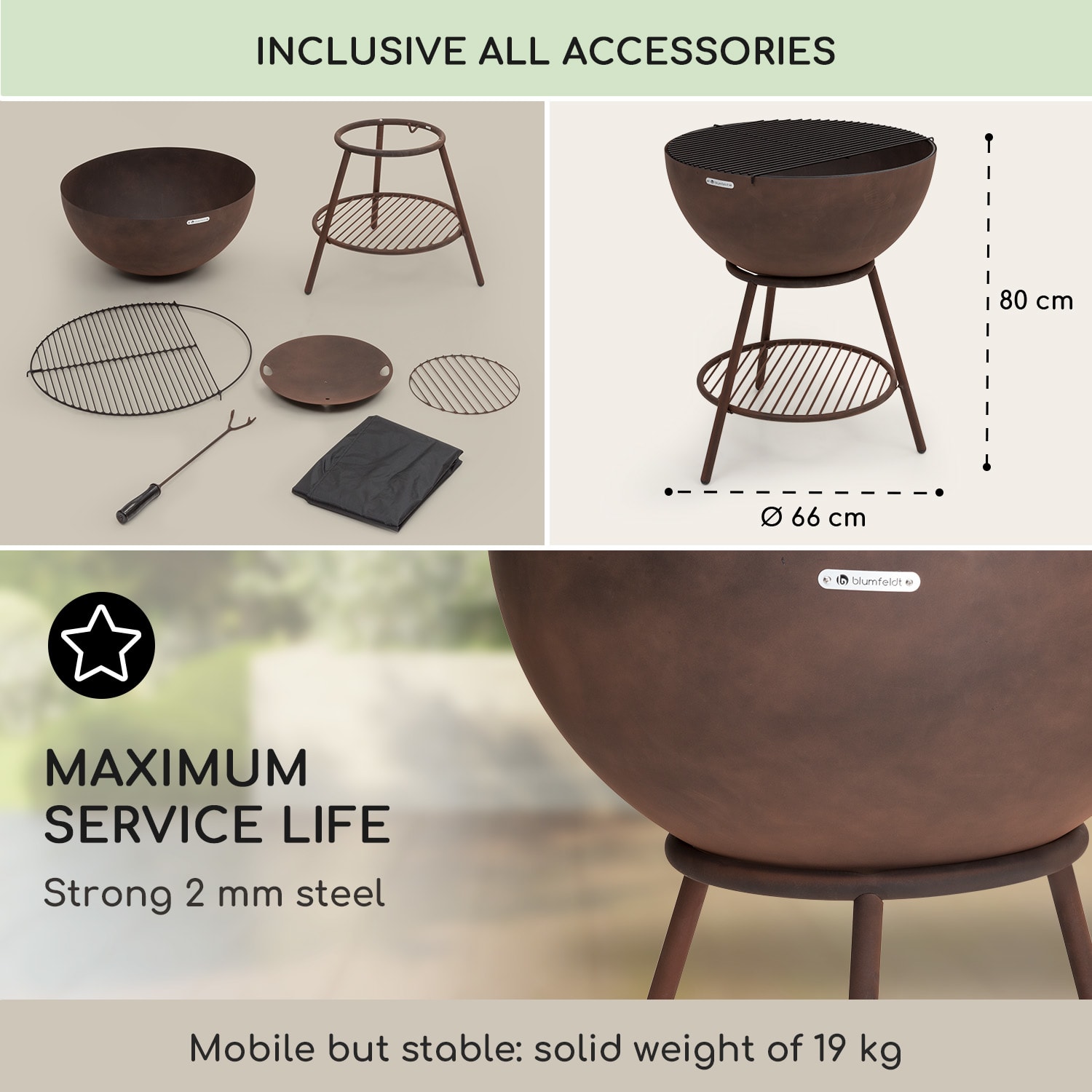 Ohnisko blumfeldt Azuma je gril a romantické ohnisko zároveň – dizajnovo výrazný pútač pozornosti pre vašu záhradu alebo terasu.Zažite všestrannú atmosféru táboráku s výhľadom na hrejivé plamene: Tu môžete grilovať pohodlne v horizontálnej polohe alebo môžete pologuľu nastaviť diagonálne pre hru ohňa chránenú pred vetrom. Ohnisko Azuma od blumfeldt je vďaka svojej 2 mm hrubej oceľovej stene veľmi robustné a bezpečne stojí na vyvýšenom stojane s tromi nožičkami. O pohodlie pri grilovaní, ohrievaní a vychutnávaní sa stará aj spodná polica, na ktorú môžete dekoratívne uložiť potrebné polená. Pre dlhodobú radosť a ochranu ohniska slúži aj kryt pred dažďom a vetrom. Vďaka priloženému pohrabáču a popolníku je jednoduché rozložiť oheň a vychutnávať si pohodové večery.