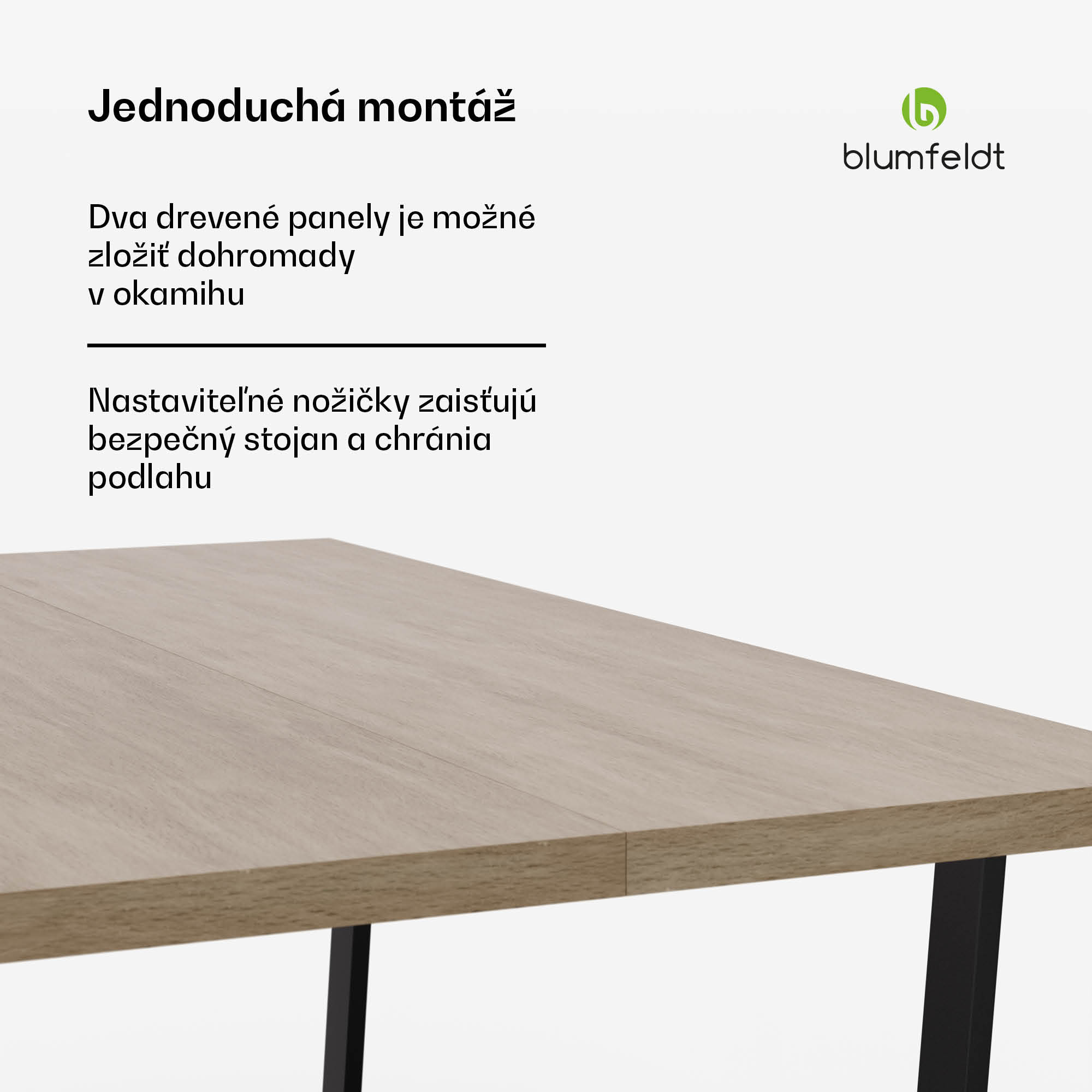 Súprava jedálenskeho stola Blumfeldt Bearsdon kombinuje štýlovú stolovú dosku z preglejky a robustné kovové nohy v industriálnom štýle a dodáva vašej jedálni alebo kuchyni moderný loftový charakter. Táto súprava zaujme kombináciou funkčnosti a dizajnu: stolová doska Bearsdon z odolnej preglejky ponúka odolný povrch, ktorý je ideálny na každodenné používanie. Je mimoriadne robustná a odolná voči zmene farby, teplu, poškriabaniu a nárazom. Zodpovedajúce nohy stola Ayr z vysokokvalitného kovu svojou čiernou povrchovou úpravou vytvárajú moderné akcenty a zaisťujú stabilitu. S jedálenským stolom Blumfeldt Bearsdon Bundle môžete vytvoriť štýlový dizajnový doplnok, ktorý sa dokonale hodí k rôznym štýlom zariadenia.