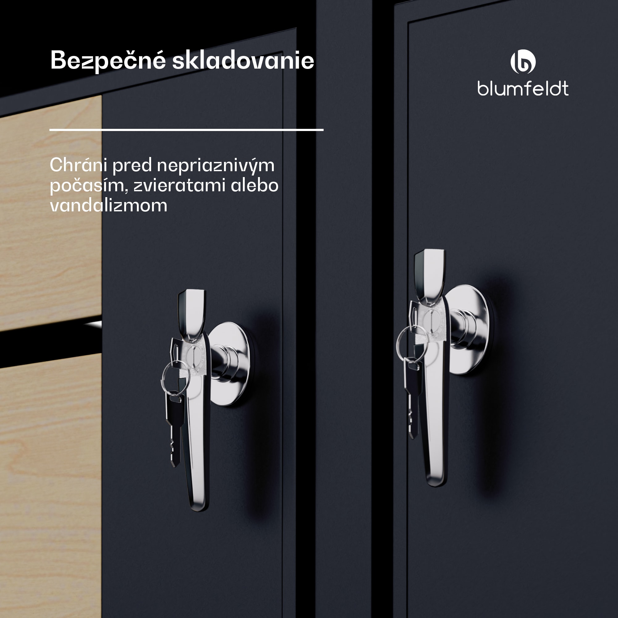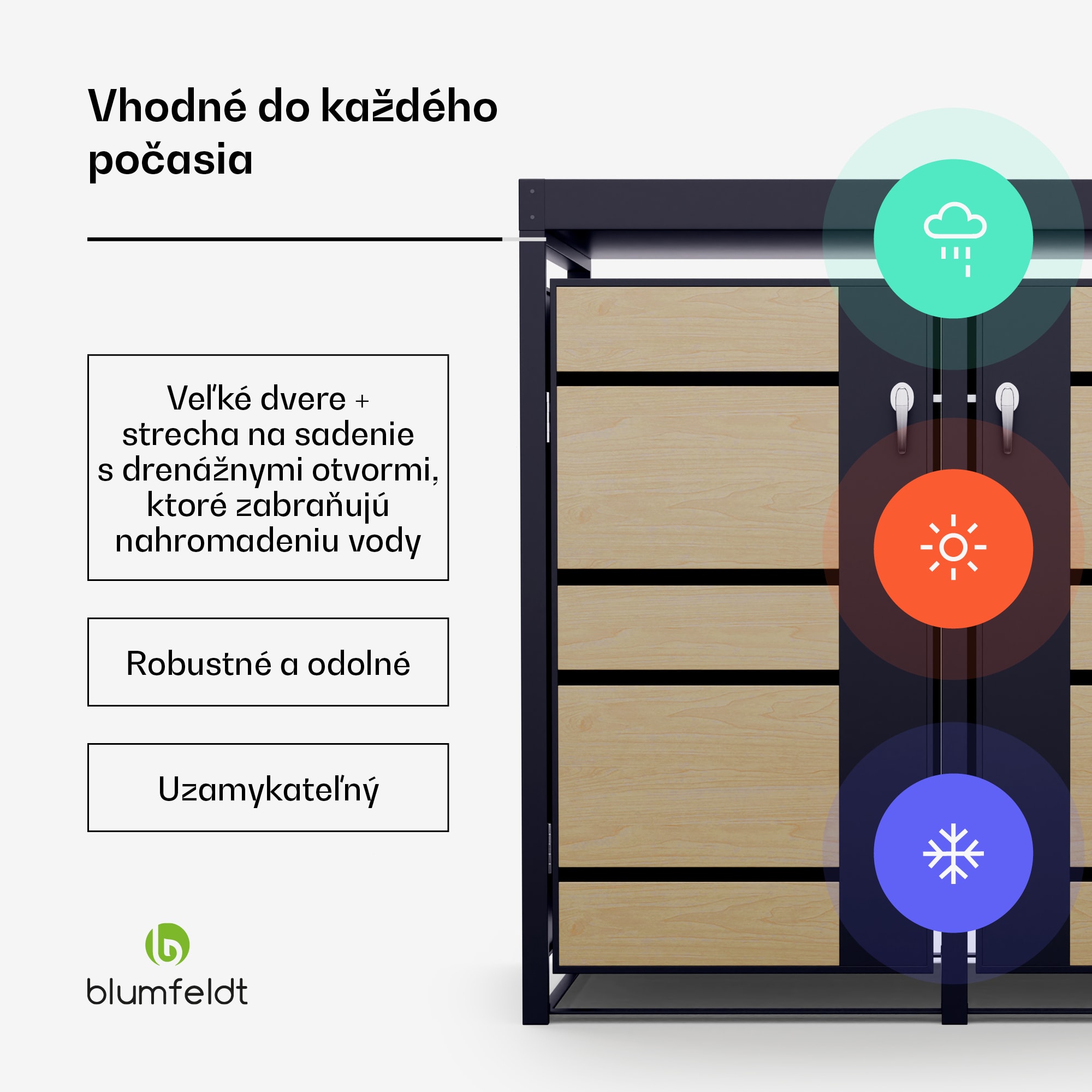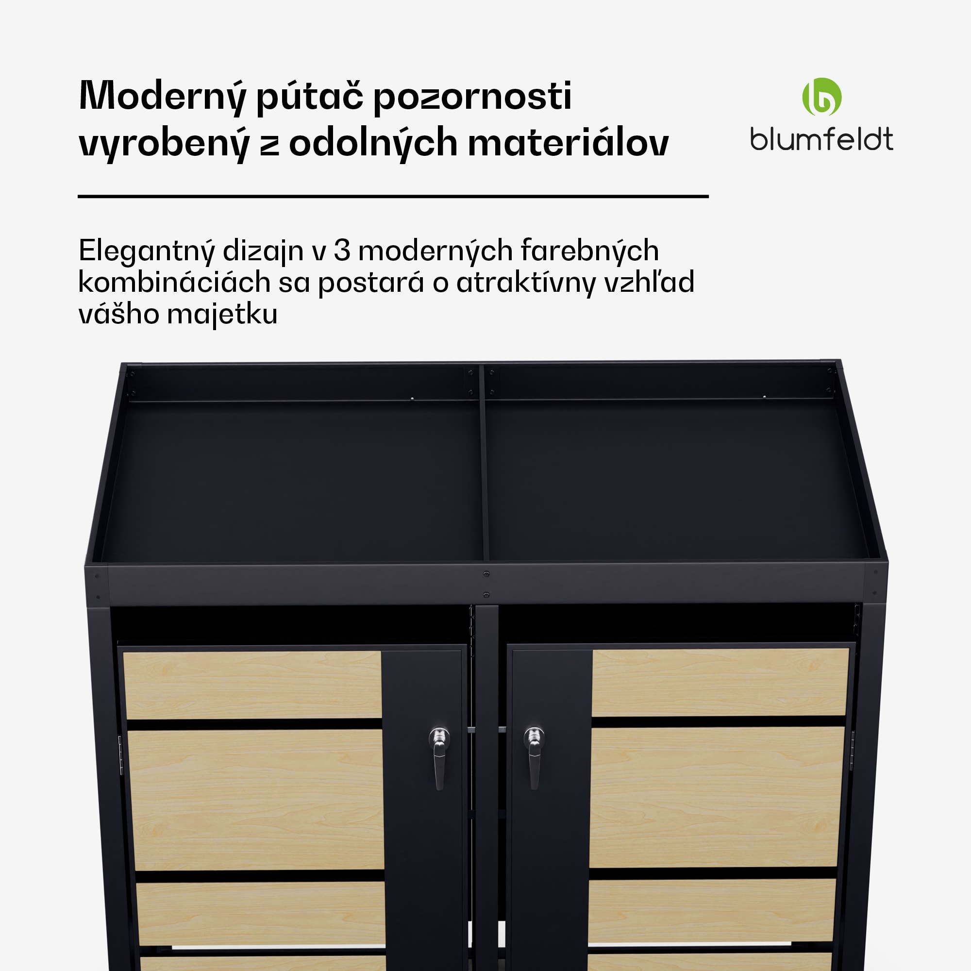 Box na odpadky Blumfeldt BinSafe je elegantným riešením na diskrétne ukrytie 2 odpadkových košov a zároveň vylepšenie vonkajšieho priestoru. Vďaka 2 uzamykateľným dverám je ľahko prístupný spredu. Okrem toho box na odpadky s výsadbovou strechou ponúka možnosť ozvláštniť úložný priestor zeleňou. Integrované debničky na rastliny majú odtokové otvory na odvádzanie prebytočnej vody. Moderný dizajn dodá vášmu vonkajšiemu priestoru atraktívny a moderný vzhľad. Box je vyrobený z pozinkovanej ocele odolnej voči poveternostným vplyvom, a preto je mimoriadne trvácny a odolný voči poveternostným vplyvom. Či už ide o 60-litrové, 120-litrové alebo 240-litrové koše, box na odpadky BlumfeldtBinSafe ponúka priestor pre všetky štandardné veľkosti. Vďaka dodaným zámkom s kľúčmi sú vaše koše v bezpečí. Vďaka svojej vysokokvalitnej konštrukcii a praktickým funkciám je box na odpadky Blumfeldt BinSafe ideálnou voľbou na prehľadné uloženie vašich odpadkových košov a dodanie štýlu vášmu vonkajšiemu priestoru.