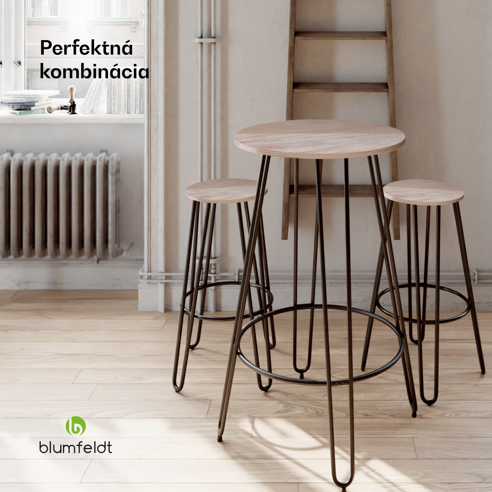 Keď vás bistro stôl blumfeldt Hamilton pozve na posedenie, do vášho domova vstúpi moderný industriálny štýl. Luxusný pôžitok s minimalistickou atmosférou – to sľubuje barový stôl blumfeldt Hamilton a vyťahuje z rukáva všetko: stolová doska s priemerom 60 cm je vyrobená z čisto lešteného pravého dreva, takže každý stôl je jedinečný. Zrnitosť a farebnosť vždy vyzdvihnú ich jedinečný charakter a dodajú každému prostrediu novú iskru. To je ešte viac umocnené robustným oceľovým rámom s krúžkom ako opierkou nôh. Či už ide o raňajky v kuchyni, spoločenské posedenie pri drinku v barovom kútiku alebo romantickú večeru pri sviečkach v jedálni: blumfeldt Hamilton bistro stôl vždy vytvorí tú správnu atmosféru.Mimoriadne praktické: objednajte si priamo zodpovedajúce stoličky bistro z radu Hamilton.
