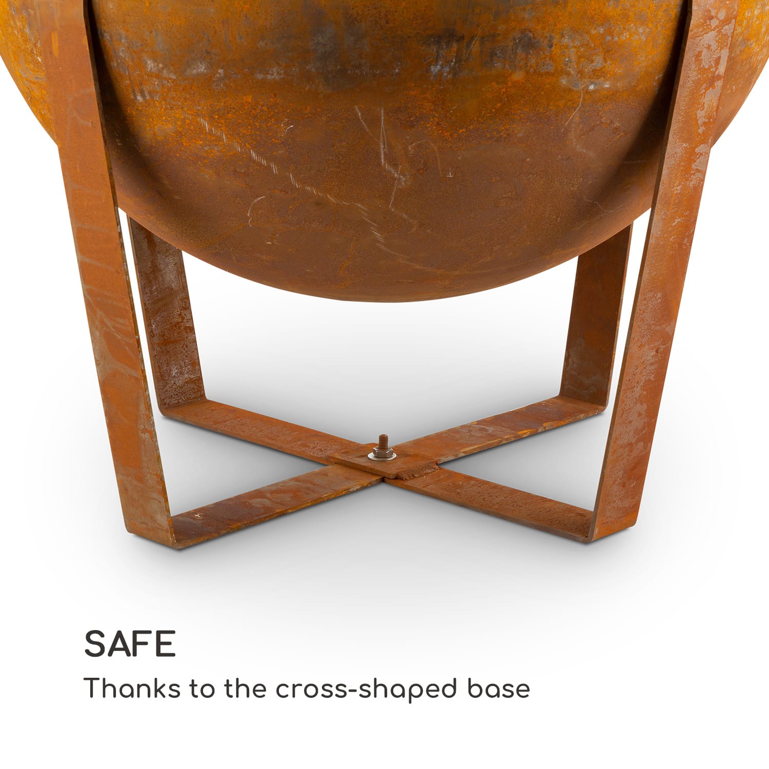 Ohnisko s grilom blumfeldt Fire Globe je kombinácia grilu a ohniska.Užívaj si večer v záhrade alebo na terase: s ohniskom a grilom blumfeldt Fire Globe vám urobí dva krát takú radosť. V ohnisku s priemerom 60 cm šíria drevené polená s plápolajúcimi plameňmi príjemné teplo a atmosféru táboráku. Pevný obal je vyrobený z 2,8 mm hrubej ocele – tak je robustný a chránený voči poveternostným vplyvom. Ale chutný začne byť, ak nasadíte na ohnisko Globe 59 cm širokú pochrómovanú grilovaciu mriežku. Mriežka je upevnená na troch oceľových lanách a je zavesená nad ohnisko. Pomocou ťažného lanka môžeš nastaviť výšku mriežky a tak prispôsobovať teplo pri príprave jedla. Okrem toho môžeš na pečiacom kruhu pripravovať ďalšie chutné grilované špeciality. Nožičky tvarované do kríža sa starajú o stabilné státie počas grilovania ale aj pri použití ako ohnisko. Fire Globe sa svojim industriálnym dizajnom v hrdzavom vzhľade perfektne hodí do každej záhrady alebo na terasu.Romantika, teplo a chutné jedlo na dvoch úrovniach: to je ohnisko s grilom blumfeldt Fire Globe.