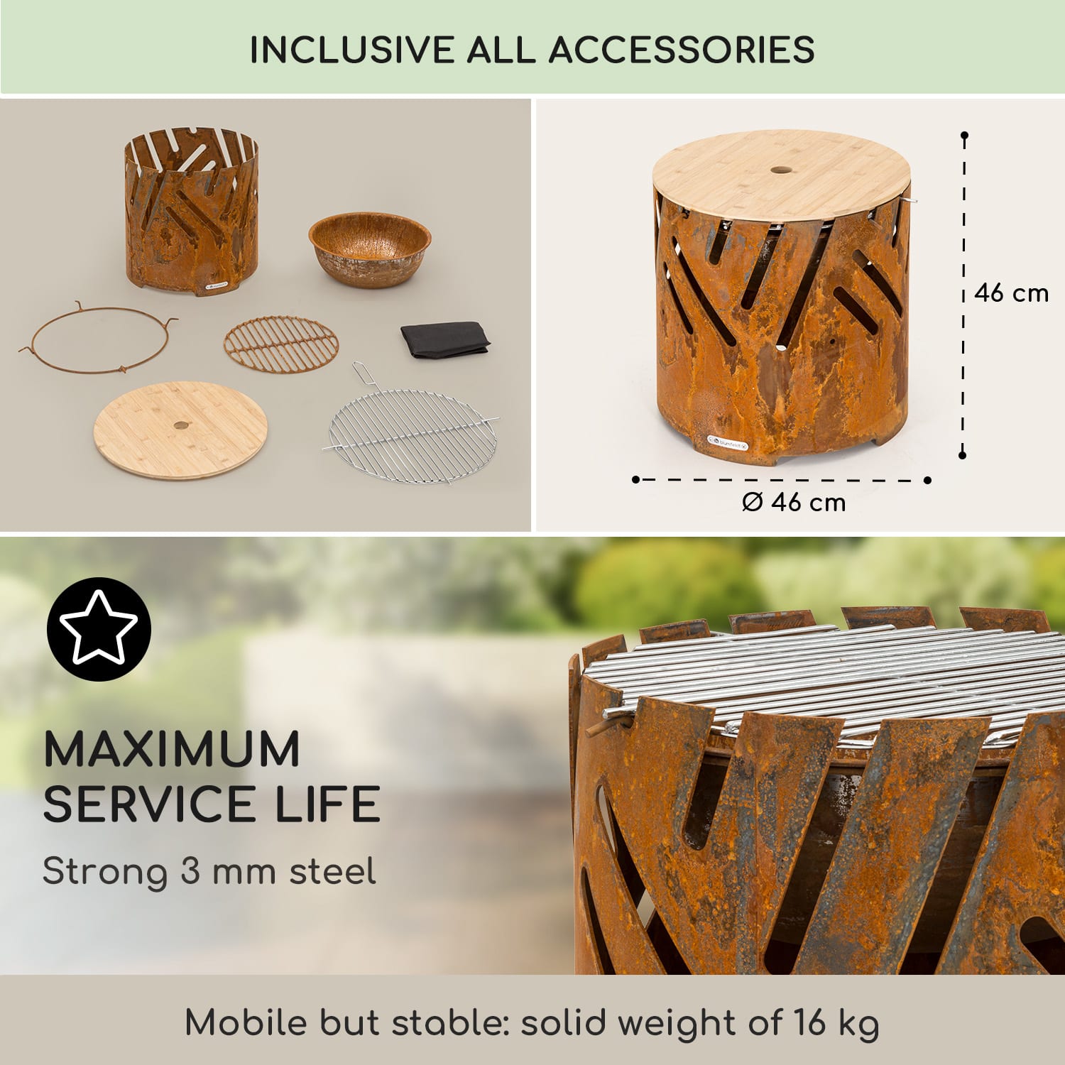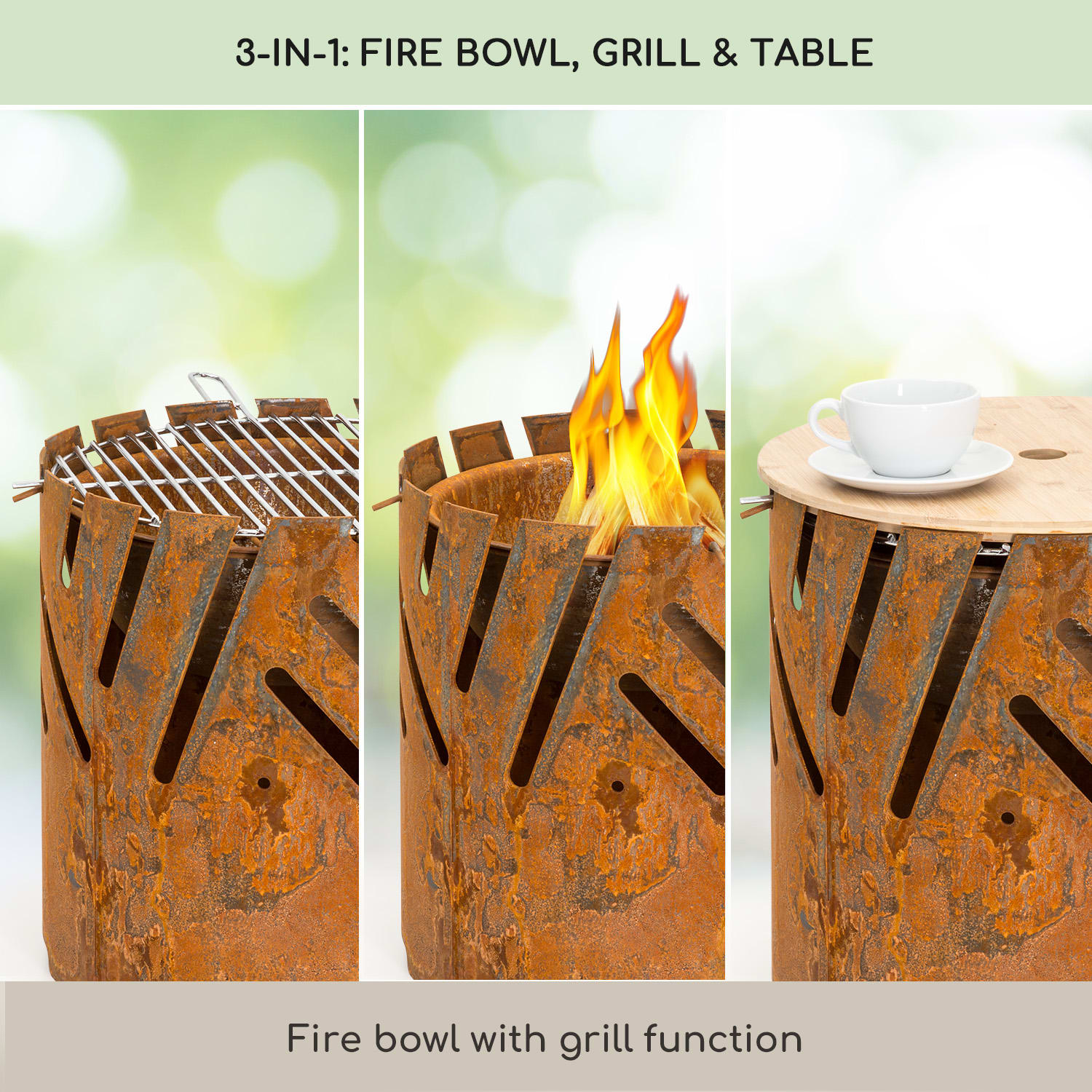 Blumfeldt Crown, ohnisko 3 v 1, Ø 46 cm, odolné voči vode a mrazu, grilovacia doska, grilovací rošt, bambusová doska – Kúpiť
