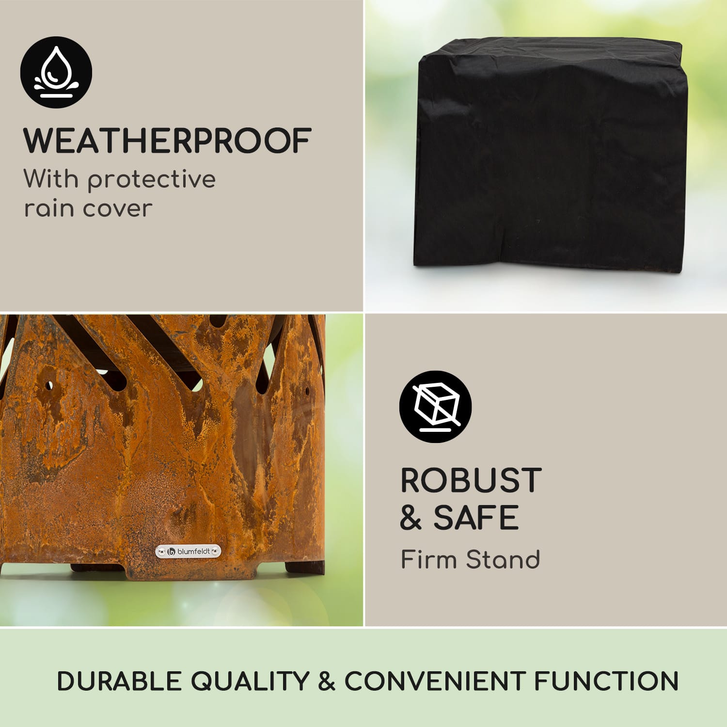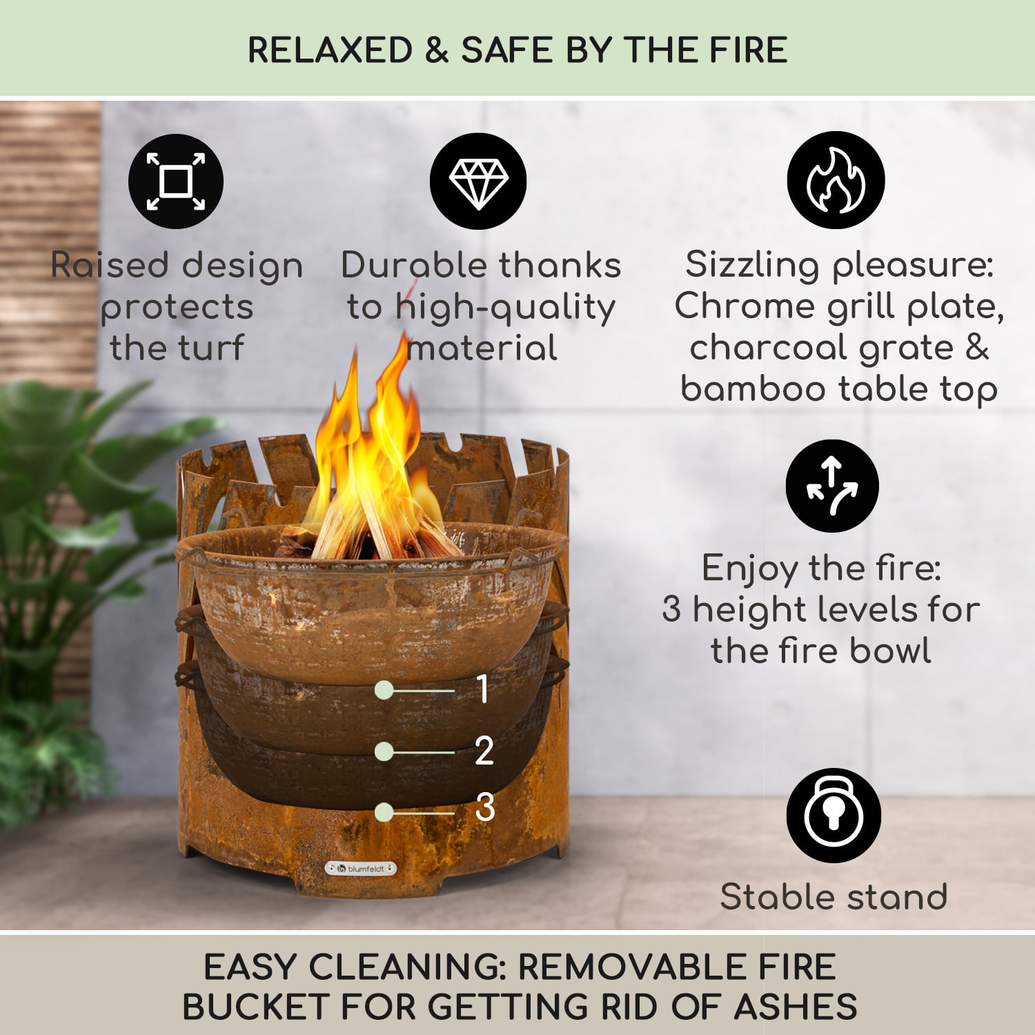 Vychutnajte si šťavnaté vyprážané pochúťky s rodinou a priateľmi s ohniskom BlumfeldtCrown s funkciou grilu a stola a zažite neporovnateľnú atmosféru otvoreného ohňa pod hviezdnou oblohou. Pohľadné ohnisko s priemerom 46 cm je celé vyrobené z ocele a pôsobí atmosferickým dojmom vďaka pruhovanému vzoru, ktorý necháva jasne vyniknúť svetlo plameňov. Konštrukcia je chránená pred vodou a mrazom a vďaka hrúbke materiálu 3 mm je aj pomerne ľahká. Umiestnením grilovacieho roštu na vrchnú časť sa ohnisko premení na gril pre chutné pochúťky ako sú grilované klobásky, steaky, zeleninové špízy alebo dokonca grilovaný syr. A keď sa ohnisko alebo gril nepoužívajú, môžete na ne jednoducho položiť okrúhlu bambusovú dosku a užívať si praktický záhradný stôl. Súčasťou dodávky je aj praktický rošt na drevené uhlie, pohrabáč a odolná ochrana proti vplyvom počasia, ktorá záhradné príslušenstvo 3 v 1 vždy ochráni pred vetrom a poveternostnými vplyvmi.Ohnisko s funkciou grilu a stola blumfeldt Crown: Útulná záhradná atmosféra a lahodný pôžitok z praskania grilu s výškovo nastaviteľným grilovacím roštom.