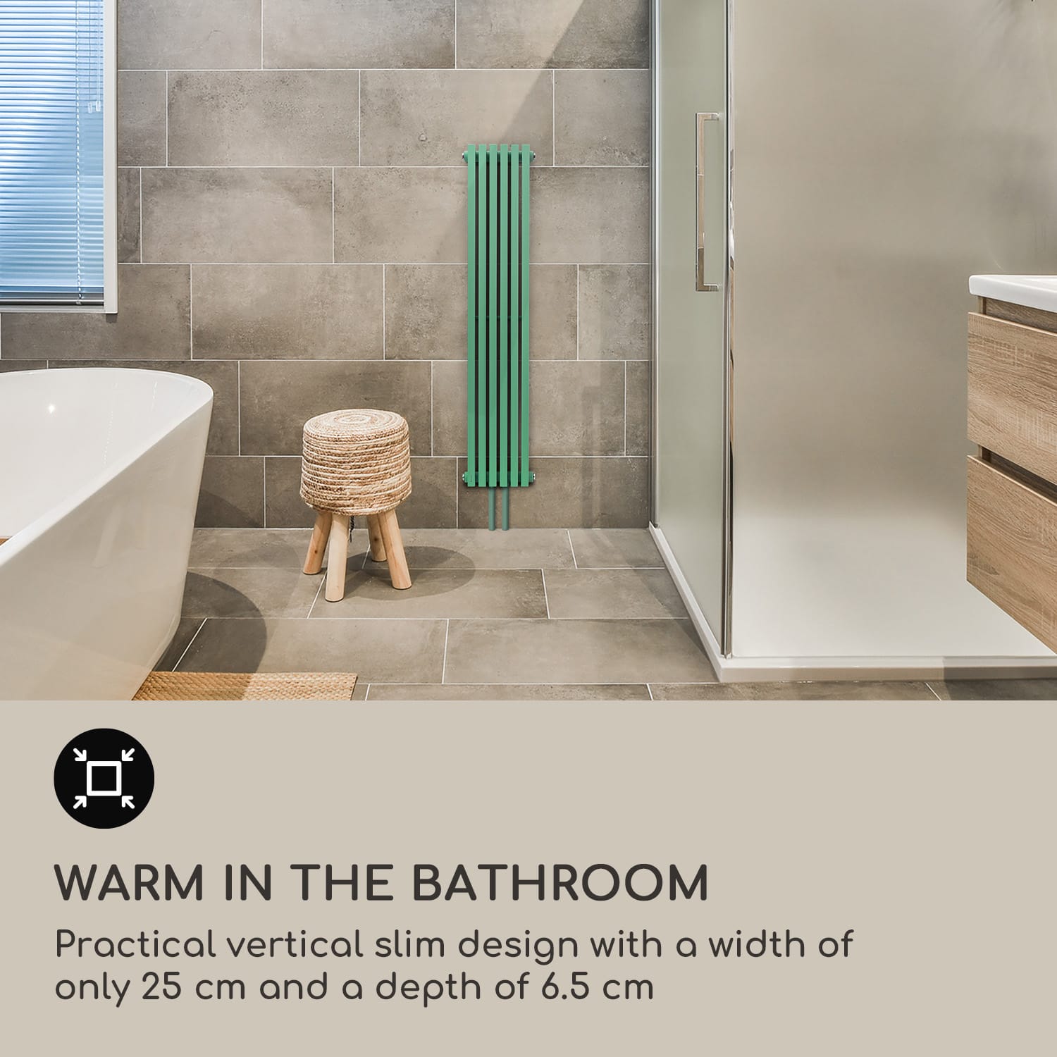 Útulné teplo pre domácnosť v modernom dizajne: radiátor Delgado 120 x 25 od Blumfeldt nielenže prináša do kúpeľne príjemnú teplotu, ale aj pekne vyzerá.Rúrkový radiátor Delgado 120 x 25 od Blumfeldt jednoducho integrujete do existujúceho teplovodného alebo diaľkového vykurovacieho systému a funguje aj s elektrickým ponorným ohrievačom alebo elektronickým termostatom. Poskytuje spoľahlivé a rovnomerné teplo v miestnostiach od 4 do 10 m². Pripojenie je veľmi jednoduché: konštrukcia 2 v 1 umožňuje pripojenie v strede aj na bočných rúrkach. Vďaka tomu dokáže Delgado optimálne reagovať na mnohé konštrukčné podmienky. Potrebné nástenné konzoly sú tiež priamo súčasťou balenia. Stabilný systém rúrok z práškovo lakovaného kovu optimálne vedie a rozvádza teplo až do 70 °C. Vďaka 6 vertikálnym vykurovacím trubiciam má tiež optimálne zväčšenú plochu a dosahuje tak tepelný výkon až 508 W.Vďaka špeciálnemu vertikálnemu dizajnu so šírkou 45 cm a hĺbkou 6,5 cm sa dokonale hodí do všetkých miestností s obmedzeným priestorom alebo bez neho. Vďaka medzerám medzi 6 rúrkami sa radiátor veľmi jednoducho čistí. Útulné teplo priamo po sprche alebo kúpeli s radiátorom Delgado 120 x 25 od Blumfeldt – štýlový zážitok.