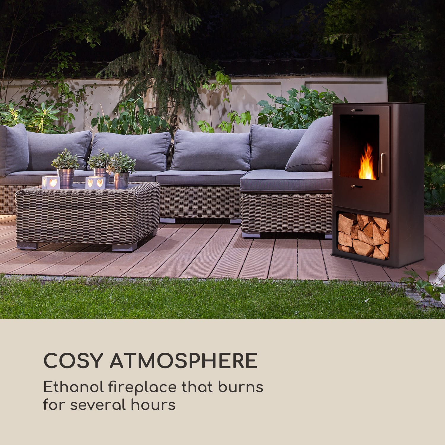 Oheň a plamene: etanolový krb blumfeldt Fiamme Cantal vyčarí vo Vašej obývačke prekrásnu atmosféru izby z krbom bez nepríjemných zápachov. Fiamme Cantal je poháňaný na bio etanol z udržateľných zdrojov. Nerezový horák pojme 1,2 litra horľaviny a postará sa tak o hru plameňov trvajúcu až 6 hodín. Jeho klasický dizajn je založený na interiérovom krbe vrátane dekoratívnej priehradky na polená v spodnej časti. Ale Fiamme Cantal dobre obstojí aj pri používaní vonku. Jeho robustné telo z oceľového plechu ako aj dvierka s okienkom z tvrdeného skla z neho robia ideálny exteriérový krb. Pri skladovaní ho priložená ochrana pred dažďom chráni pred vetrom a počasím. Na bezpečné zahasenie plameňa je v balení praktický hasiaci hák.Príjemné hodiny pred krbom: s etanolovým krbom blumeldt Fiamme Cantal sa tento sen rýchlo stane skutočnosťou.