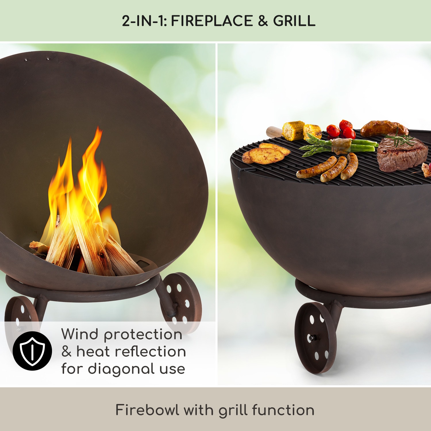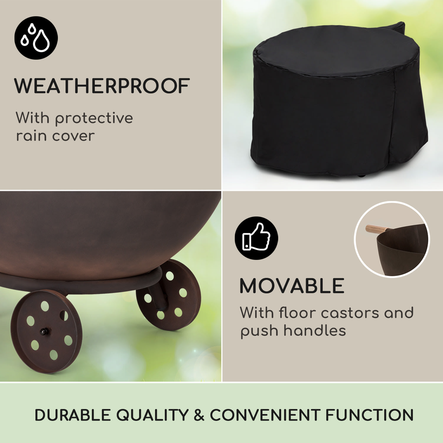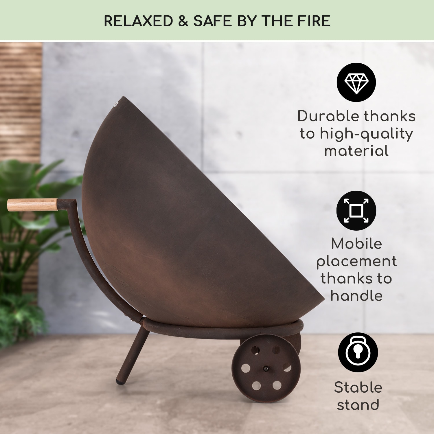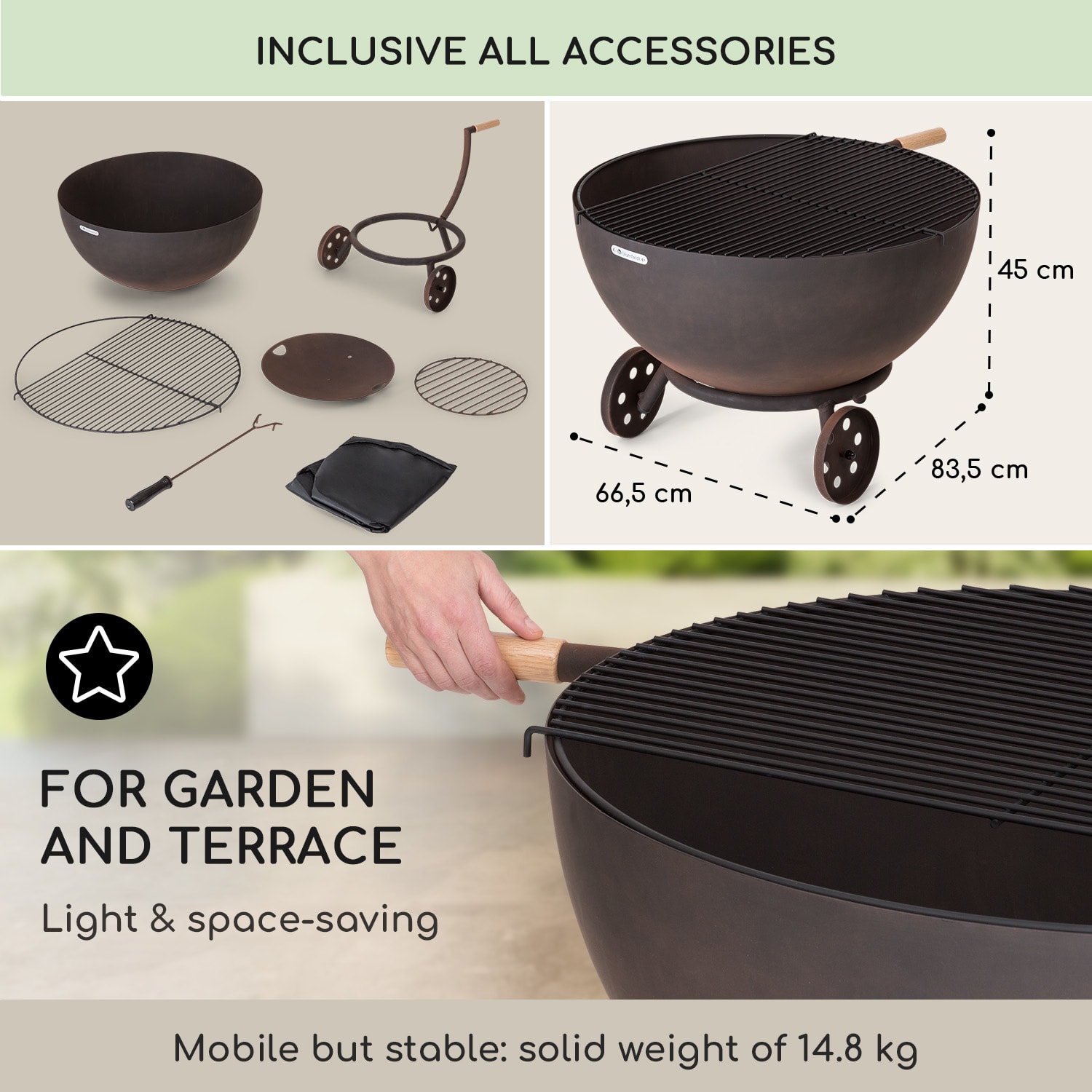 Misa na oheň blumfeldt Fireball Egon prináša do vášho domova skutočnú romantiku táboráku – dokonca plne mobilnú vďaka šikovnej konštrukcii na kolieskach.Či už si chcete len vychutnať romantickú hru plameňov vo svojej novej blumfeldt Fireball Egon ohňovej mise na terase, alebo ohromiť priateľov a rodinu svojimi grilovacími schopnosťami, môžete tu urobiť oboje. Dodávaný grilovací rošt umožňuje nielen opekanie a škvarenie na otvorenom ohni, ale má aj priehlbinu, vďaka ktorej je pridávanie dreveného uhlia, grilovacích brikiet alebo polien hračkou. A vďaka svojmu ikonickému dizajnu v oblom tvare prináša ohnisko do vášho domova nielen relax, pohodu a nádych romantiky, ale je aj plne mobilné. Misa a podstavec sú kvalitné, robustné a dobre vyrobené. Kolieska a podstavec nielenže zabraňujú prevráteniu misy, ale vďaka možnosti sklápania ju aj ľahko čistia. Priložený kryt proti dažďu chráni vašu novú obľúbenú misu na oheň pred vetrom a nepriaznivým počasím.