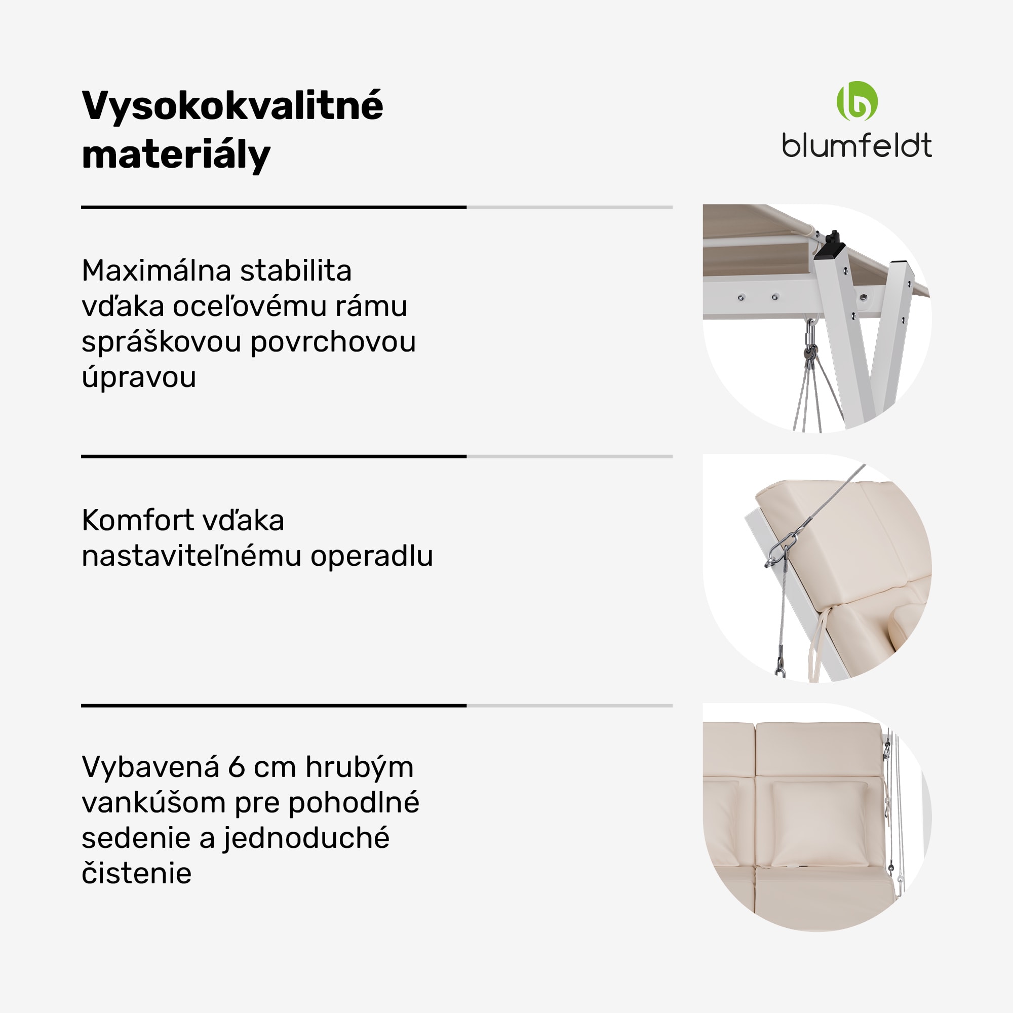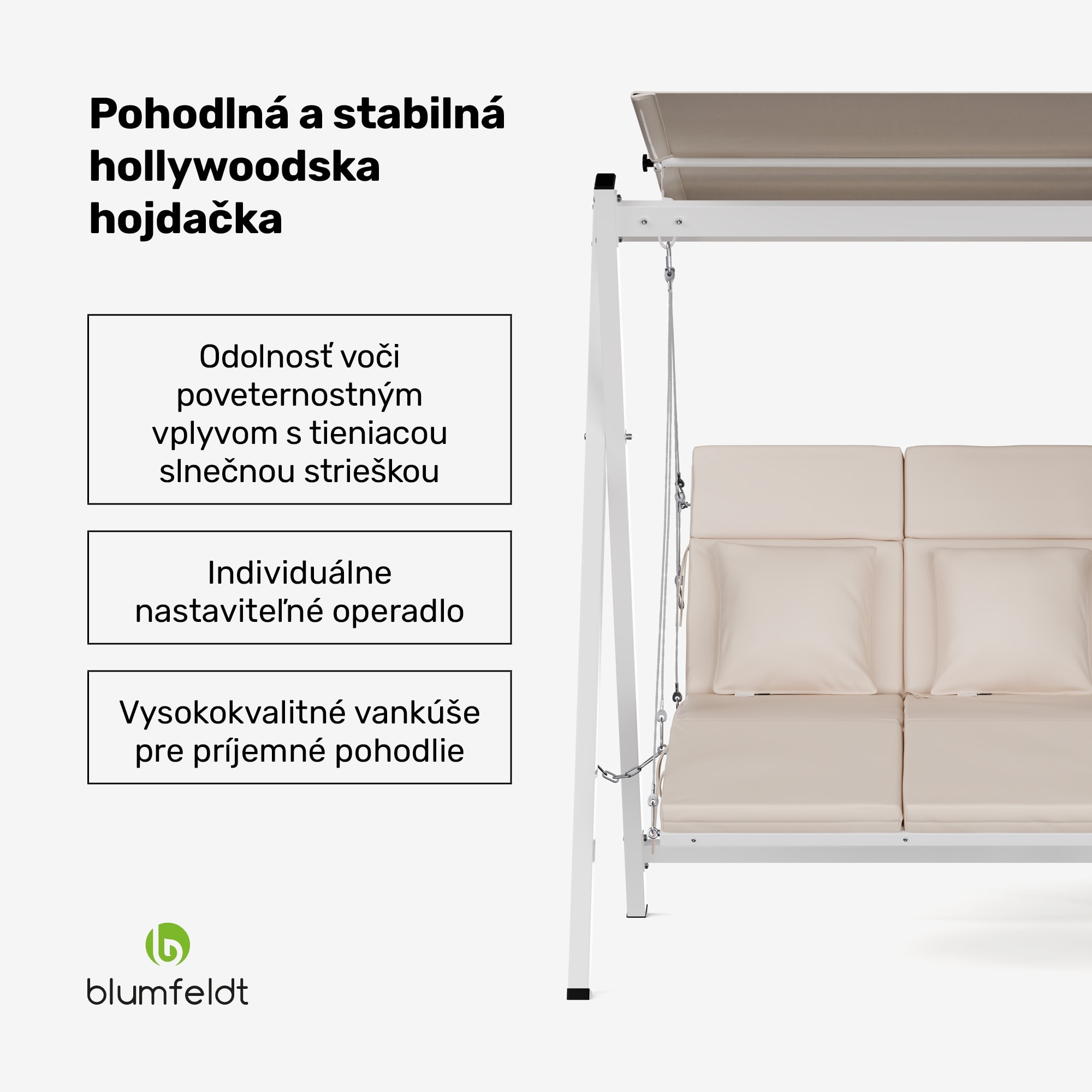 Hollywoodska hojdačka blumfeldt FlexiSwing vás pozýva na hodiny oddychu vonku, ponúka individuálny komfort a kvalitnú konštrukciu. Oceľový rám s práškovou povrchovou úpravou je pevný a stabilný, zatiaľ čo kvalitné vankúše zaisťujú príjemné pohodlie.Hollywoodska hojdačka blumfeldt FlexiSwing ponúka priestor pre dve osoby – voliteľne je k dispozícii aj ako 3- alebo 4-miestna. Je vybavená 6 cm hrubými vankúšmi, zaisťuje maximálne pohodlie a odolá záťaži až 160 kg.Nastaviteľné operadlo s dvoma polohami si môžete prispôsobiť pre ešte väčšie pohodlie. Optimálnu ochranu pred slnkom poskytuje aj nastaviteľná slnečná strieška. Táto hollywoodska hojdačka je ideálna na príjemné chvíle osamote alebo vo dvojici, ako aj na spoločenské stretnutia s rodinou a priateľmi v záhrade, na terase alebo na balkóne.Celkovo hollywoodska hojdačka blumfeldt FlexiSwing ponúka luxusný a pohodlný vonkajší zážitok pre každého, kto chce relaxovať na čerstvom vzduchu.