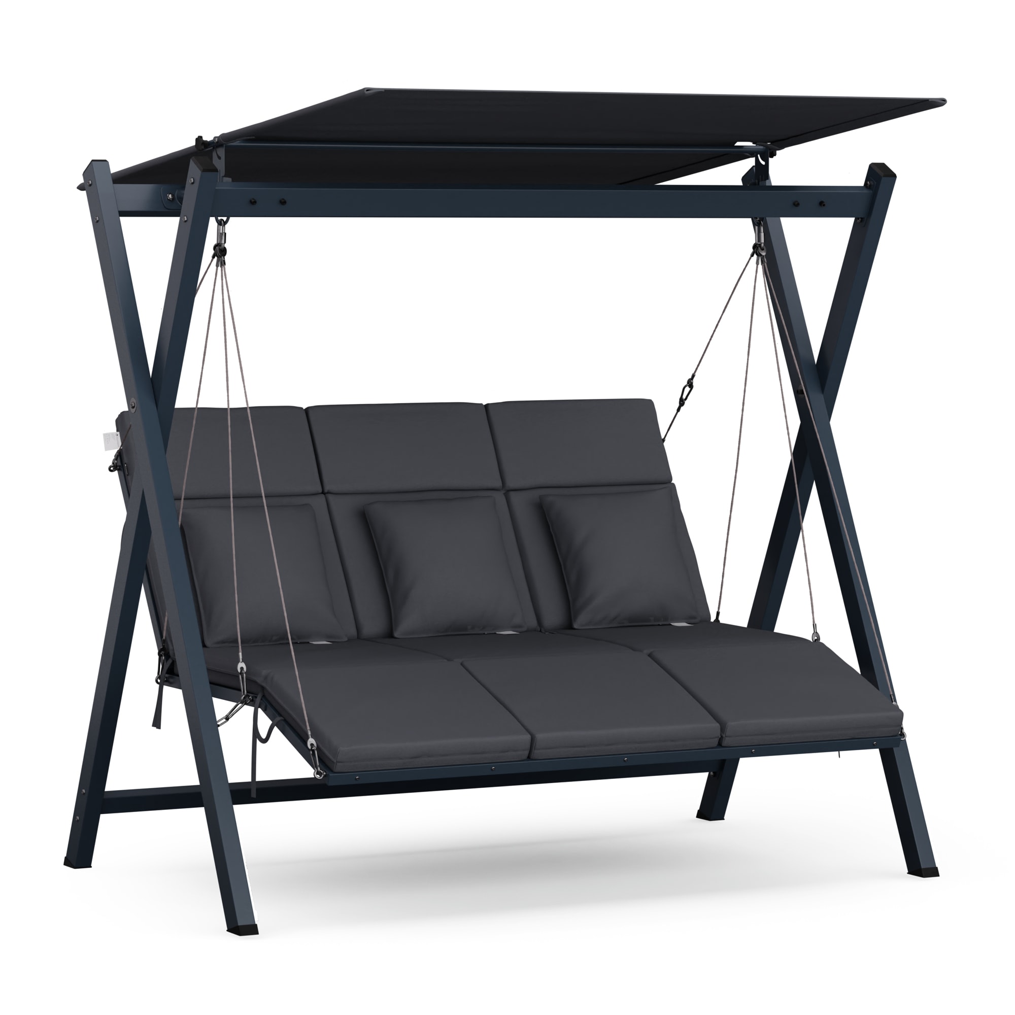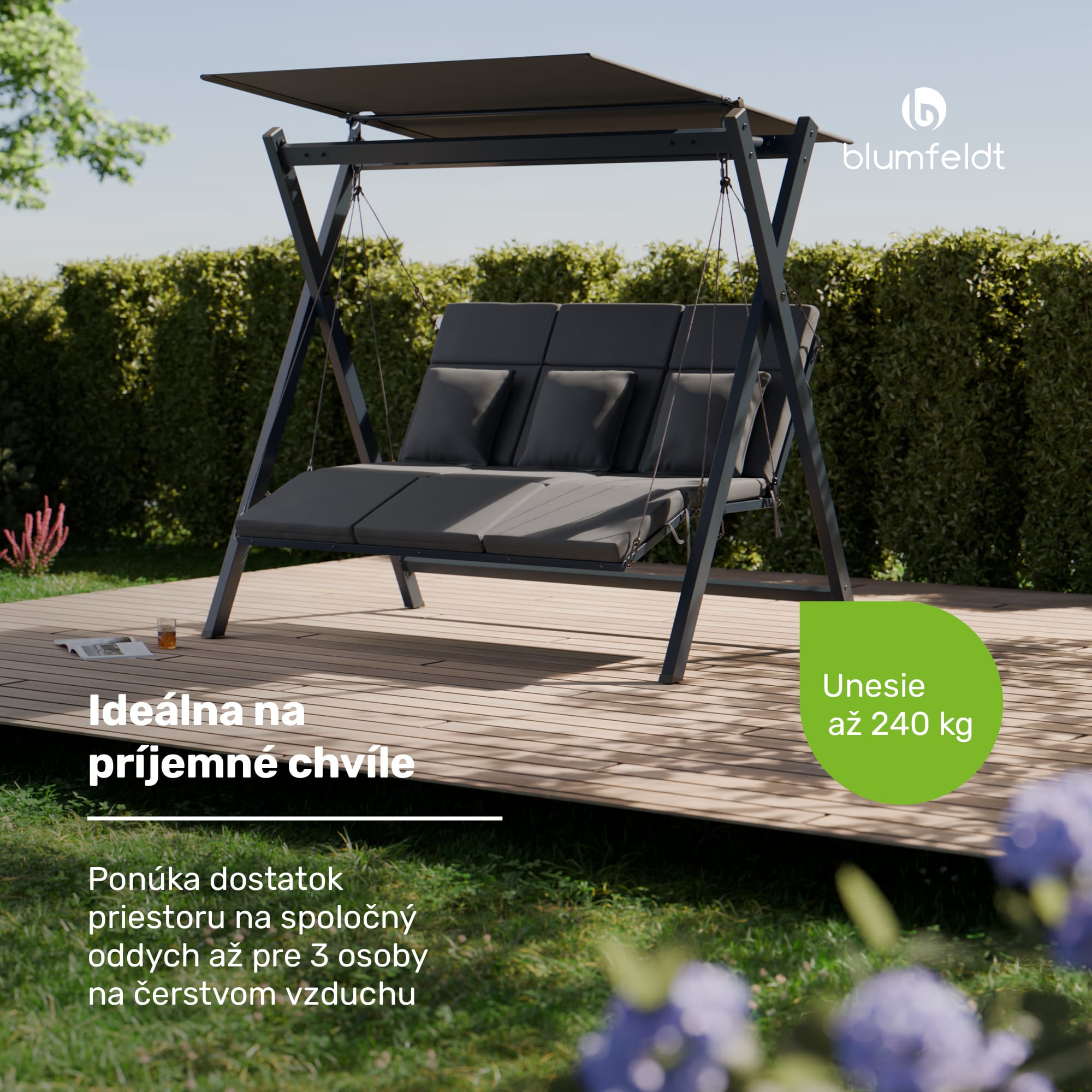 Hollywoodska hojdačka blumfeldt FlexiSwing vás pozýva na hodiny oddychu vonku, ponúka individuálny komfort a kvalitnú konštrukciu. Oceľový rám s práškovou povrchovou úpravou je pevný a stabilný, zatiaľ čo kvalitné vankúše zaisťujú príjemné pohodlie. Hollywoodska hojdačka blumfeldt FlexiSwing ponúka priestor pre tri osoby – voliteľne je k dispozícii aj ako 2- alebo 4-miestna… Je vybavená vankúšmi s hrúbkou 6 cm, ktoré zaisťujú maximálne pohodlie a vydržia zaťaženie až 240 kg.Nastaviteľné operadlo s dvoma polohami si môžete prispôsobiť pre ešte väčšie pohodlie. Optimálnu ochranu pred slnkom poskytuje aj nastaviteľná slnečná strieška. Táto záhradná hojdačka kovová je ideálna na príjemné chvíle osamote alebo vo dvojici, ako aj na spoločenské stretnutia s rodinou a priateľmi v záhrade, na terase alebo na balkóne.Celkovo hollywoodska hojdačka blumfeldt FlexiSwing ponúka luxusný a pohodlný vonkajší zážitok pre každého, kto chce relaxovať na čerstvom vzduchu.