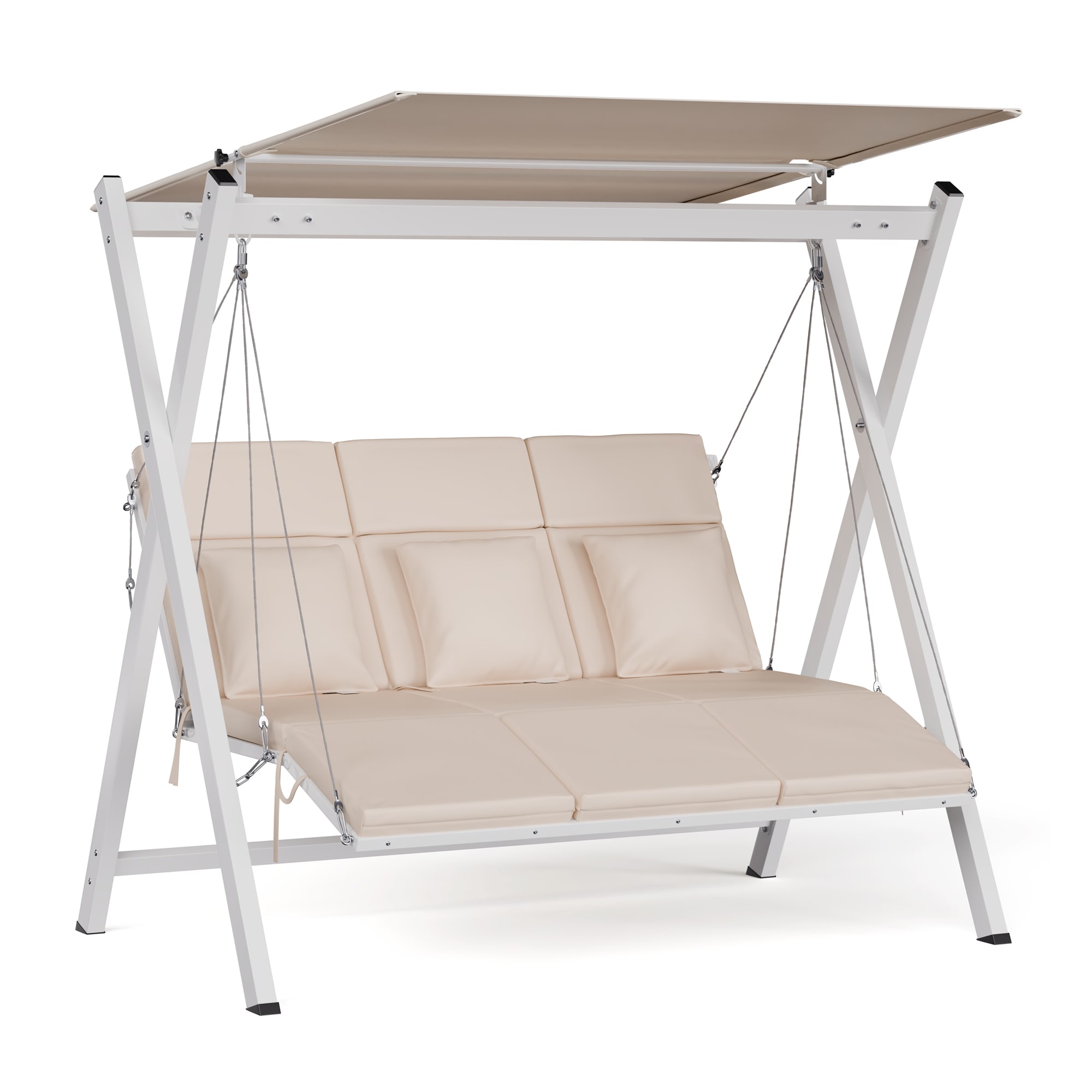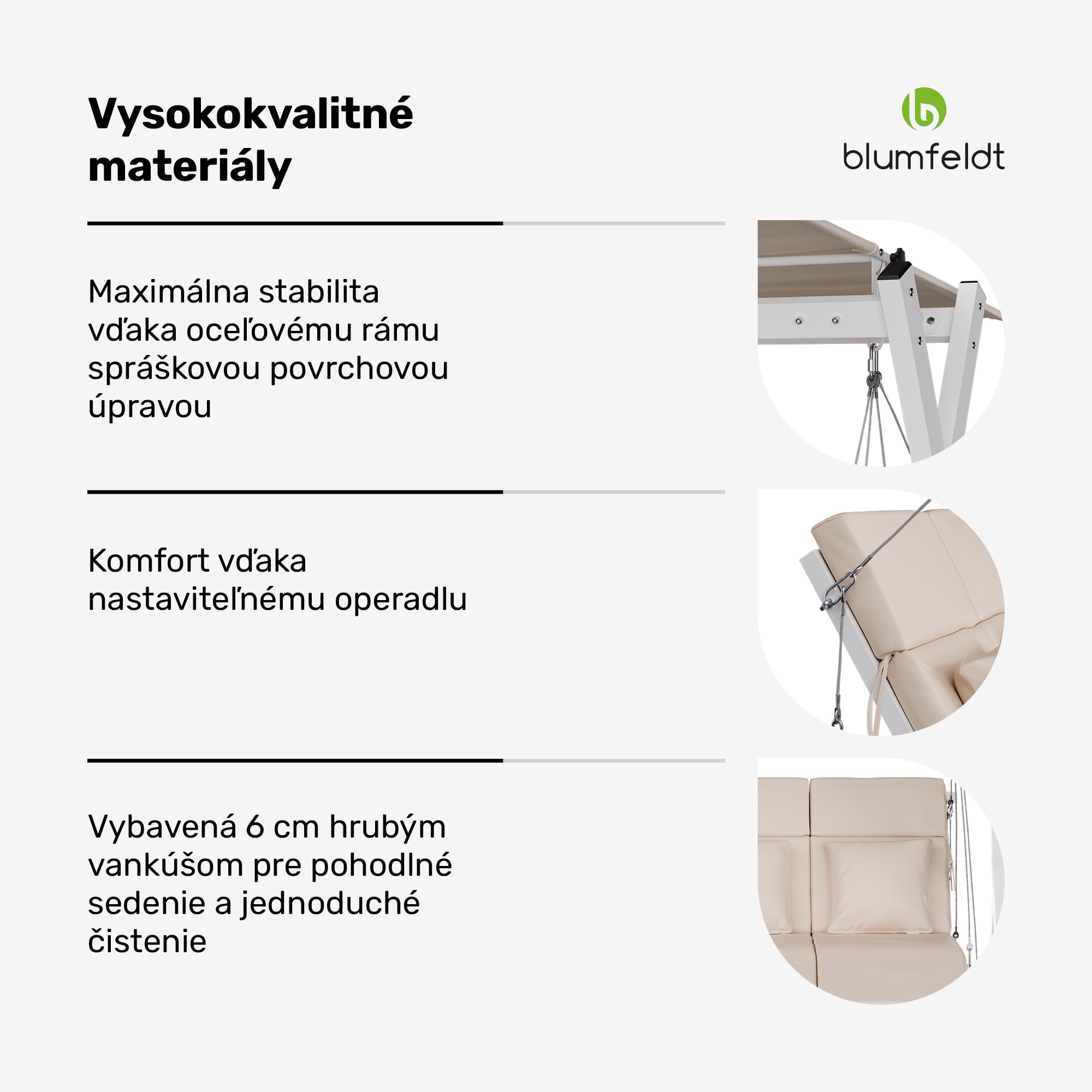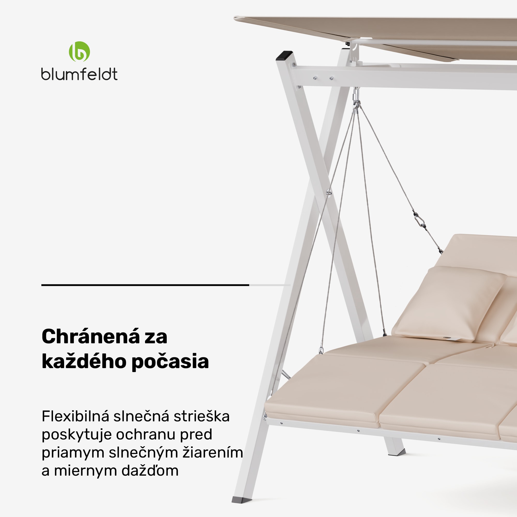 Hollywoodska hojdačka blumfeldt FlexiSwing vás pozýva na hodiny oddychu vonku, ponúka individuálny komfort a kvalitnú konštrukciu. Oceľový rám s práškovou povrchovou úpravou je pevný a stabilný, zatiaľ čo kvalitné vankúše zaisťujú príjemné pohodlie.Hollywoodska hojdačka blumfeldt FlexiSwing ponúka priestor pre tri osoby – voliteľne je k dispozícii aj ako 2- alebo 4-miestna. Je vybavená vankúšmi s hrúbkou 6 cm, ktoré zaisťujú maximálne pohodlie a vydržia zaťaženie až 240 kg.Nastaviteľné operadlo s dvoma polohami si môžete prispôsobiť pre ešte väčšie pohodlie. Optimálnu ochranu pred slnkom poskytuje aj nastaviteľná slnečná strieška. Táto hollywoodska hojdačka je ideálna na príjemné chvíle osamote alebo vo dvojici, ako aj na spoločenské stretnutia s rodinou a priateľmi v záhrade, na terase alebo na balkóne.Celkovo hollywoodska hojdačka blumfeldt FlexiSwing ponúka luxusný a pohodlný vonkajší zážitok pre každého, kto chce relaxovať na čerstvom vzduchu.