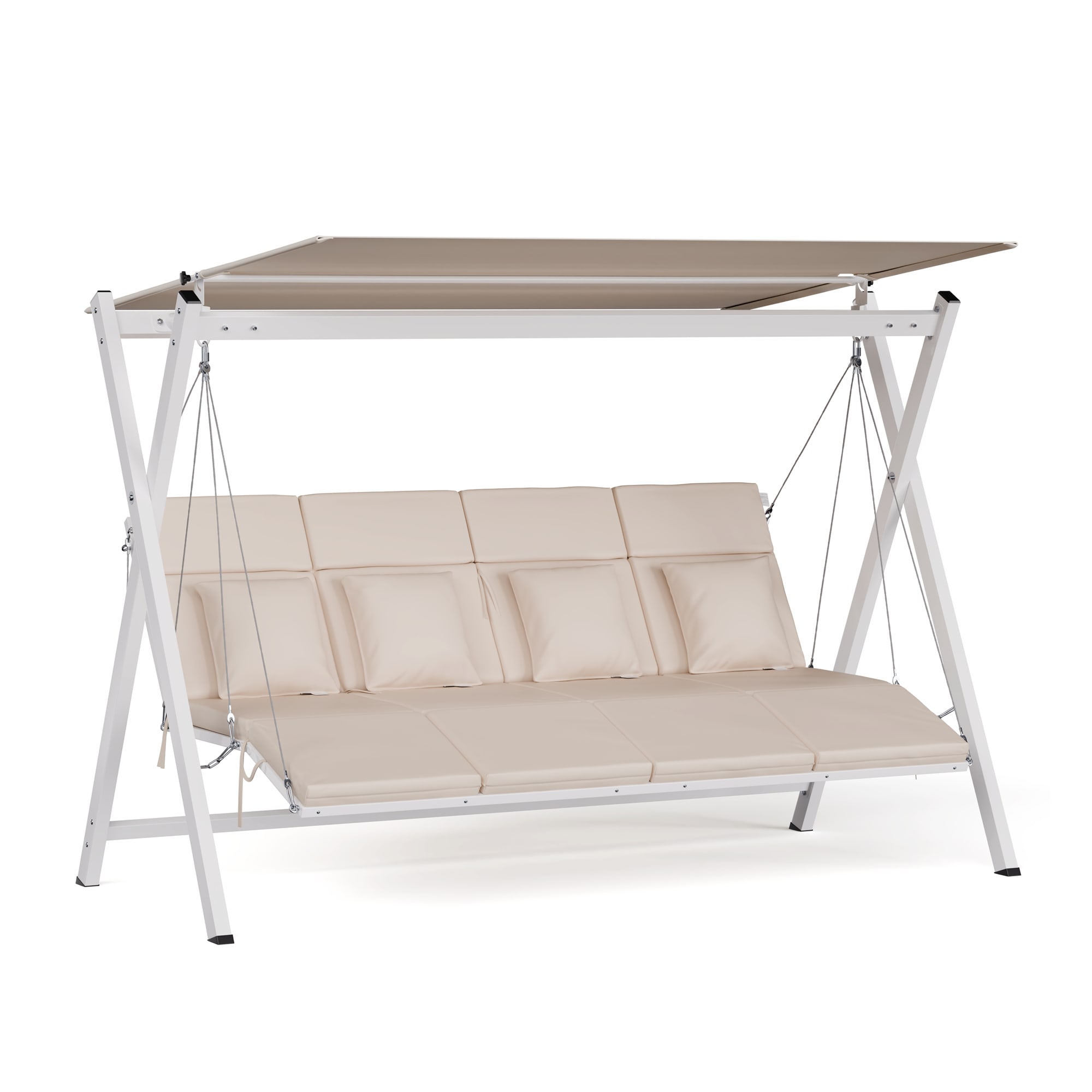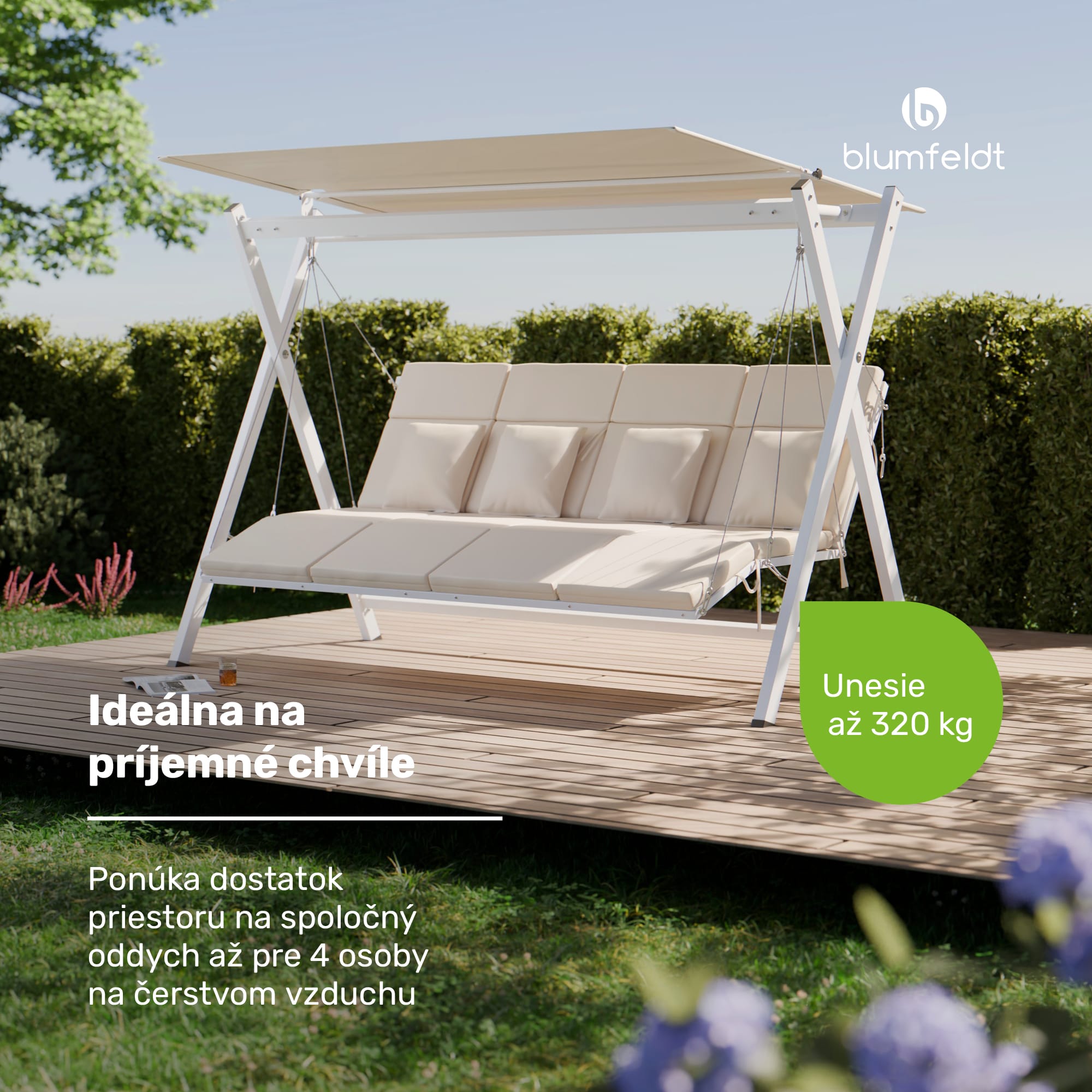 Hollywoodska hojdačka blumfeldt FlexiSwing vás pozýva na hodiny oddychu vonku, ponúka individuálny komfort a kvalitnú konštrukciu. Oceľový rám s práškovou povrchovou úpravou je pevný a stabilný, zatiaľ čo kvalitné vankúše zaisťujú príjemné pohodlie.Hollywoodska hojdačka blumfeldt FlexiSwing ponúka priestor pre štyri osoby – voliteľne je k dispozícii aj ako 2- alebo 3-miestna. Je vybavená vankúšmi s hrúbkou 6 cm, ktoré zaisťujú maximálne pohodlie a vydržia zaťaženie až 320 kg.Nastaviteľné operadlo s dvoma polohami si môžete prispôsobiť pre ešte väčšie pohodlie. Optimálnu ochranu pred slnkom poskytuje aj nastaviteľná slnečná strieška. Táto hollywoodska hojdačka je ideálna na príjemné chvíle osamote alebo vo dvojici, ako aj na spoločenské stretnutia s rodinou a priateľmi v záhrade, na terase alebo na balkóne.Celkovo hollywoodska hojdačka blumfeldt FlexiSwing ponúka luxusný a pohodlný vonkajší zážitok pre každého, kto chce relaxovať na čerstvom vzduchu.