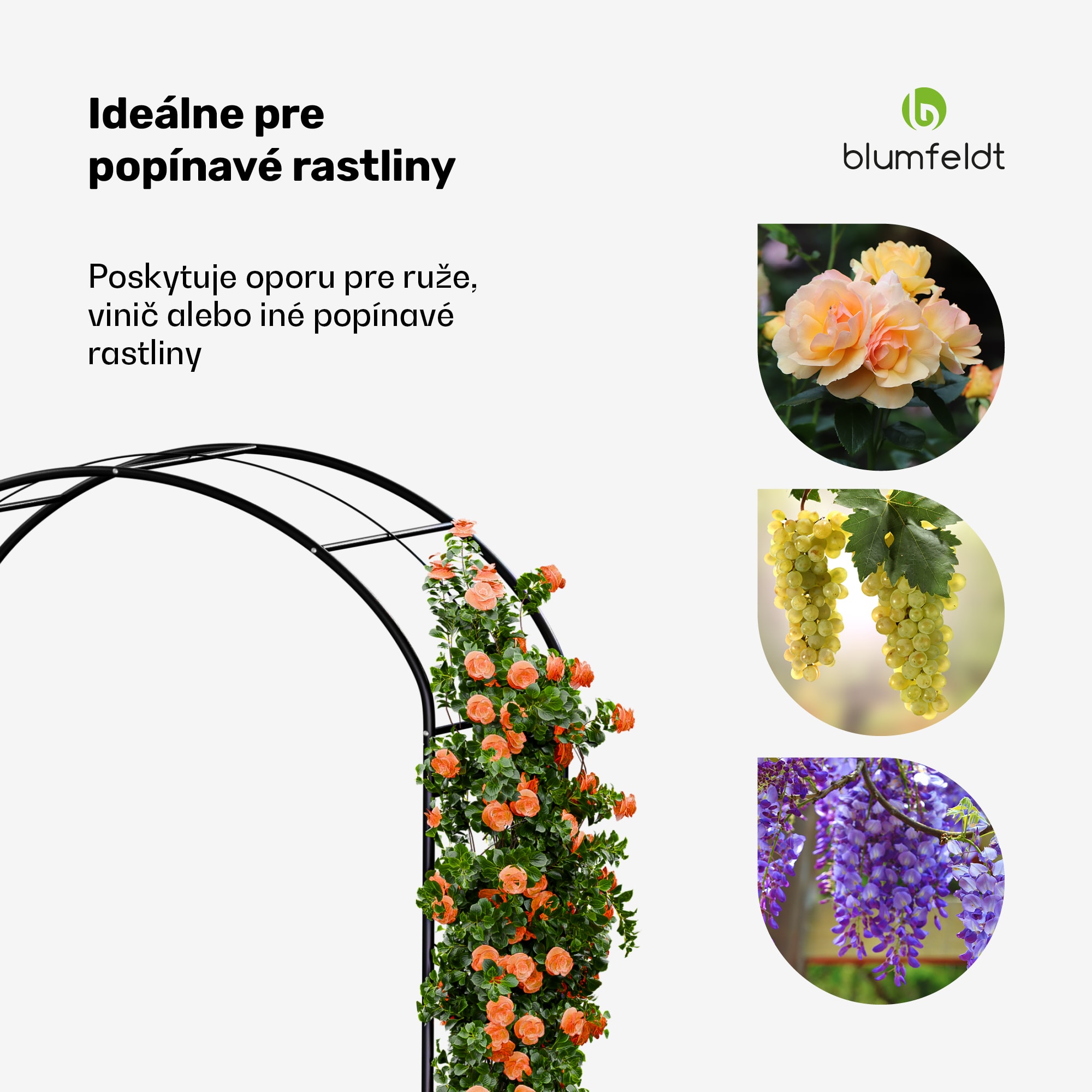 Ružový oblúk Blumfeldt FloraBelle Arch kombinuje štýlovú eleganciu s robustnou konštrukciou. Jeho jedinečné bočné panely s motívom listov z neho robia ozdobu každej záhradnej krajiny, zatiaľ čo oceľový rám s práškovou povrchovou úpravou zaručuje odolnosť.