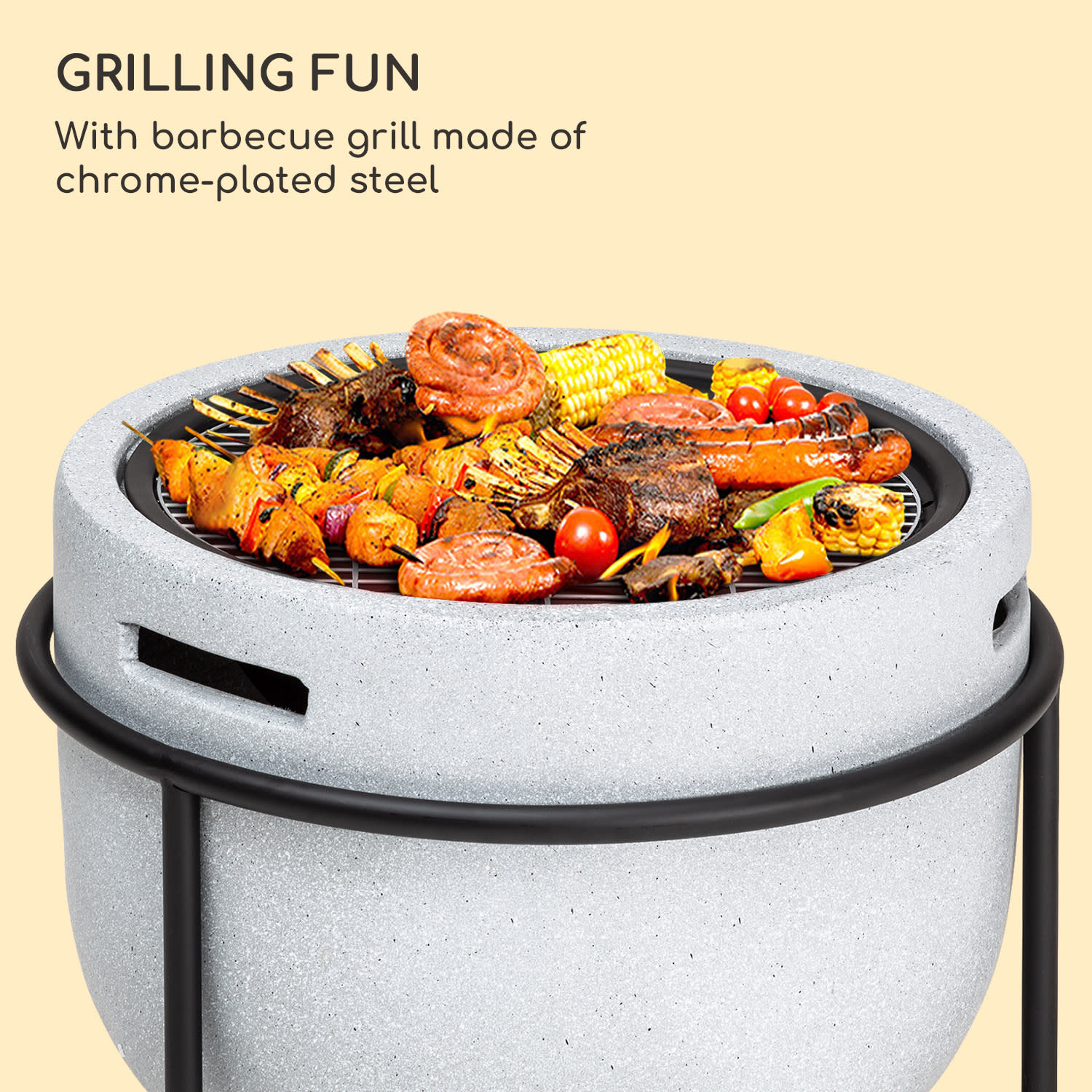 Oheň pod hviezdnou oblohou a pohodlné grilovanie: vychutnajte si neopakovateľnú atmosféru otvoreného ohňa a šťavnaté upečené pochúťky v spoločnosti rodiny a priateľov s ohniskom a grilom v jednom Grail od blumfeldt.Pútavé ohnisko je vyrobené z robustného a ľahkého MGO (Magnesium Fiberclay) a kvalitného oceľového plášťa. Okrúhly moderný tvar je skutočnou pastvou pre oči a ideálne sa hodí do každej záhrady. Keď na vrch položíte pochrómovaný oceľový grilovací rošt, pohoda plynúca z plápolajúcich plameňov sa rázom zmení na prskajúce chute grilovaných klobás, steakov, zeleninových špízov alebo dokonca grilovaného syra. Súčasťou balenia je aj praktický ochranný kryt proti iskrám, ktorý chráni všetky okolostojace osoby a okolie pred nekontrolovaným odletom iskier. Vďaka dvom bočným držadlám na prenášanie možno ohnisko s grilom Grail od blumfeldt kedykoľvek ľahko premiestniť.