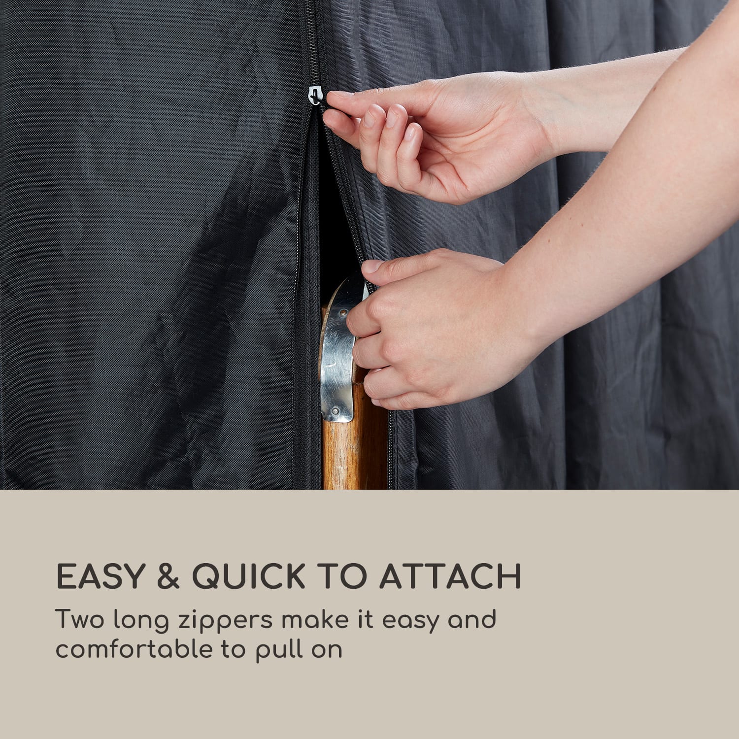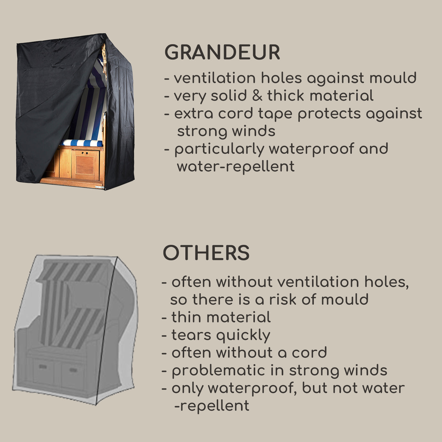 S ochranným plášťom na plážové koše od blumfeldt môžete predĺžiť krásu a životnosť Vášho koša o niekoľko rokov. Je vyrobený so špeciálneho, extra hustého polyestru, ktorý sa teší veľkej odolnosti proti poveternostným podmienkam a dlhej životnosti. Takto neprenikne ani UV žiarenie a vietor, dážď, sneh alebo ľad nemajú žiadnu šancu, aby poškodili Váš kôš. Aj znečistenie životným prostredím je vďaka krytu na kôš minimalizované. Tvorba plesní vylúčená: ochranný kryt má ventilačné otvory, ktoré sa starajú o to, aby bol Váš kôš pevne zabalený, ale napriek tomu priedušný.Kvalitný poťah bezpečne a pevne pripevníte na plážové kreslo pomocou zipsov a utiahnete spodnou šnúrkou.Odolný prémiový ochranný plášť presviedča kvalitou od blumfeldt a chráni Váš plážový kôš pred divokou pieskovou búrkou!