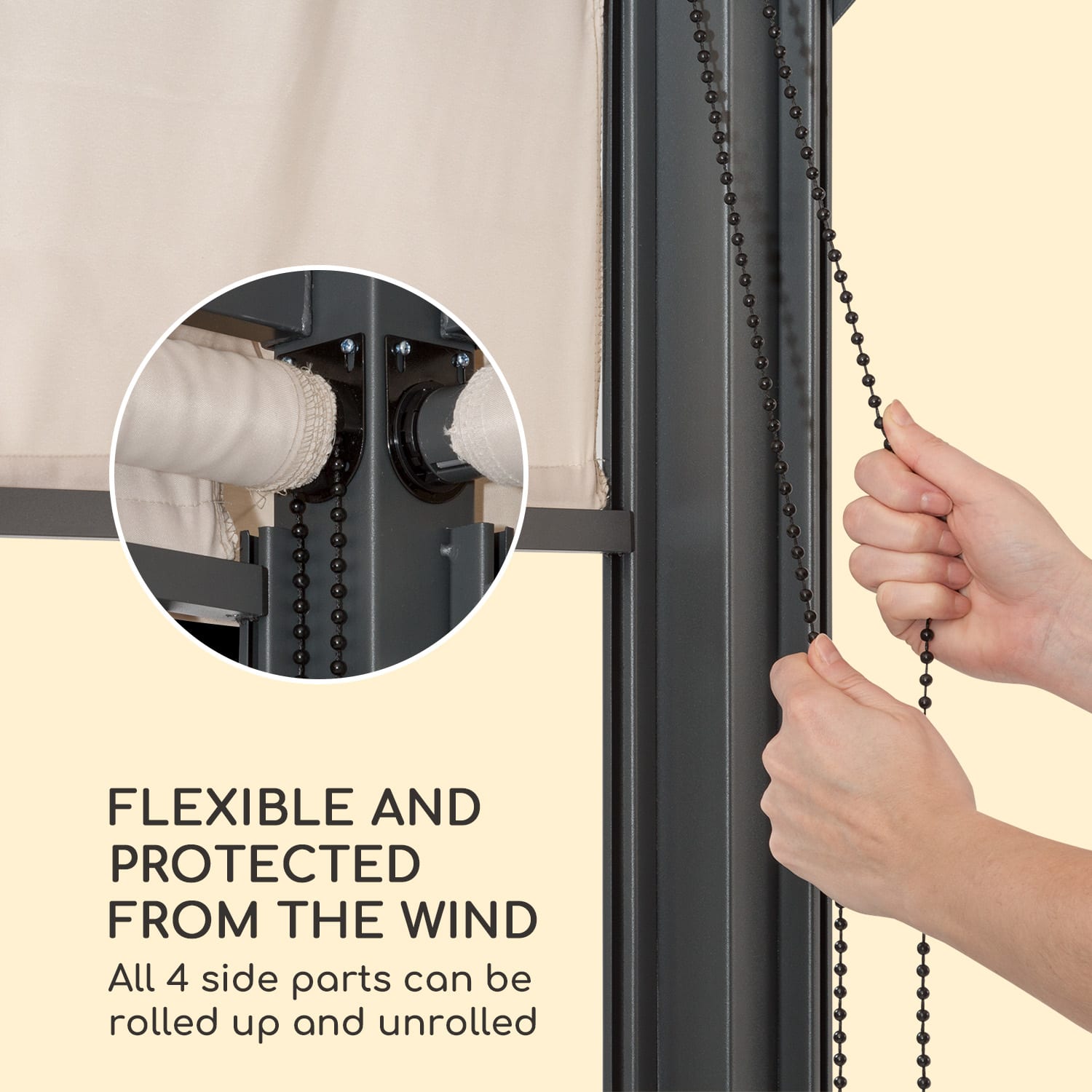 Leto pod holým nebom – v každom počasí! Záhradná pergola blumfeldt Grandezza Cortina je vzdušné útočisko tieňa, odolné proti poveternostným vplyvom.Príjemné hodiny v záhradnej idylke s priateľmi a rodinou: Grandezza Cortina s krytou plochou takmer 3 × 6 metrov ponúka dostatok priestoru na oddych pod strechou vyrobenou z 180 g/m² polyesteru s nepremokavým povrchom odolným proti plesniam. 6 × 6 cm rám z ocele tiež zaručuje maximálnu stabilitu a vďaka práškovo lakovanej povrchovej úprave je chránený pred koróziou.Štyri flexibilné bočné panely sú užitočné predovšetkým pri šikmom slnečnom svetle, vetre alebo daždi, pričom každý z bočných dielov je možné jednotlivo otvárať a zatvárať pomocou rolovacieho mechanizmu. Sú vyrobené z polyesteru, ktorý možno prať. Pri montáži konštrukcie sa odporúča zaistiť, aby boli stojany ukotvené v zemi vo zvislej polohe, aby sa zabezpečil hladký proces navíjania a odvíjania bez záhybov.Poskytuje tieň v horúcich letných dňoch a spoľahlivú ochranu pred vetrom a dažďom: záhradná pergola Grandezza Cortina od spoločnosti blumfeldt.