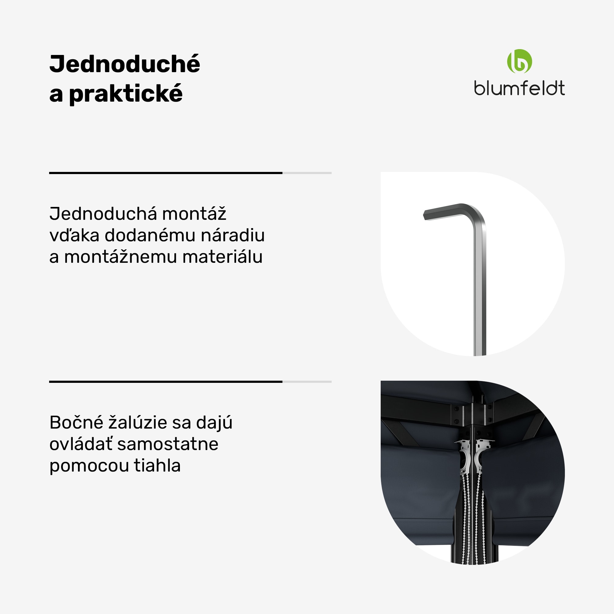 Užite si leto na čerstvom vzduchu – bez ohľadu na počasie!  Záhradný altánok  blumfeldt Grandezza Cortina je vzdušným tienistým miestom a útočiskom odolným voči poveternostným vplyvom.Strávte príjemné hodiny s priateľmi a rodinou v útulnej idylke na záhrade: Grandezza Cortina so zastrešenou plochou takmer 3 x 3 metre ponúka dostatok priestoru na relax pod sviežou strechou vyrobenou z 180 g/m² polyesteru s vodoodpudivým a proti plesniam odolným náterom. Oceľový rám s hrúbkou 6 x 6 cm zaručuje maximálnu stabilitu a vďaka práškovému lakovaniu je chránený proti korózii.4 flexibilné bočné panely, ktoré sa dajú individuálne otvárať a zatvárať pomocou pohodlného rolovacieho a sťahovacieho mechanizmu a sú vyrobené z umývateľného polyesteru, sú obzvlášť užitočné, keď je slnko, vietor alebo dážď. Pri montáži konštrukcie je vhodné dbať na to, aby boli nohy ukotvené najmä zvisle v zemi, aby sa zaistil rovnomerný proces navíjania a odvíjania bez krčenia.Poskytuje tieň počas horúcich letných dní a spoľahlivú ochranu pred vetrom a dažďom: záhradný altánok Grandezza Cortina od spoločnosti blumfeldt.