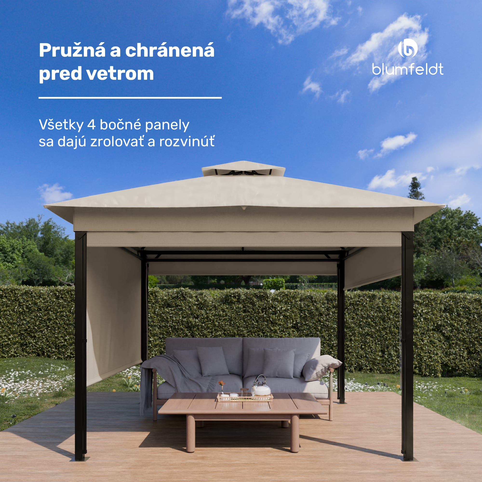 Užite si leto na čerstvom vzduchu – bez ohľadu na počasie! Záhradný altánok blumfeldt Grandezza Cortina je vzdušným tienistým miestom a útočiskom odolným voči poveternostným vplyvom.Strávte príjemné hodiny s priateľmi a rodinou v útulnej idylke na záhrade: Grandezza Cortina so zastrešenou plochou takmer 3 x 3 metre ponúka dostatok priestoru na relax pod sviežou strechou vyrobenou z 180 g/m² polyesteru s vodoodpudivým a proti plesniam odolným náterom. Oceľový rám s hrúbkou 6 x 6 cm zaručuje maximálnu stabilitu a vďaka práškovému lakovaniu je chránený proti korózii.4 flexibilné bočné panely, ktoré sa dajú individuálne otvárať a zatvárať pomocou pohodlného rolovacieho a sťahovacieho mechanizmu a sú vyrobené z umývateľného polyesteru, sú obzvlášť užitočné, keď je slnko, vietor alebo dážď. Pri montáži konštrukcie je vhodné dbať na to, aby boli nohy ukotvené najmä zvisle v zemi, aby sa zaistil rovnomerný proces navíjania a odvíjania bez krčenia.Poskytuje tieň počas horúcich letných dní a spoľahlivú ochranu pred vetrom a dažďom: záhradný altánok Grandezza Cortina od spoločnosti blumfeldt.
