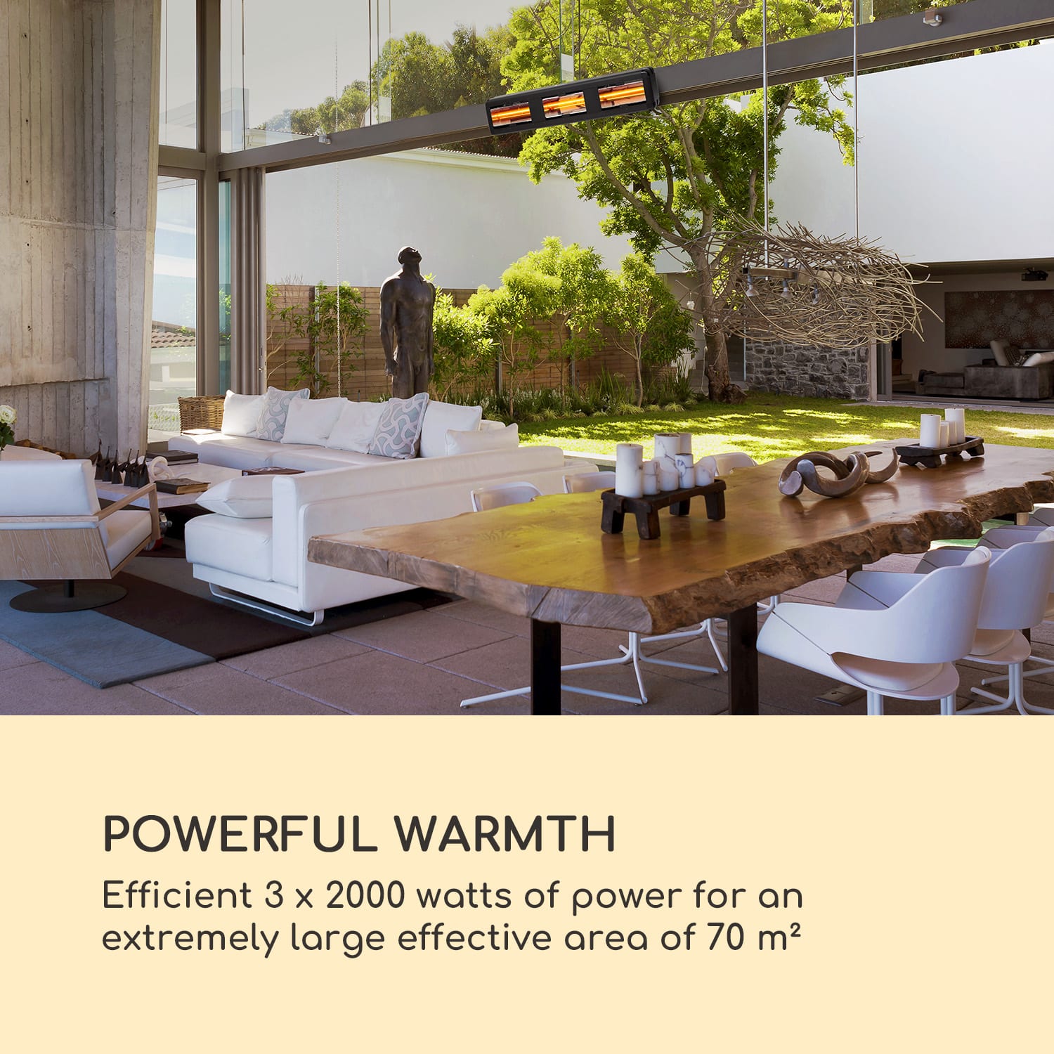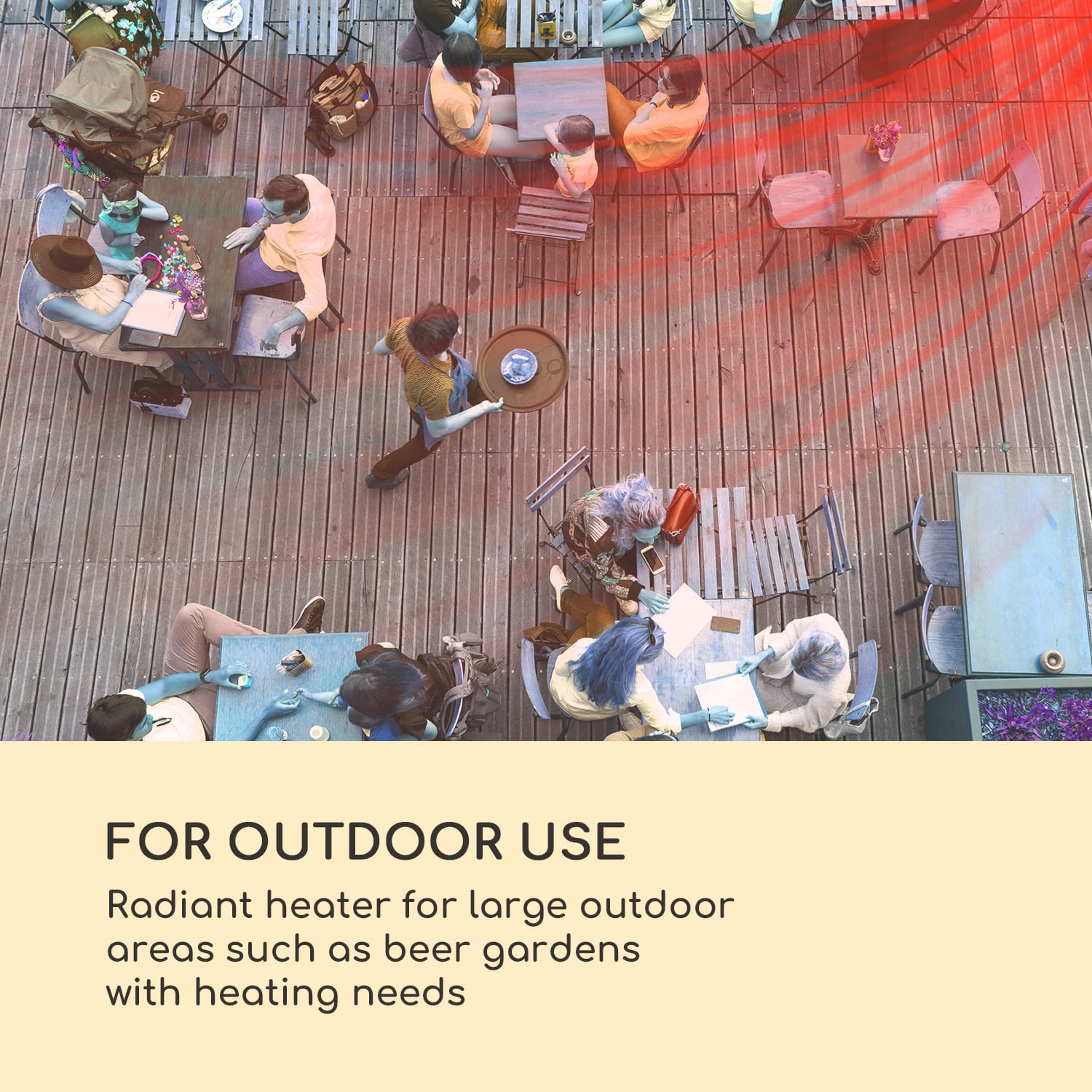 Teplo, teplejšie, Heat Giant: infračervený ohrievač blumfeldt Heat Giant je expertom na silné teplo vo vnútorných aj vonkajších priestoroch, keď je podujatie alebo oslava znovu trochu väčšia.Hreje ako slnko, tak funguje technológia IR ComfortHeat: elektrický ohrievač blumfeldt Heat Giant využíva infračervené svetlo s dlhými vlnami na priame ohrievanie osôb, objektov a stien bez doby rozohrievania a bez toho, aby bolo potrebné najskôr ohriať vzduch. Príjemné teplo okamžite cítiť na pokožke. Vďaka tomu je zariadenie perfektné nielen na vonkajšie použitie, ale v interiéri má táto metóda vykurovania svoje prednosti: je tichá a nevíri prach so stúpajúcim teplým vzduchom. Najlepšie podmienky pre alergikov alebo prostredie citlivé na hluk.Extra silný výkon 3 x 2 000 W sa postará o mimoriadne veľkú vykurovaciu plochu – napríklad v klubovniach alebo na večerných terasách. Infračervený ohrievač blumfeldt Heat Giant sa montuje na stenu pre úsporu miesta a bezpečné použitie. Jeho robustná hliníková konštrukcia s práškovým lakovaním je chránená triedou ochrany IP65 pred vniknutím prachu a vody.Oslavujte neskoro do noci, dokonca aj vo veľkej spoločnosti. Vďaka terasovému ohrievaču blumfeldt Heat Giant zostane útulne a teplo až do konca.Všimni si, že ohrievač vyžaduje 380 V elektrické pripojenie a inštaláciu musí vykonať elektrikár.