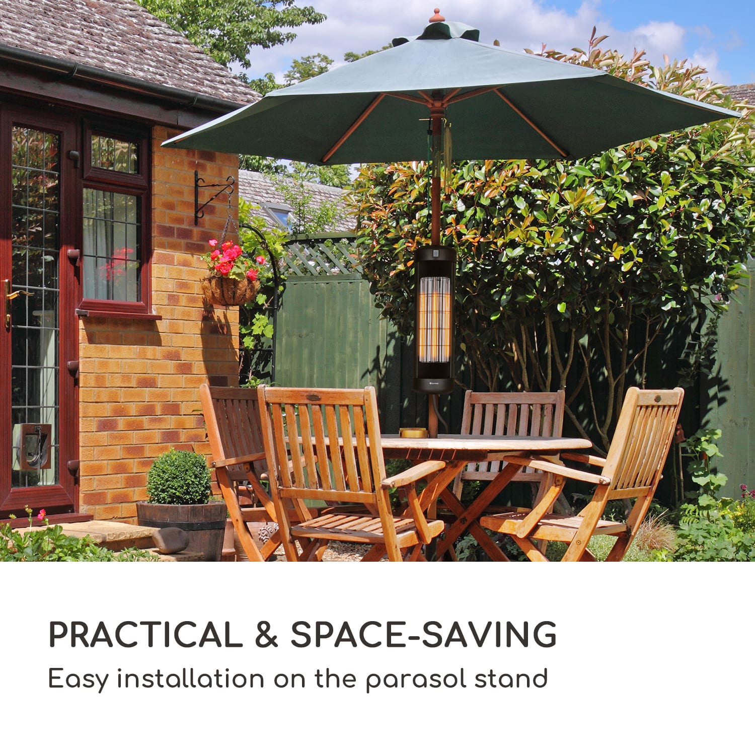 Všetko sa tu točí okolo príjemného tepla: Sálavý ohrievač Heat Guru Turbo od blumfeldt prináša príjemnú teplotu na terasu či balkón všetkým, ktorí radi trávia čas vonku aj v chladnom počasí. Pozlátené uhlíkové vykurovacie teleso s výkonom 2000 W zabezpečuje mimoriadne účinné vyžarovanie tepla. Systém IR ComfortHeat-nielenže dodáva teplo veľmi rýchlo, ale vďaka vysoko účinnému hliníkovému reflektoru a infračervenému žiareniu s dlhými vlnami, ho aj cielene dodáva blízkym osobám a predmetom bez toho, aby ohrieval vzduch. Užívajte si príjemné teplo od prvej sekundy a prispôsobte si ho svojim potrebám vďaka 3 stupňom výkonu! V súlade s požiadavkami na ochrannú triedu IP54 je eloxovaný hliníkový kryt infračerveného ohrievača blumfeldt Heat Guru Turbo chránený proti striekajúcej vode a prúdom vody a je tak ideálny na vonkajšie použitie. Mimoriadne praktický: Heat Guru Turbo sa ľahko nainštaluje na stojan slnečníka. Nepotrebuje vlastný stojan a môžete ho použiť kdekoľvek, kde máte slnečník počas dňa.Nielenže sa rozžiari: sálavý ohrievač blumfeldt Heat Guru Turbo vytvorí vďaka svojmu vysokému tepelnému výkonu kedykoľvek útulnú atmosféru.Upozornenie: Sálavý ohrievač je vhodný len na vonkajšie použitie.