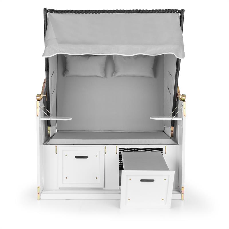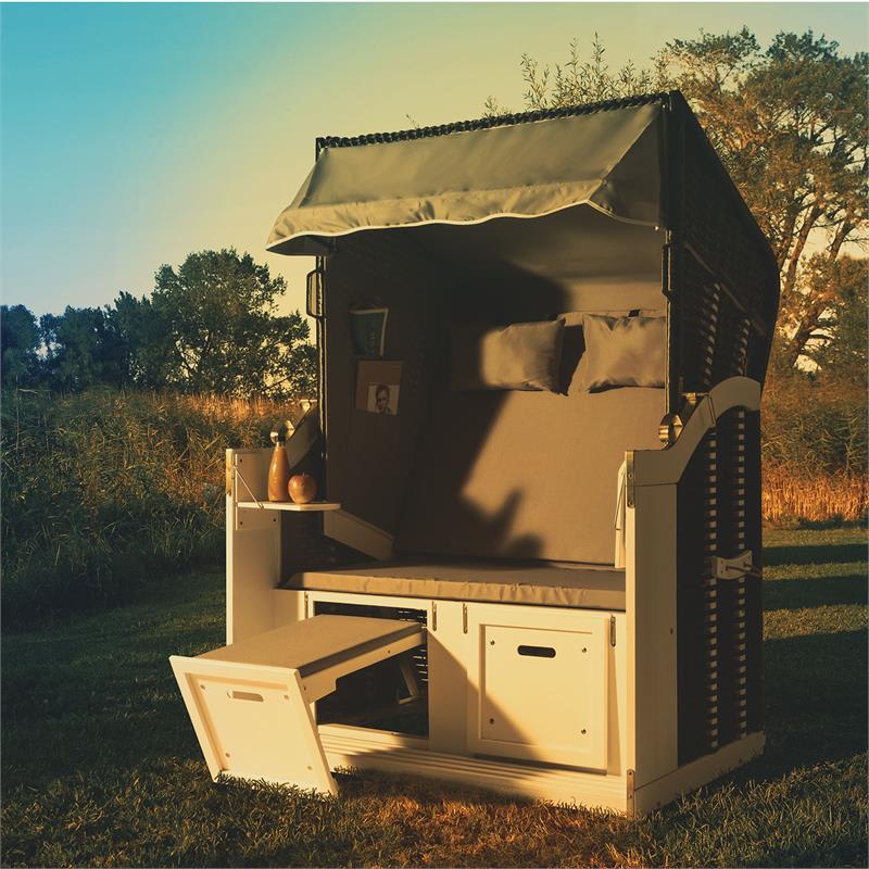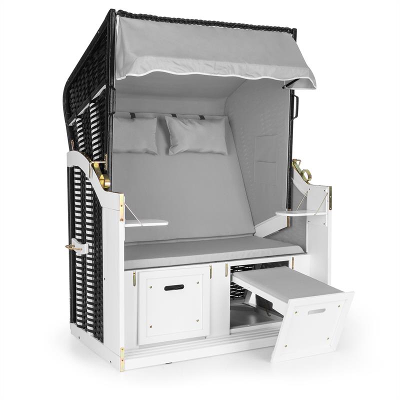 Leto, slnko, morská pláž. Blumfeldt Hiddensee plážový kôš na sedenie prináša plážový feeling priamo do Vášho domova. Či už v záhrade, na terase alebo v plážovom bare: Čistý pôžitok a uvoľnenie, zaručene zabudnete na túžbu po diaľke a dovolenkovú náladu máte istú. Jednoducho doprajte Vašej duši odpočinok a doprajte si deň pri mori – každý deň. Oddych nebol ešte nikdy krajší a pohodlnejší, ako keď ste ochránení pred vetrom, počasím a zvedavými pohľadmi v plážovom koši na sedenie. 118 cm XL konštrukcia priestranného plážového koša Blumfeldt Hiddensee je zhotovený z borovicového dreva a PE-ratanu odolného voči poveternostným vplyvom. Neviditeľný fóliový poťah zaručuje nepremokavosť príklopu, takže plážový košík môže ostať vonku aj pri zlom počasí a slúžiť ako pohodlné miesto na uchýlenie sa. Pred pohľadmi a vetrom chráni vnútorný polyesterový poťah. Je jedno či radšej sedíte alebo ležíte, 5-stupňovo nastaviteľné spúšťanie príklopu Vám umožní oboje. O to, aby ste sa naozaj cítili príjemne sa postarajú extra hrubé, 4 cm sedacie podušky ako aj dva vankúše, ktoré nič neprenechajú náhode, pokiaľ ide o pohodlie. Taktiež vystužené, vyťahovacie opierky na nohy pozývajú k tomu, aby ste si denno-denne nohy vyložili nahor- perfektné na oddýchnutie si po práci alebo po prácach v záhrade a popri tom snívať o mori. Keď Vám k telesnému odpočinku chýba ešte nápoj ako Cola, káva alebo víno, alebo nejaké občerstvenie, Blumfeldt Hiddensee plážový kôš na sedenie prichádza na pomoc: dva malé stolíky je možné sklopiť a ponúkajú perfektný odkladací priestor na šálky, taniere alebo poháre. Tento plážový košík je perfektným doplnením do kaviarní alebo barov, ktoré chcú svojich zákazníkov pohostiť v štýlovej plážovej atmosfére v prímorskom duchu. Aby si oddychoví nadšenci vždy našli perfektné miesto na slniečku, je možné plážový kôš na sedenie veľmi jednoducho premiestniť pomocou dvoch bočných rukovätí. Ešte viac pohodlia sprostredkúvajú štyri úložné vrecká, v ktorých si nájdu priestor časopisy alebo okuliare. Aby ste sa cítili dobre a boli vždy v čistom, sú všetky poťahy odnímateľné vďaka suchému zipsu a po vypraní ich môžete znova pripevniť. Dodatočnú farebnú sadu ochranných poťahov na sedacie podušky, ktorá chráni pred zašpinením, pripevníte mávnutím ruky. Dostupné modely: jednofarebný sivý motív, červená/biela károvaný motív produkt 10030995), modrá/biela prúžkovaný motív (produkt 10030996). Na zloženie plážového košíka odporúčame pomoc ešte jednej osoby a plánovaný čas montáže sú približne dve hodiny.