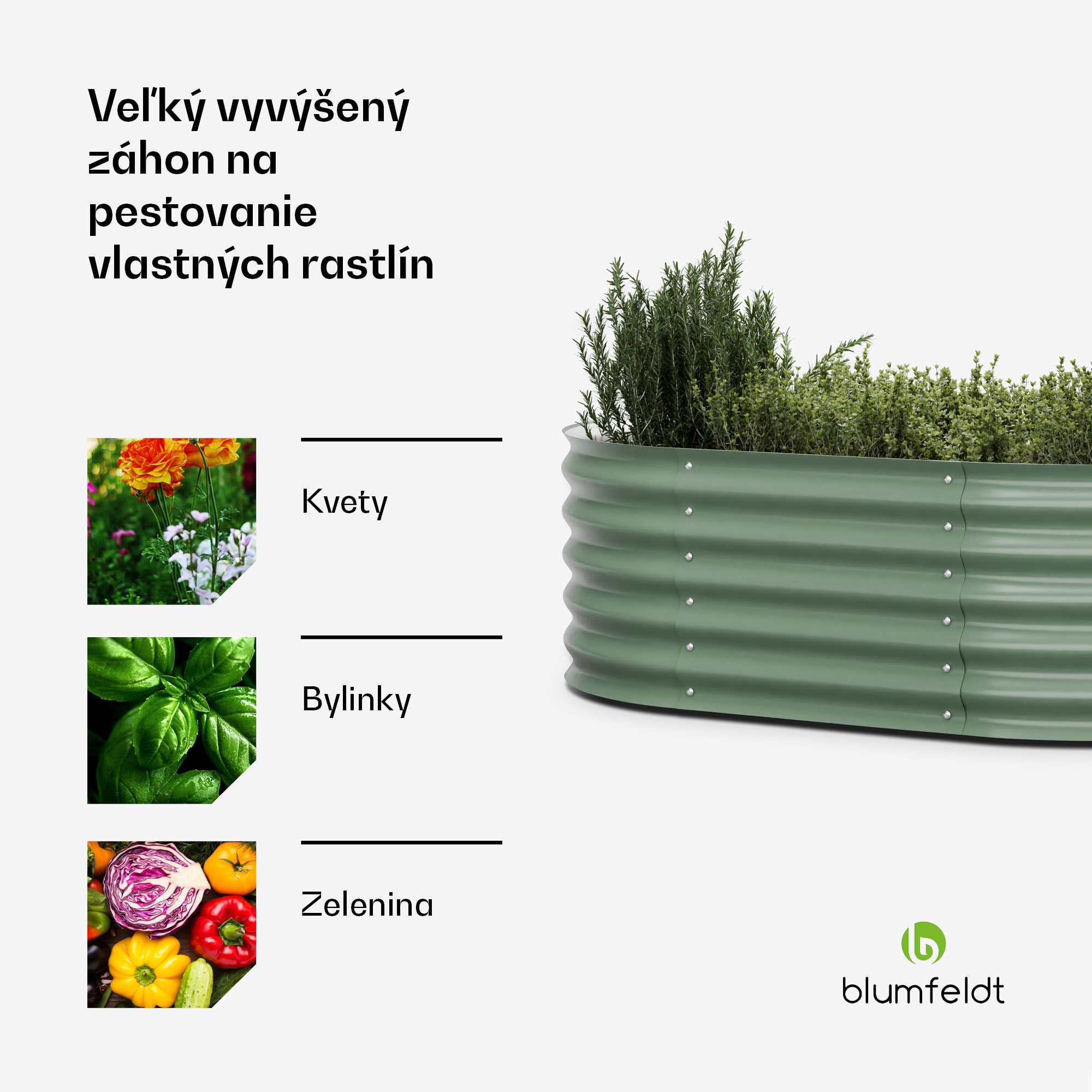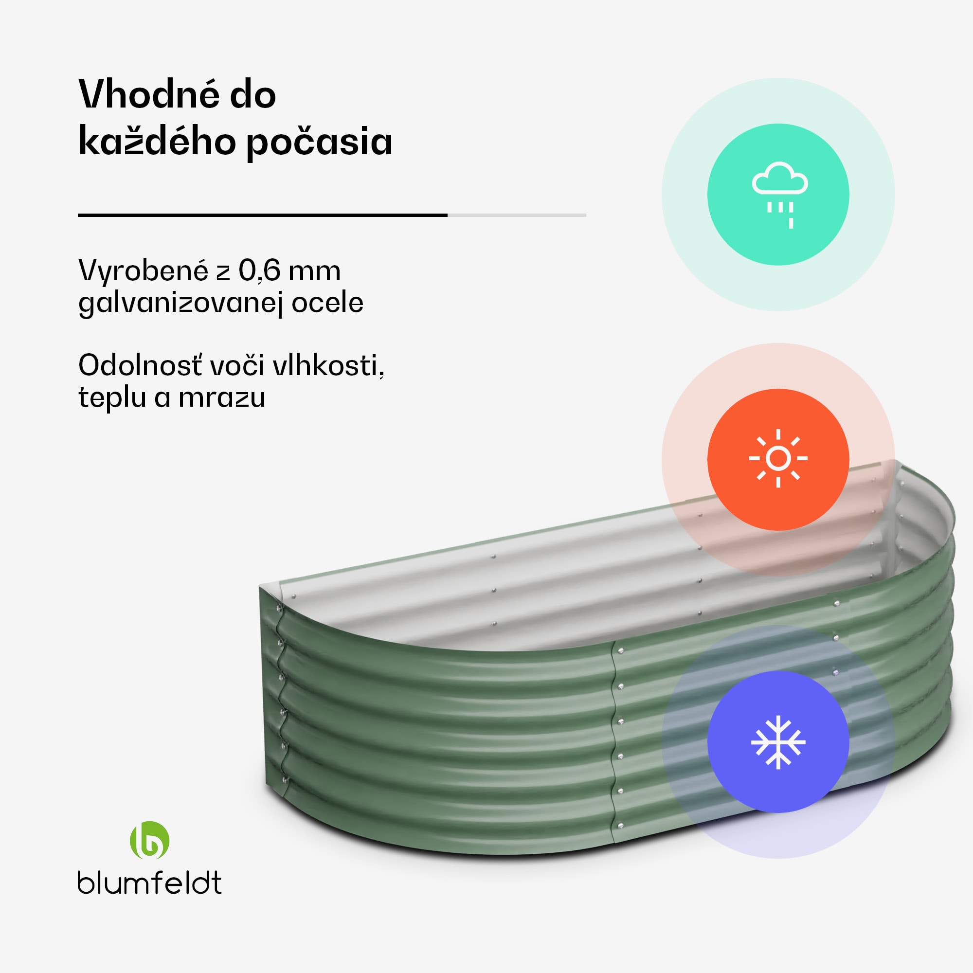 Chutné, čerstvé a z vlastného záhona: S vyvýšeným záhonom blumfeldt High Grow Extended máte ešte viac priestoru na to, aby ste si sami vypestovali svoju dennú porciu zeleniny a premenili terasy, dvory alebo predzáhradky na zelené oázy. Pestovanie šťavnatých paradajok, sladkých jahôd, chrumkavých cukiet a aromatických byliniek je vďaka optimálnym pestovateľským podmienkam hračka. Jednoročné rastliny a celoročné záhradnícke pôžitky: Stabilná rámová konštrukcia záhradného záhonu blumfeldt je vyrobená z vlnitej ocele a je odolná voči hrdzi a mrazu vďaka špeciálnej zliatine zinku. High Grow odoláva vetru a počasiu po celý rok. Vďaka polkruhovému tvaru je okrasný vyvýšený záhon od blumfeldt stabilný a zároveň je vizuálnym pútačom po celý rok.Farebná pastva pre oči a zdravá pochúťka: Blumfeldt High Grow Extended vytvára optimálne rastové podmienky. To umožňuje relatívne vyššie výnosy ako u plochých záhonov. Pohodlie v stoji a predovšetkým šetrnosť k vášmu chrbtu robí záhradkárčenie oveľa príjemnejším. Pohodlná pracovná výška 60 cm je mimoriadne praktická aj pre deti. To znamená, že aj tí najmenší môžu pomáhať pri sadení, polievaní a zbere. Napriek tomu pre škodcov, akými sú slimáky, zostáva záhon neprekonateľnou bariérou.Čas urobiť niečo užitočné: S okrasným vyvýšeným záhonom blumfeldt High Grow Extended môže každý objaviť svoju zelenú záľubu.