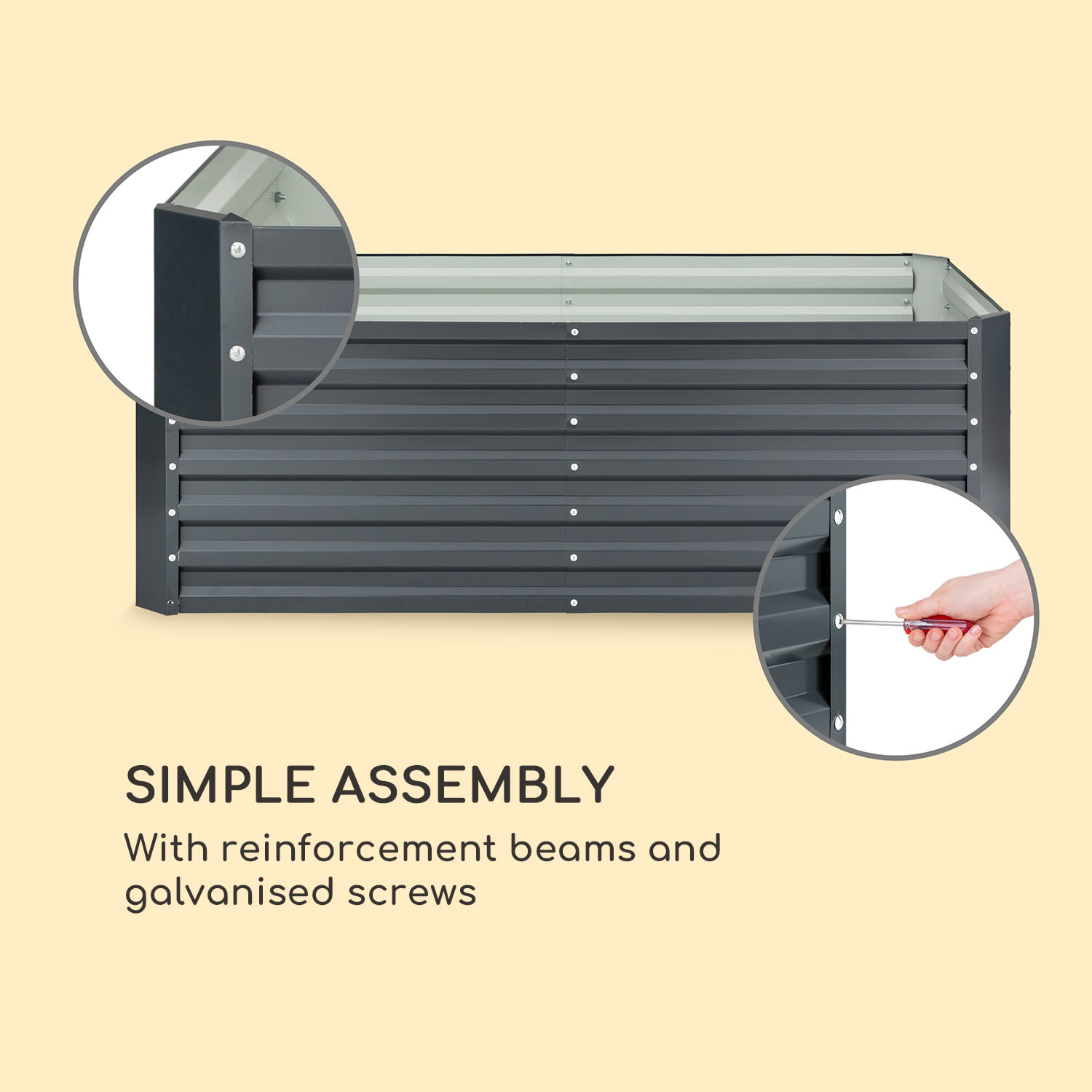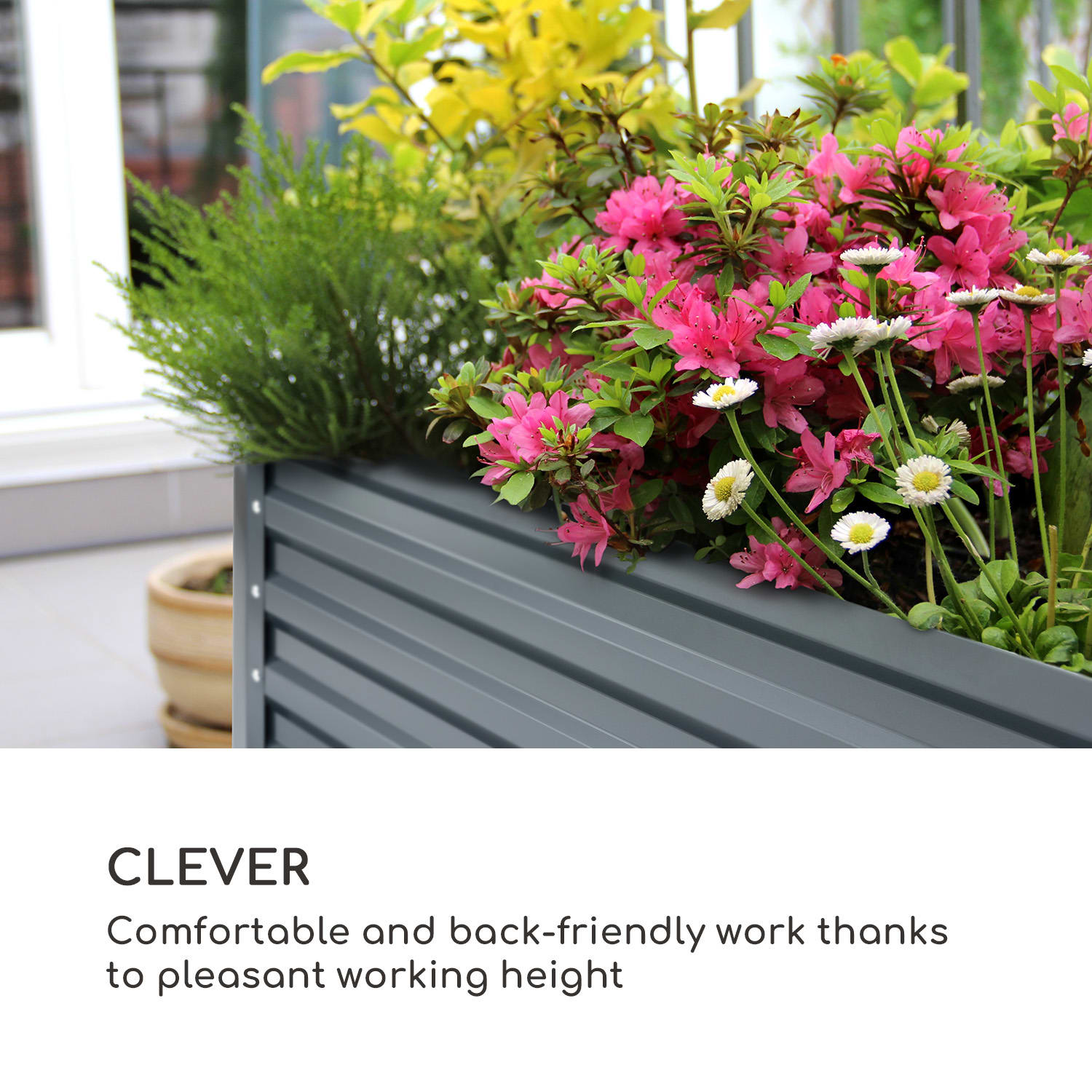 Chutné, čerstvé a z vlastného záhonu: vo vyvýšenom záhone High Grow Straight od blumfeldt môžete pestovať vlastné denné porcie zeleniny a premeniť terasy, dvory alebo predzáhradky na zelené oázy. _x000D_Pestovanie šťavnatých paradajok, sladkých jahôd, chrumkavých cukiet a aromatických byliniek je vďaka optimálnym podmienkam hračka. Jednoročné rastliny a celoročné potešenie zo záhradkárčenia: Stabilná rámová konštrukcia záhradného záhonu je vyrobená z vlnitého oceľového plechu a je bezpečne chránená proti poveternostným vplyvom špeciálnou zinkovo-hliníkovou povrchovou úpravou Weather Shield Coating 120 g/m². High Grow Straight odoláva vetru a počasiu po celý rok._x000D_Farebná pastva pre oči a zdravá pochúťka pre chuťové bunky: blumfeldt High Grow Straight vytvára tie optimálne podmienky pre pestovanie. To umožňuje relatívne vyššie výnosy ako porovnateľné ploché záhony. Záhradkárčenie pohodlne v stoji a predovšetkým s ohľadom na váš chrbát, vás bude baviť ešte viac. Pracovná výška 60 cm je prekážkou aj pre škodcov, ako sú slimáky. Do okrasného vyvýšeného záhonu s objemom 970 litrov možno pridať množstvo vrstiev humusu, takže sa dá použiť aj priamo ako kompostér: Jednoducho umiestnite zelený odpad medzi vrstvy pôdy – to nielen priláka dážďovky, ktoré pôdu kypria, ale aj trvalo zásobuje záhon čerstvými živinami._x000D_Je načase urobiť niečo užitočné: pretože s okrasným vyvýšeným záhonom High Grow Straight od blumfeldt môže každý objaviť svoju záhradkársku dušu.