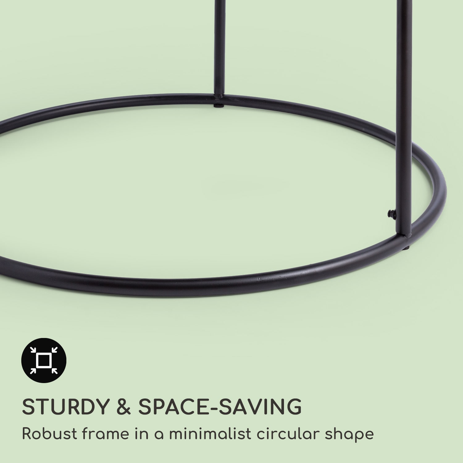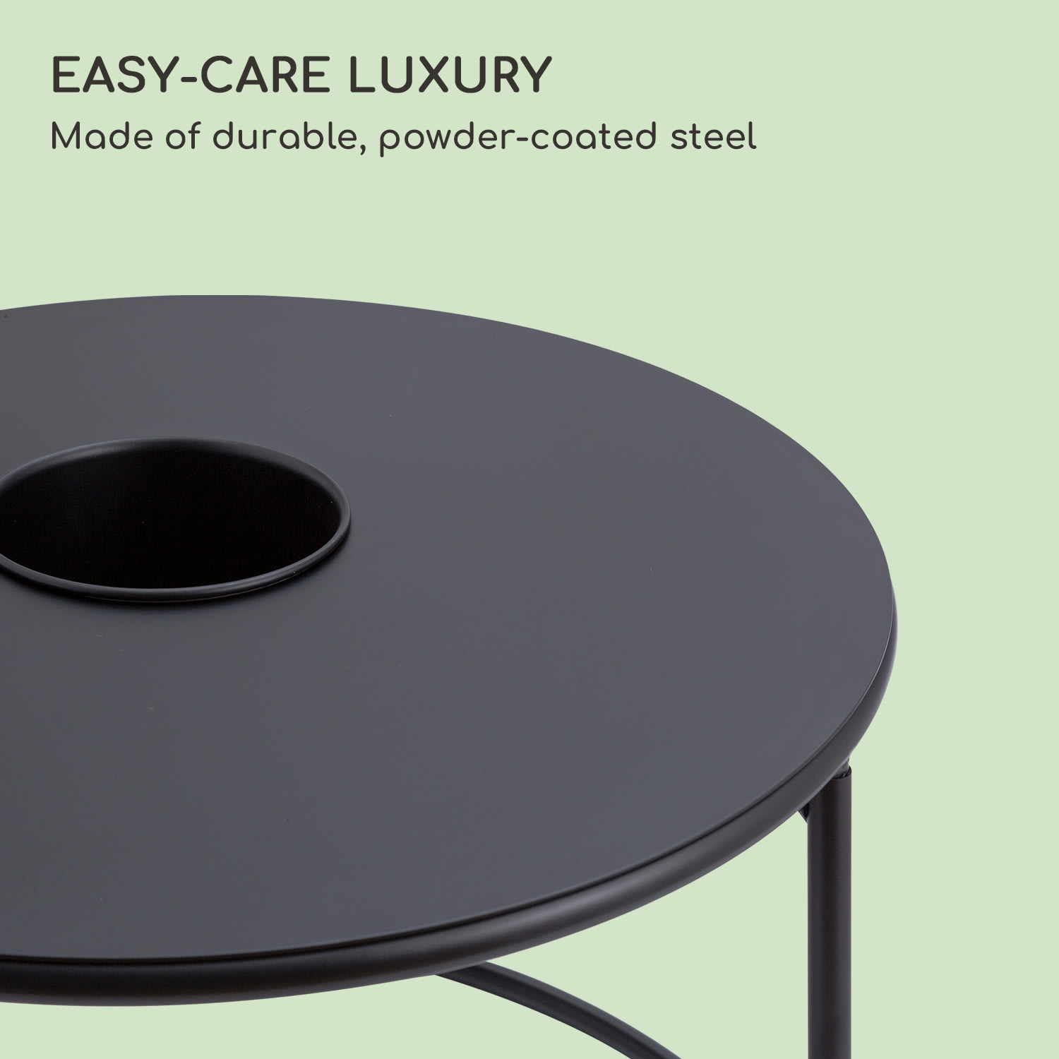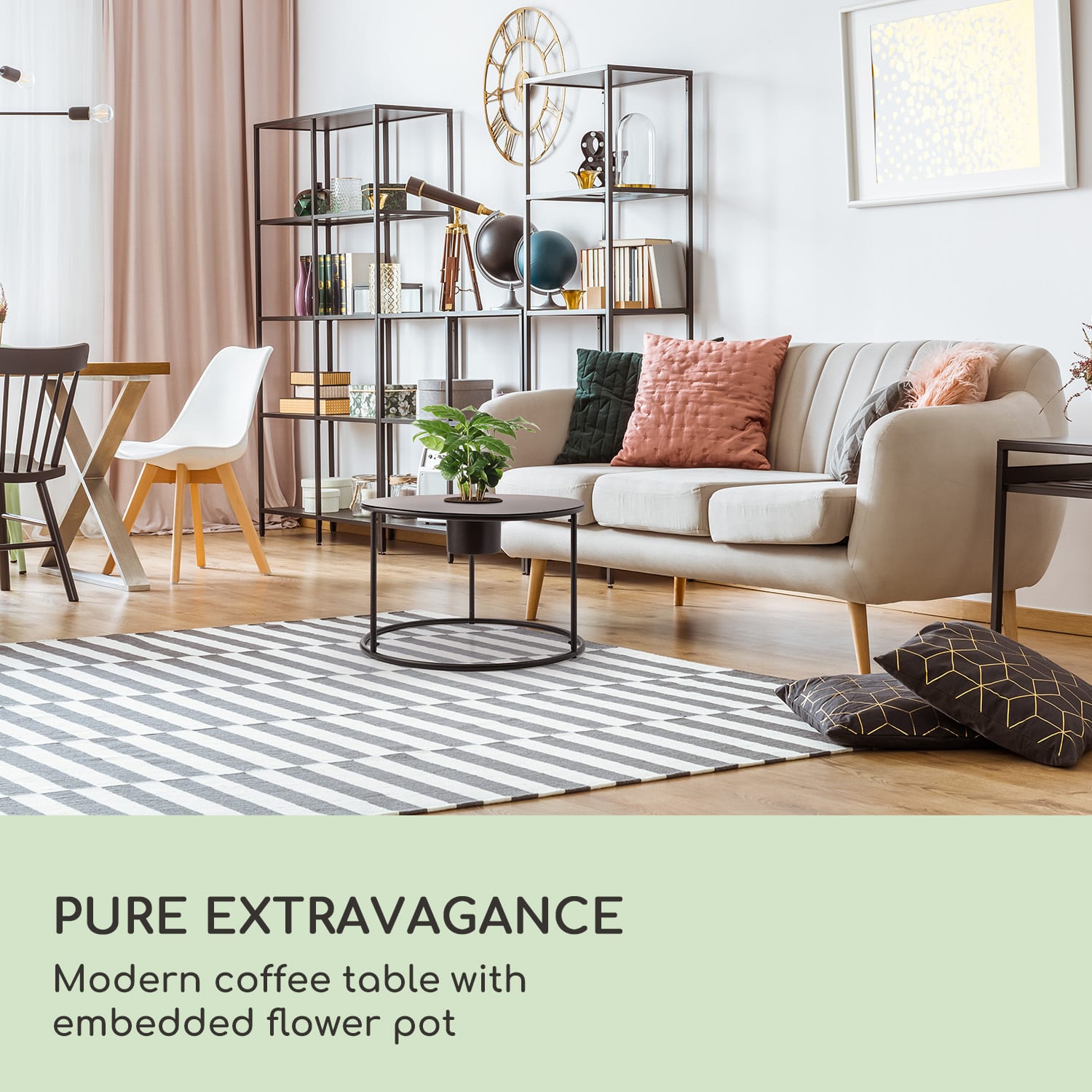 Klasicky moderné: konferenčný stolík Irvine od blumfeldtkombinuje robustný materiál s minimalistickým dizajnom. V každej miestnosti sa stane pútačom pozornosti, pretože má v strede kvetináč. Stačí ho osadiť obľúbenými kvetmi a váš nový konferenčný stolík bude mať prirodzene živý stred. Nielen praktické zasadenie rastliny pripomína na časy na rodinnom dome, ale aj priestorovo úsporné línie: okrúhla stolová doska je umiestnená na troch jemných tyčiach, ktoré prechádzajú do rovnako okrúhlej základne. Vďaka kvalitnému spracovaniu a robustnému materiálu vám filigránsky stôl sľubuje maximálnu stabilitu. Práškové lakovanie ocele tiež zaručuje, že sa veľmi ľahko čistí a je odolný.Extravagancia s kávou a koláčom: moderný konferenčný stolík Irvine od blumfeldt prekvapí zabudovaným kvetináčom uprostred.