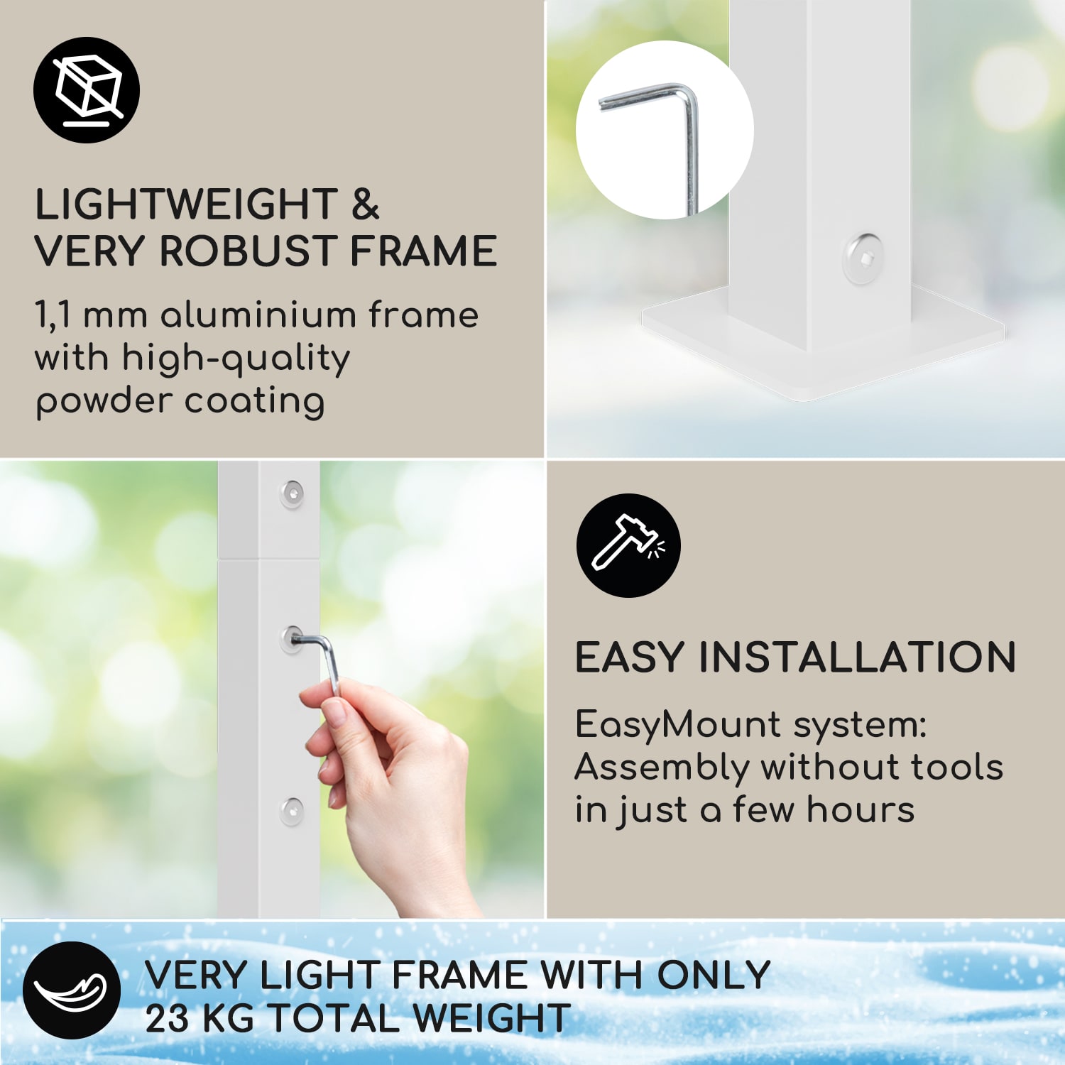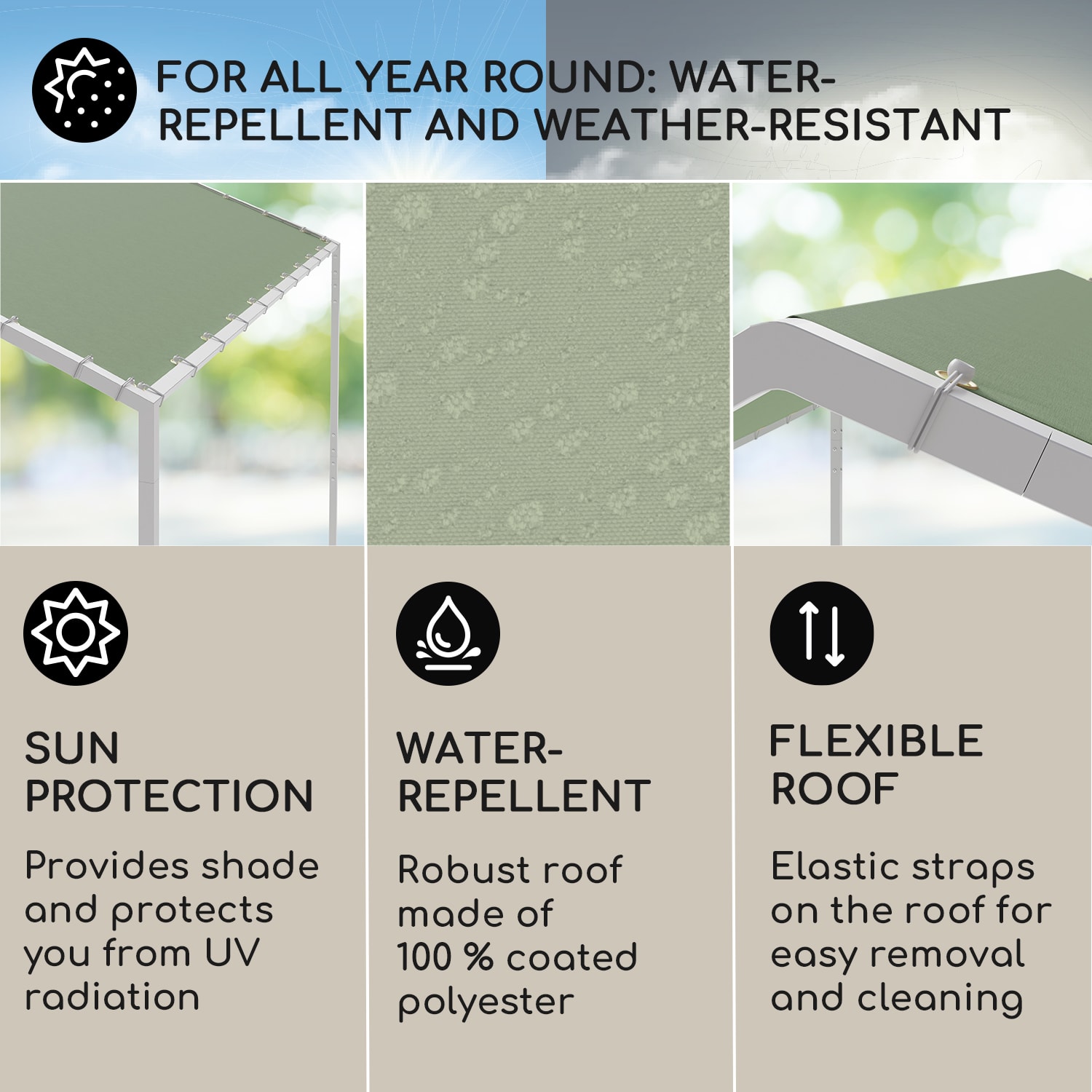 S Gazebo La Rochelle od blumfeldt sa budete cítiť ako Boh vo Francúzsku. Markíza spoľahlivo zatieni plochu 3 x 3 m a vďaka jednoduchému systému poskladania ju rýchlo zostavíte vo vašej záhrade. Strechu altánku môžete jednoducho upevniť pomocou priložených gumičiek. Štíhly dizajn so šikmou strechou krásne zapadne do vášho vonkajšieho priestoru. Jeho hliníkový rám zabezpečuje stabilitu a vodoodpudivý strešný povrch chráni pred priamym slnečným žiarením vďaka triede ochrany proti UV žiareniu 50+. Pergola La Rochelle od blumfeldt premení miesta na sedenie vo vašej záhrade na komfortné zóny plné oddychu.