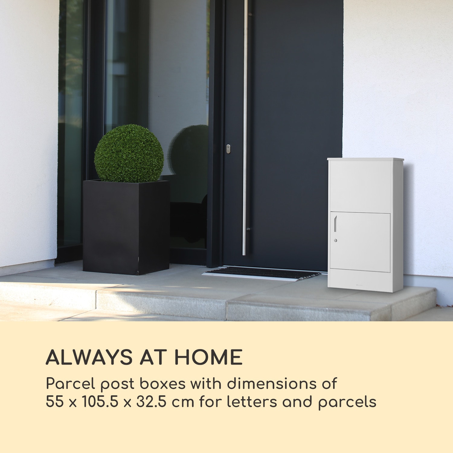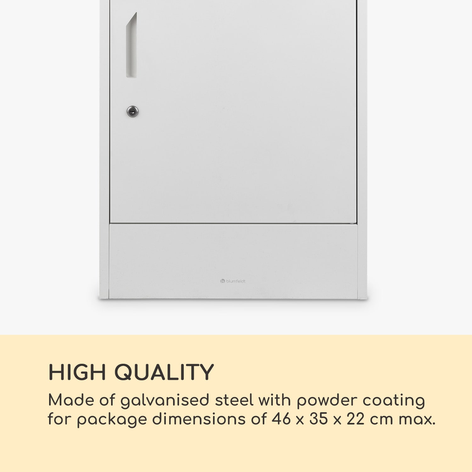 S balíkoboxom blumfeldt London White už nikdy viac nepremeškáš dodanie balíku a už ich nebudeš musieť hľadať u tvojich susedov.Kto v budúcnosti už nechce stáť v dlhých radoch na pošte, sa poteší poštovej schránke na balík blumfeldt London White. Do štýlového a voľne stojaceho balíkoboxu sa vmestia malé až stredne veľké balíky s rozmermi 46 x 35 x 22 cm – samozrejme aj štandardné a maxi listové zásielky.Voľne stojaca poštová schránka sa dodáva už v zmontovanom stave a je vyrobená z galvanizovanej ocele, prášková vrstva laku dodáva London White odolnosť voči poveternostným vplyvom a hrdzi. Aby bolo zachované listové tajomstvo, sú 1 mm hrubé zadné dvierka vybavené kruhovým zámkom. Balíkobox sa dá dodatočne ukotviť do zeme. V stojane sa na to nachádzajú predvŕtané diery na ukotvenie do zeme.Poštovú schránku na balík blumfeldt London White môže použiť každá zásielková služba. Takto odteraz ušetríš čas na cestu na poštu vrátane čakania v rade. Upozornenie: Aby bolo možné doručovateľovi odovzdať zásielku bez podpisu, mali by ste so svojou balíkovou službou podpísať takzvanú „garážovú zmluvu“.