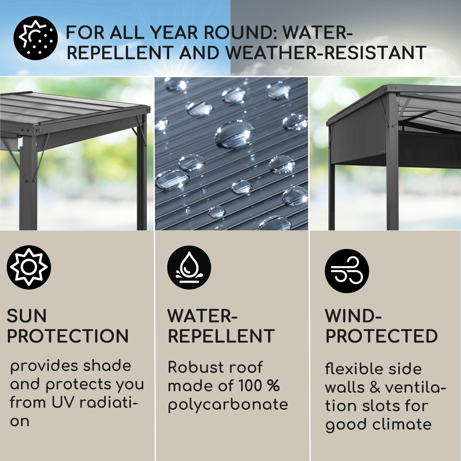 Strávte príjemné hodiny v záhrade alebo na terase pod ochranou prístrešku: pergola Blumfeldt Pantheon Cortina Solid Sky s hliníkovým rámom, pevnou strechou a bocnými stenami to umožní!Co je krajšie ako užívat si spolocné chvíle s rodinou a priatelmi vo volnej prírode? Pod Pergolou Pantheon Cortina Solid Sky ste neustále chránení pred daždom a môžete si užit horúce letné dni v chladnom tieni. Zodpovedná je za to stabilná plochá strecha z polykarbonátu (PC) ako aj lahký hliníkový rám lakovaný práškovou metódou. Skrutky odolné voci poveternostným vplyvom a dlhou životnostou z ušlachtilej ocele sa starajú o vysokú stabilitu celej konštrukcie. Pergolu blumfeldt Pantheon Cortina Solid Sky môžete pomocou skôb, ktoré sú súcastou balenia, jednoducho upevnit do vhodnej zemi alebo na pevno zaskrutkovat na terase. Ako bezpecná ochrana proti daždu a slnku týmto spôsobom obohatí pergola posedenie v záhrade alebo na terase. O súkromie na želanie a individuálnu ochranu pred vetrom je každá bocná stena vybavená vtahovatelnou roletou z polyestru.Kvalitná, všestranná a robustná: pergola blumfeldt Pantheon Cortina Solid Sky obdarúva uvolnené hodiny v záhrade alebo na terase s ochranou pred daždom a slnkom a svojimi bocnými stenami sa stará o ochranu pred pohladmi a vetrom. Táto pergola na terasu je ideálnym riešením pre každého, kto hladá štýlovú a funkcnú ochranu.