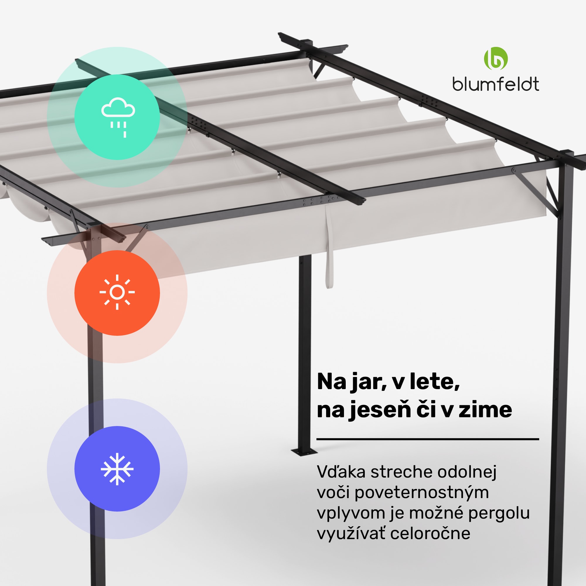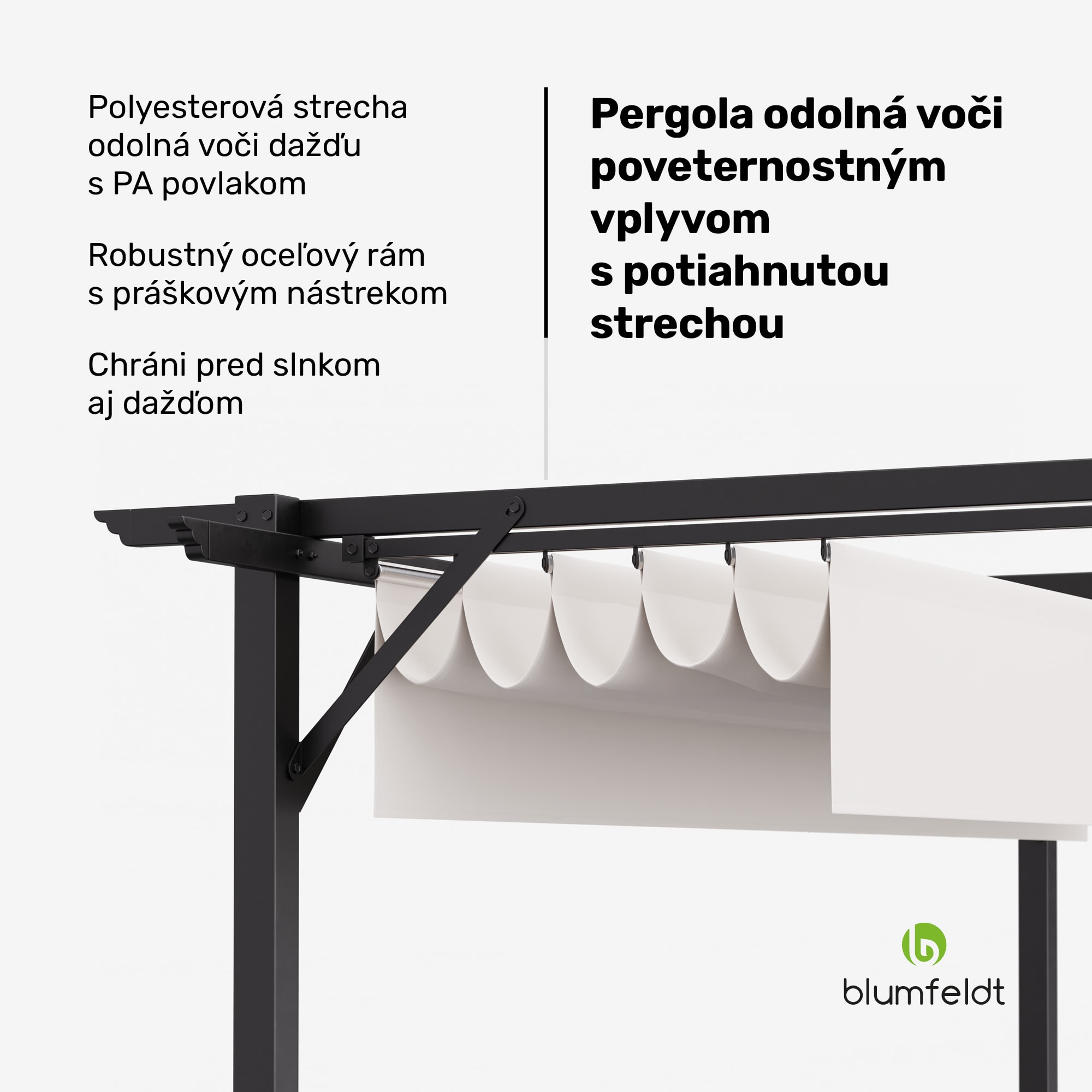 Pergola Blumfeldt Pantheon Robust je ideálnym doplnkom vášho vonkajšieho priestoru, či už v záhrade, na terase alebo na dvore. Vďaka elegantnému dizajnu a robustnej konštrukcii poskytuje ochranu pred slnkom a dažďom a vytvára vonku útulnú atmosféru. Oceľový rám s práškovou povrchovou úpravou zaisťuje vysokú stabilitu a nosnosť, zatiaľ čo strecha z polyesteru s gramážou 160 g/m² s vodoodpudivou PU vrstvou je odolná voči poveternostným vplyvom a poskytuje UV ochranu. Vďaka ochrannej streche a roletám môžete pergolu Blumfeldt Pantheon Robust používať po celý rok, aby ste si mohli naplno užívať pobyt vonku bez obáv z nepriaznivého počasia. Montáž je jednoduchá a priamočiara, pretože všetko príslušenstvo potrebné na montáž je súčasťou balenia, takže si môžete za okamih vychutnať svoju súkromnú vonkajšiu oázu pohody.