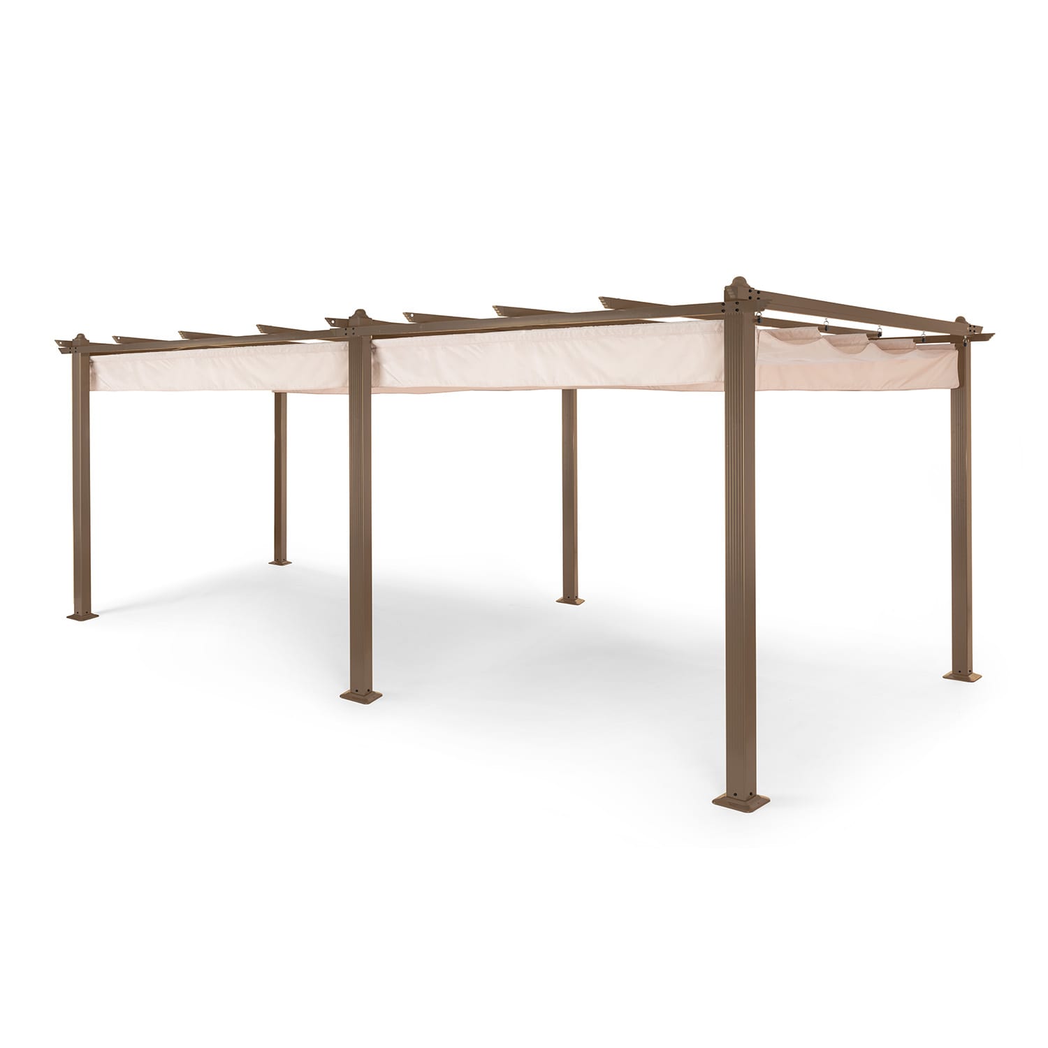 Božské záhradné sídlo s ázijským nádychom! Pergola blumfeldt Pantheon Rust sa stane chrámom odpočinku, ktorý je dobre chránený pred poveternostnými vplyvmi.S pergolou blumfeldt Pantheon Rust spravíš zo svojej terasy alebo posedenia v záhrade zónu odpočinku. Kompletná súprava pergoly obsahuje všetko, čo je potrebné na to, aby sa plocha 3 × 6 metrov zmenila s malým úsilím na tienené miestečko. Rám vyrobený z 10 × 10 cm stĺpikov s hrúbkou materiálu 1,2 mm je nielen mimoriadne stabilný, ale vďaka zhotoveniu z práškového lakovaného hliníka je aj veľmi ľahký. Perfektné pre dlhodobé potešenie z oddychu vo vonkajšom prostredí – úplne bez škvŕn od hrdze na podlahe terasy. Plynule nastaviteľný baldachýn z polyesteru s hustotou materiálu 200 g/m² ti ponúka optimálnu ochranu zhora: pred slnkom, dažďom alebo vetrom. Pomocou lanka môžeš slnečnú striešku elegantne posúvať tam a späť v jej vodiacich lištách. Nepremokavý polyuretánový povlak (PU) chráni textil pred plesňami a umožňuje ľahké utieranie. Vďaka svojej konštrukcii s prekrývajúcimi sa priečnymi výstuhami na streche je táto pergola pôsobivým stredobodom pozornosti: poskytuje každému miestu mierne ázijský nádych.Dopraj si čerstvý vzduch za každého počasia – s pergolou blumfeldt Pantheon Rust. Miesto odpočinku v záhrade. Rodinné oslavy, svadba alebo detské narodeninové oslavy – pod touto veľkou strechou proti slnku je miesto pre mnohých hostí!