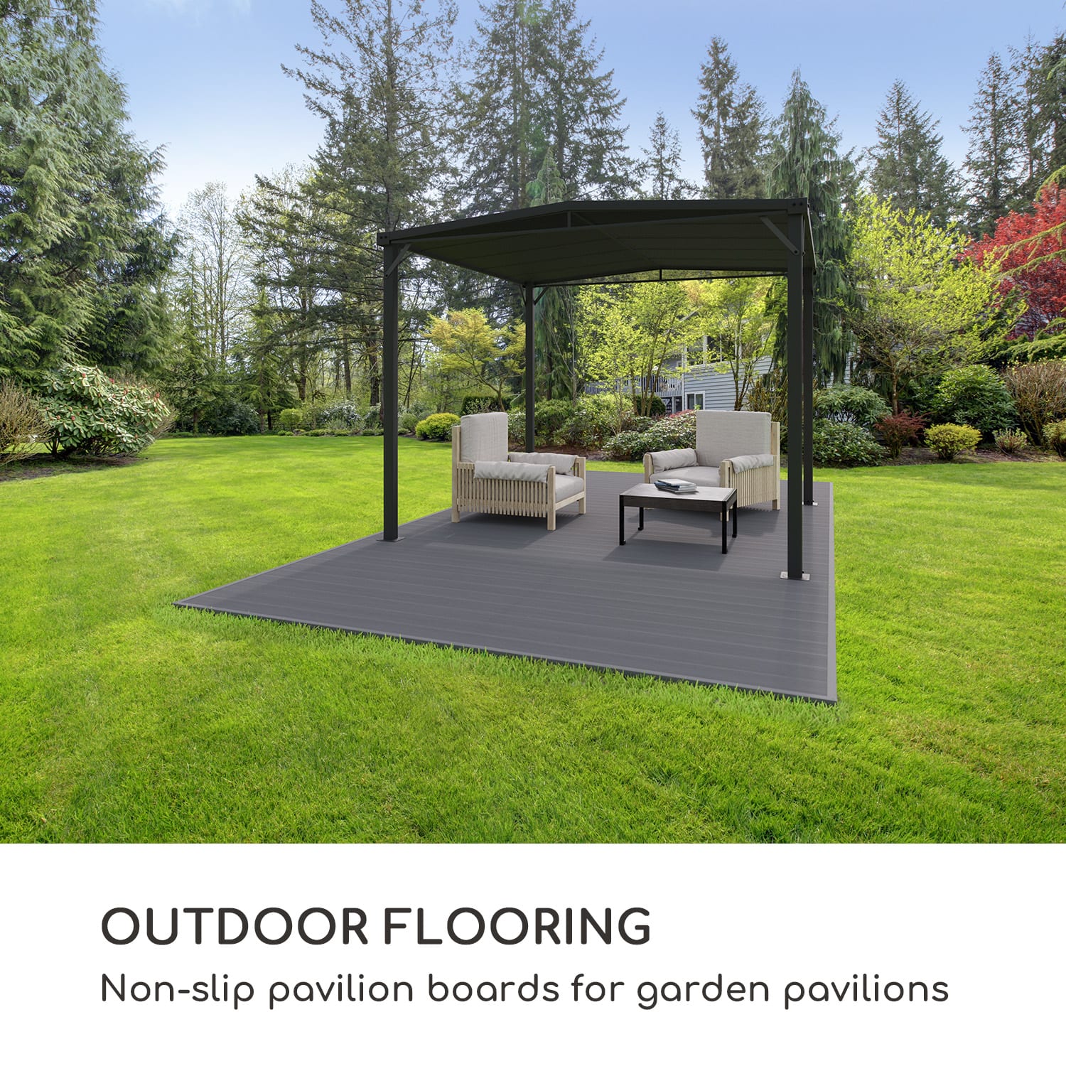 Vhodná k nášmu sortimentu záhradných pavilónov: podlaha do pavilónu blumfeldt Pantheon Solid Ground poskytuje ideálny základ pre pohodlné hodiny pod pergolou. Zaži maximálny komfort, zvlášť keď si v lete užívaš hodiny oddychu naboso! Vysoko kvalitný kompozitný materiál zo 60 % dreva a 40 % plastu je nielen príjemný na dotyk, je tiež odolný proti prasklinám a trieskam. Tento veľmi pevný materiál má aj ďalšie výhody: je odolný proti tvorbe plesní, je mrazuvzdorný a nehrdzavie. Zabezpečuje zachovanie tvaru podkladu a chráni pred UV žiarením. Huby ani hmyz nemajú šancu proti jeho odolnosti. Podlahu môžeš kompletne recyklovať, čo jej poskytuje veľmi udržateľný charakter. Tradičná, čisto drevená podlaha s ňou v tomto nemôže súperiť.Malá záhradná párty, narodeniny alebo grilovanie s priateľmi: mravce viac nie sú pozvané! Hmyz totiž nemá rád kompozitný materiál. Podlaha do pavilónu je dokonalým doplnkom každého altánku, ale dá sa, samozrejme, položiť aj na otvorený trávnik alebo na terasu.Rozlož, pospájaj a môžeš relaxovať: inštalácia terasovej podlahy je veľmi jednoduchá. Vďaka rafinovanému systému zacvakávania jednotlivé lišty jednoducho spojíš a následne zoskrutkuješ. Spony, skrutky, vrtáky a bity sú súčasťou balenia. Podlaha poskytuje pevný, protišmykový povrch, najmä v mokrom počasí.Obývačka v exteriéri: podlaha do pavilónu blumfeldt Pantheon Solid Ground je dokonalou podlahou do záhrady alebo na terasu. Je zladená s naším sortimentom záhradných pavilónov a je k dispozícii v rôznych farbách a veľkostiach. Vizuálne tiež zdokonalí tvoju oázu pohody, pretože zaujme svojím funkčným a moderným dizajnom.