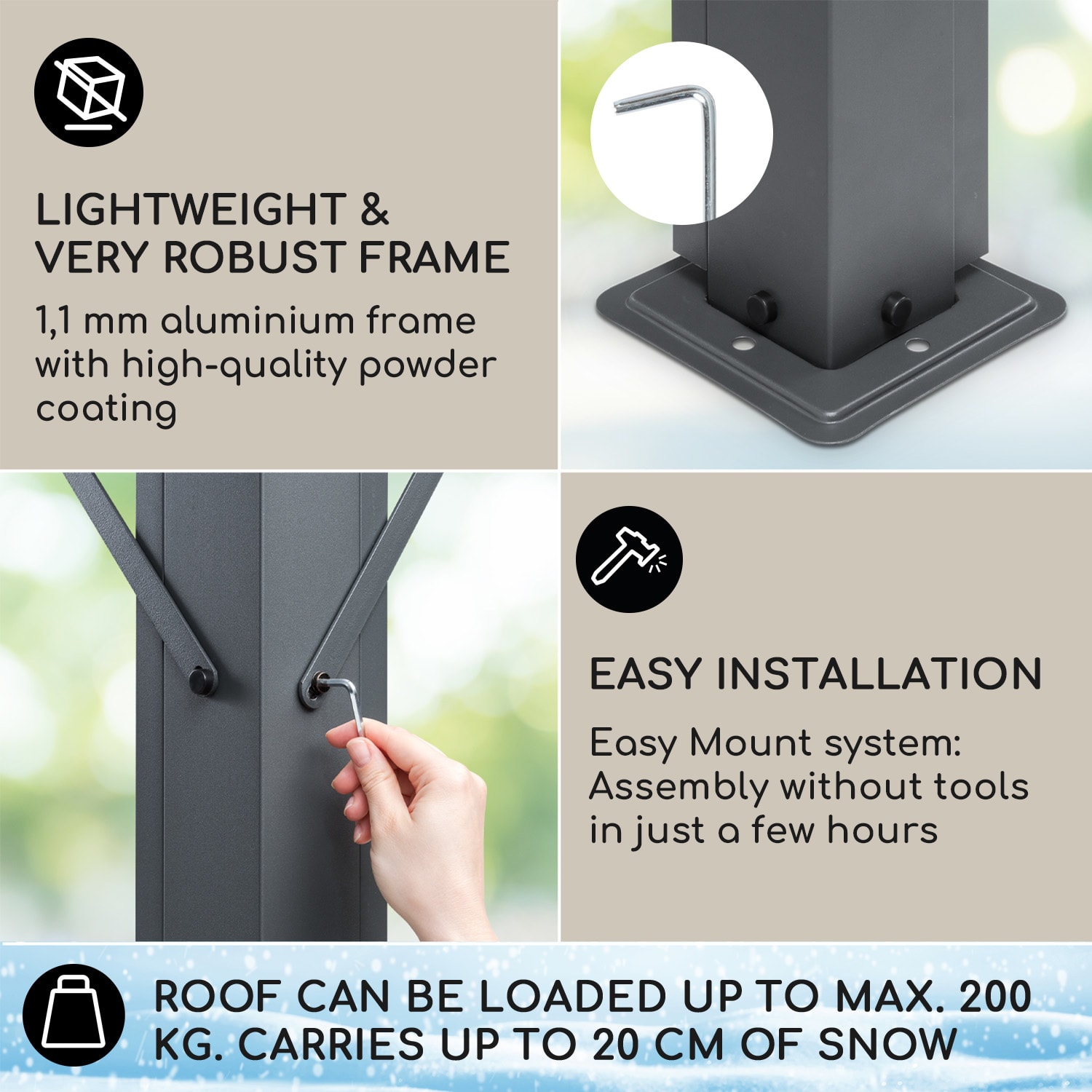 So záhradnou pergolou blumfledt Pantheon Solid Sky Expand sa slovo spontánnosť píše jednoznačne veľkými písmenami. Jedno, či pod ním budú 2, 4 alebo 10 osôb, pod dvojitou pergolou si vďaka možnosti roztiahnutia nájdu všetci svoje miesto.Pekná, stabilná a flexibilná, taká má byť záhradná pergola, aby sa pobyt v záhrade alebo na terase stal zážitkom. Pergola blumfeldt Pantheon Solid Sky Expand prekoná tvoje očakávania: pergola s rozlohou 3 x 5,6 m (max. veľkosť) nerobí dobrú formu len vďaka jednoduchému dizajnu a decentnej farbe. Jej konštrukcia s hliníkových tyčí, lakovaných práškovou metódou, jej dodáva vysokú stabilitu a je obzvlášť ľahká. Okrem iného presviedča pegrola svojou jednoduchou montážou bez ďalšieho náradia. O ochranu za každých okolností sa stará ľahko naklonená strecha zo 6 mm hrubých, vode odolných a jemne tónovaných platní z polykarbonátu. Takto nemá dážď dvakrát takú šancu aby pokazil dobrú náladu. Vďaka dvom stĺpikom s kolieskami sa dá veľkosť strechy nastaviť flexibilne, jednoducho a podľa individuálnych predstáv. Pergolu môžeš použiť aj ako parkovacie miesto alebo prístrešok na bicykle, záhradné prístroje alebo náradie.Užívaj si leto v prírode s priateľmi a tvojou rodinou. Vďaka záhradnej pergole blumfeldt Pantheon Solid Sky Expand môžeš tvoj vonkajší priestor využívať všestranne – a jedno aké počasie bude.