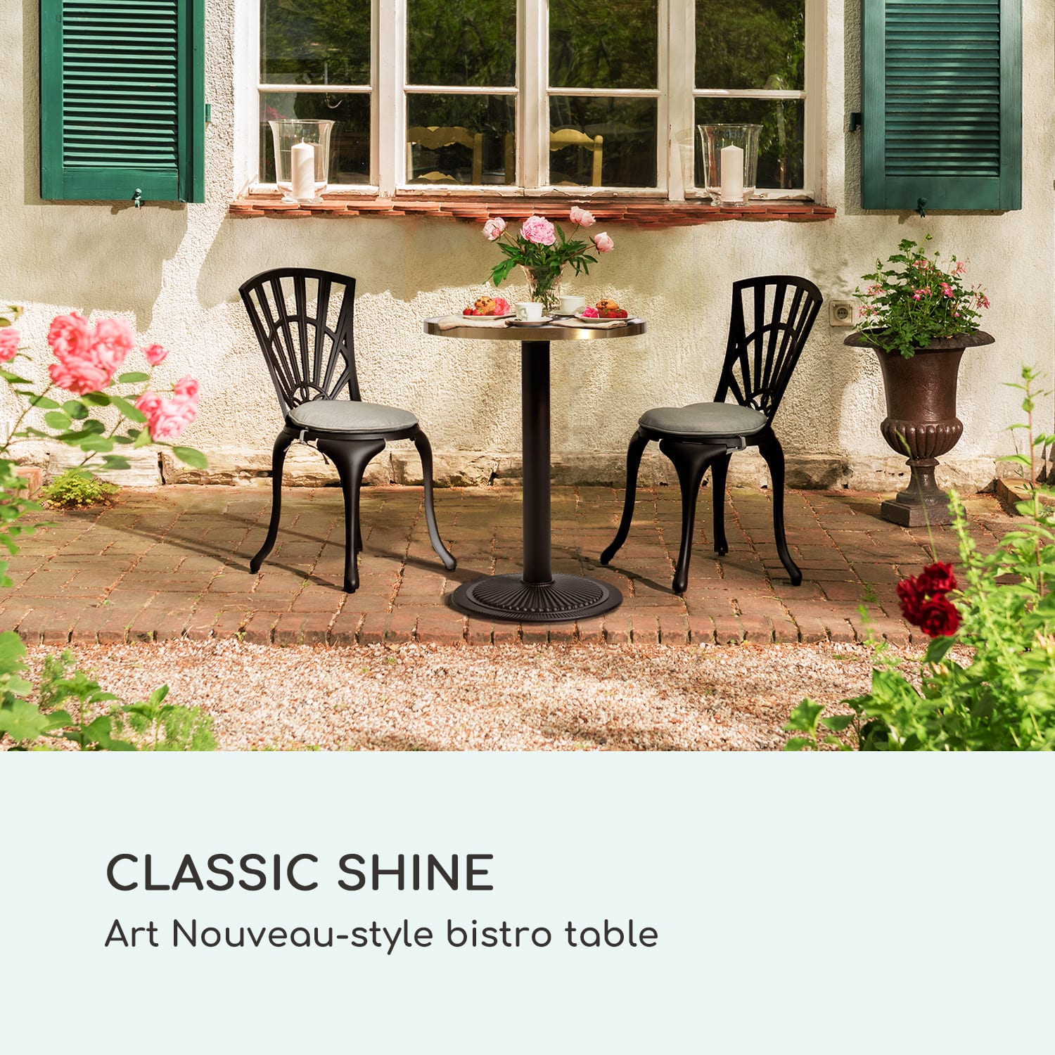S bistro stolíkom blumfeldt Patras Jewel znovu ožívajú zlaté dvadsiate roky.Luxusný pôžitok so secesnou atmosférou – presne to sľubuje záhradný stôl blumfeldt Patras Jewel. Okrúhla doska stola je vyrobená zo starostlivo lešteného pravého mramoru. Tento stolík je teda unikát – vzor a farba horniny vždy prinášajú celkom jedinečný charakter. Ten vynikajúco zdôrazňuje zlatý lem dosky stola a luxusný vzhľad ešte umocňuje liatinový stojan stola. Raňajky na balkóne, príjemná káva na terase alebo romantická večera pri sviečkach pod hviezdami: mramorový stôl blumfeldt Patras Jewel sa postará o výnimočné prostredie.Bistro stolík blumfeldt Patras Jewel šíri luxus a pozýva pobudnúť v špeciálnej secesnej atmosfére!
