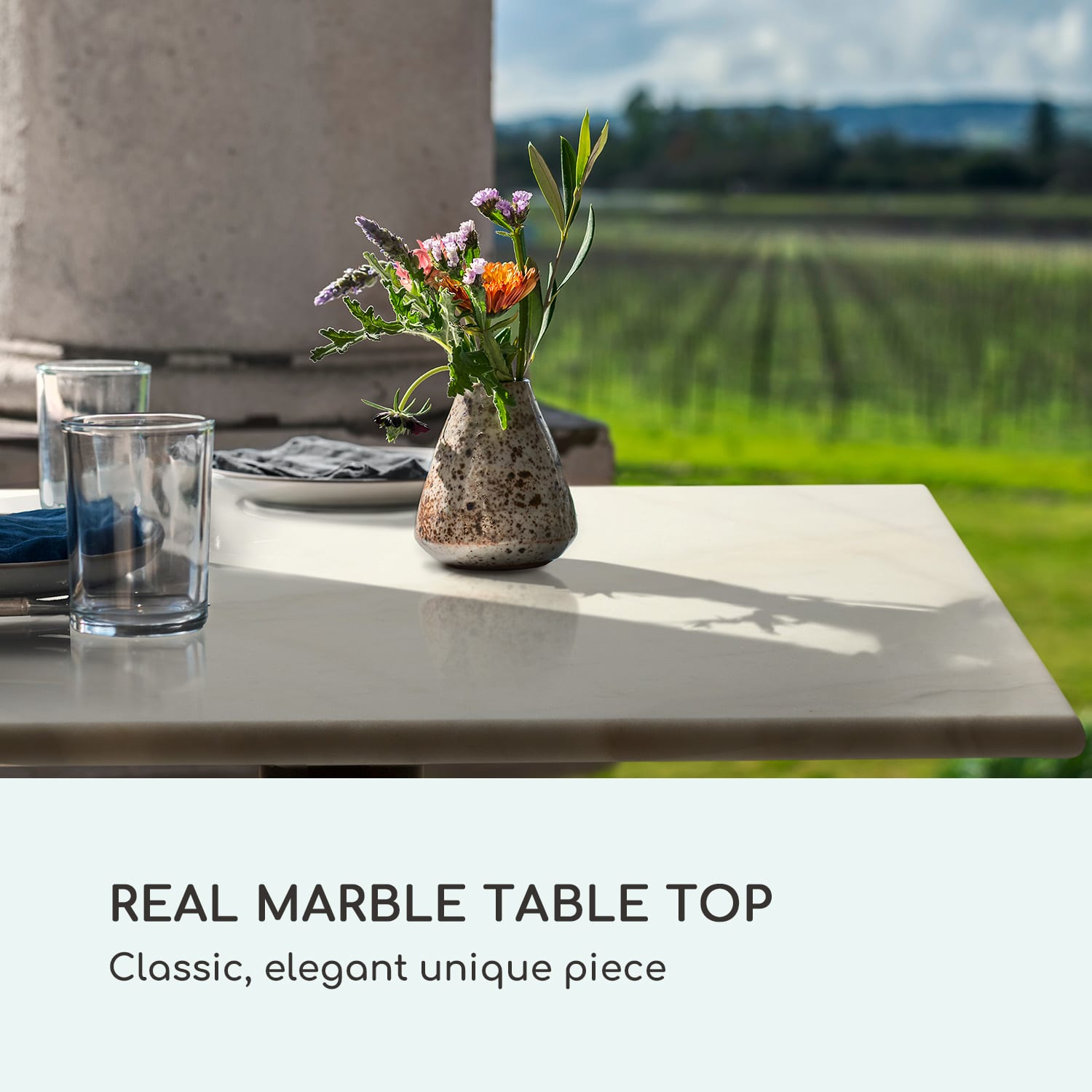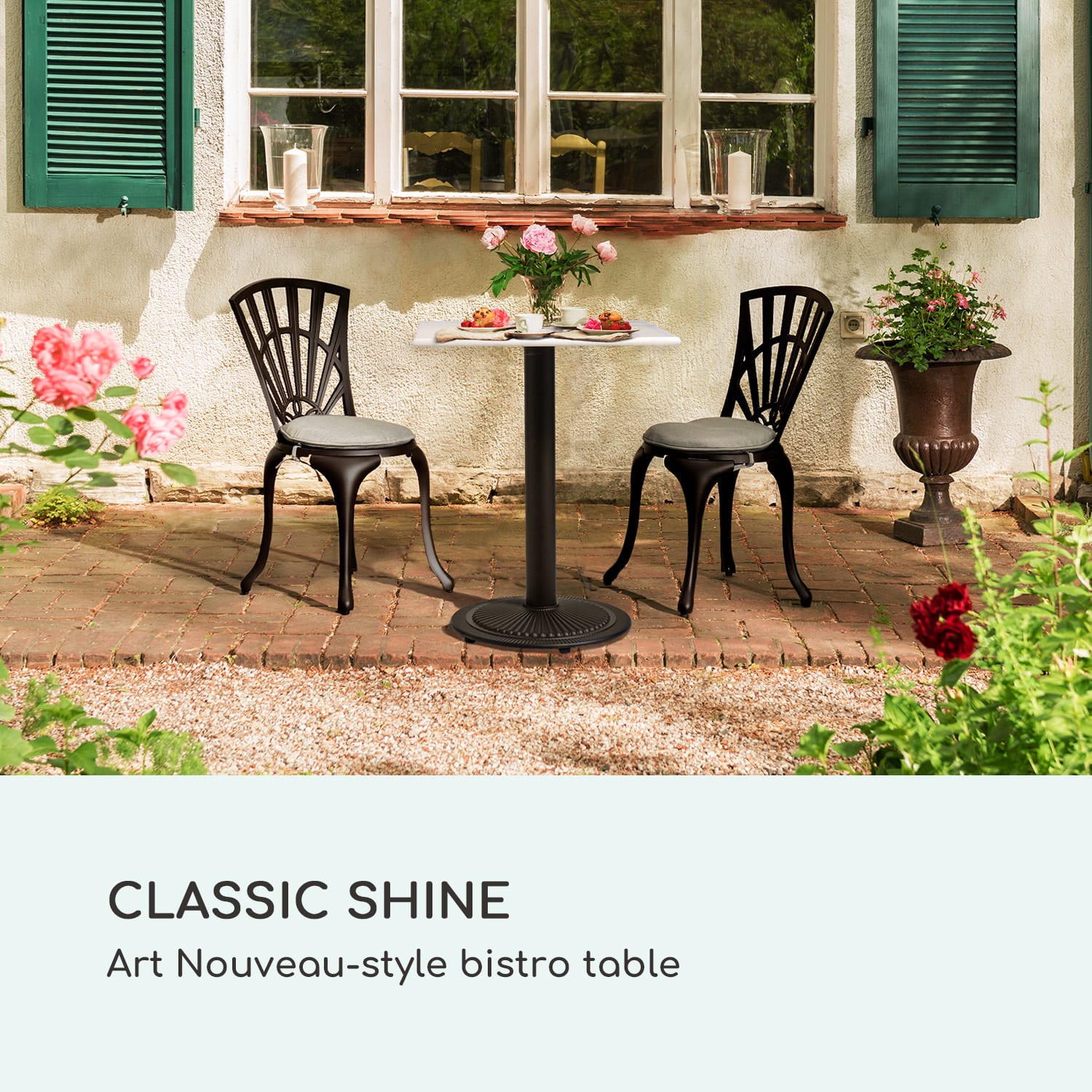 S bistro stolíkom blumfeldt Patras Onyx znovu ožívajú zlaté dvadsiate roky.Luxusný pôžitok so secesnou atmosférou – presne to sľubuje záhradný stôl blumfeldt Patras Onyx. Štvorcová doska stola je vyrobená zo starostlivo lešteného pravého mramoru. Tento stolík je teda unikát – vzor a farba horniny vždy prinášajú celkom jedinečný charakter a poskytnú každému okoliu nový lesk. Skvostný vzhľad je zosilnený stabilným liatinovým stojanom s ornamentami. Raňajky na balkóne, príjemná káva na terase alebo romantická večera pri sviečkach pod hviezdami: mramorový stôl blumfeldt Patras Onyx sa postará o výnimočné prostredie.Bistro stolík blumfeldt Patras Onyx pozýva pobudnúť v špeciálnej secesnej atmosfére!