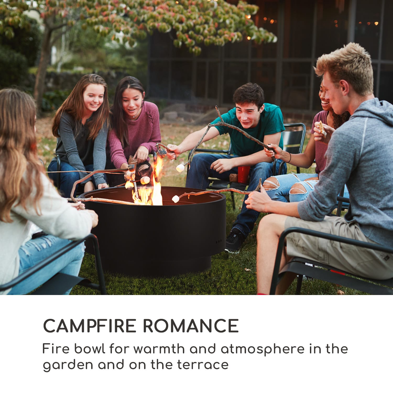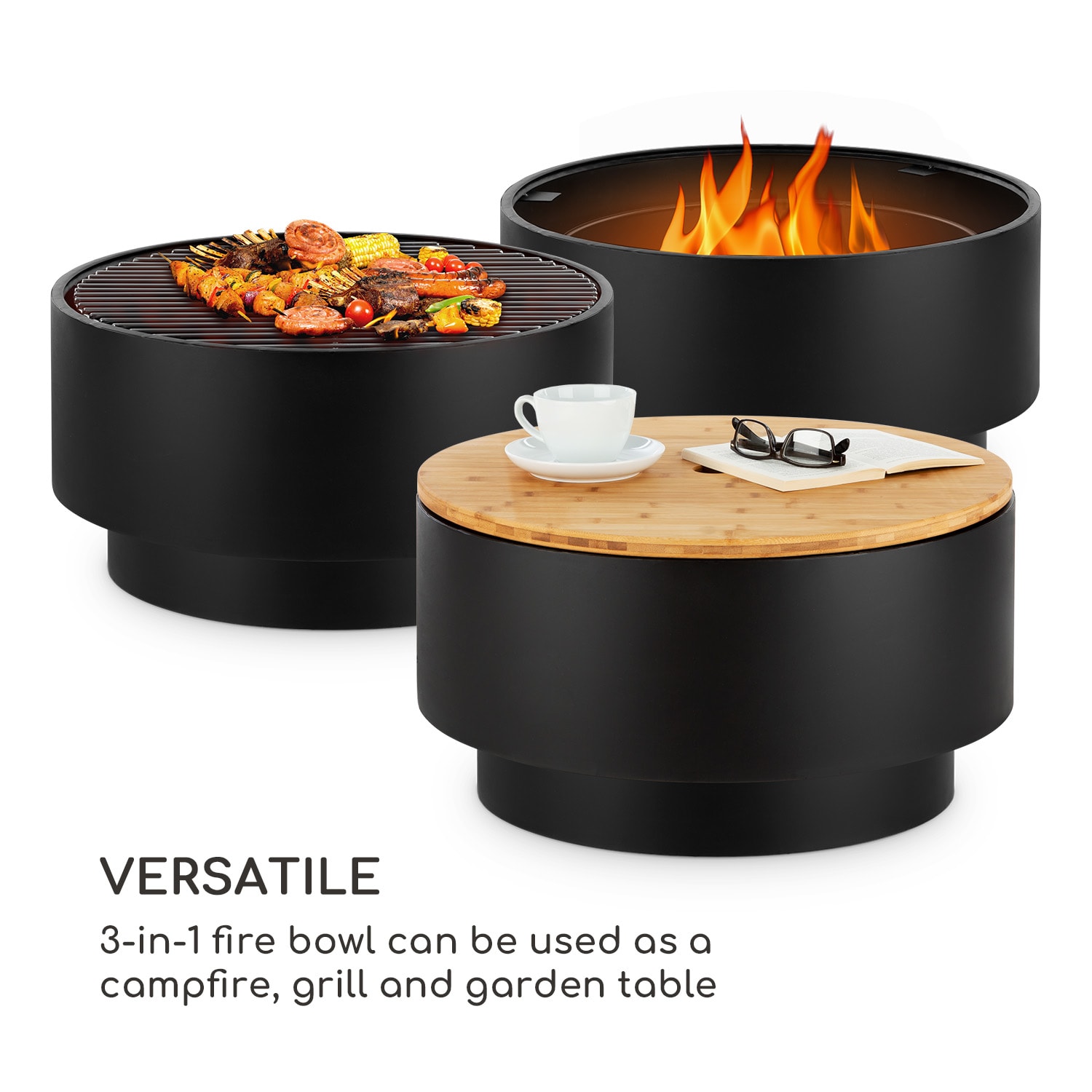 Ohnisko s grilom blumfeldt Pompeji je kombinácia grilu, ohniska a stolíka.Užívaj si večer v záhrade alebo na terase: s ohniskom a grilom blumfeldt Pompeji vám urobí tri krát takú radosť. V ohnisku s priemerom 60 cm šíria drevené polená, uhlie alebo brikety s plápolajúcimi plameňmi príjemné teplo a atmosféru táborového ohňa. Pevný obal je vyrobený z 2,5 mm hrubej ocele a je pokrytý žiaruvzdornou farbou – tak je robustný a chránený voči poveternostným vplyvom. Ale chutný začne byť, ak na ohnisko Pompeji nasadíte 56 cm širokú pochrómovanú grilovaciu mriežku. Stačí jednoducho položiť mriežku na ohnisko a hneď môže začať zábava s grilom. Kruhová základňa s priemerom 48 cm sa stará o bezpečnú stabilitu ohniska Pompeji, či už pri používaní ako gril alebo ako táborák. Avšak vďaka bambusovej doske, ktorá je súčasťou balenia, môžeš ohnisko Pompeji zmeniť na štýlový záhradný stolík. Kruhový tvar a elegantná čierna sa hravo hodia do každej záhrady alebo na terasu.Romantika, teplo a chutné jedlo sú zjednotené v ohnisku a grile blumfeldt Pompeji.