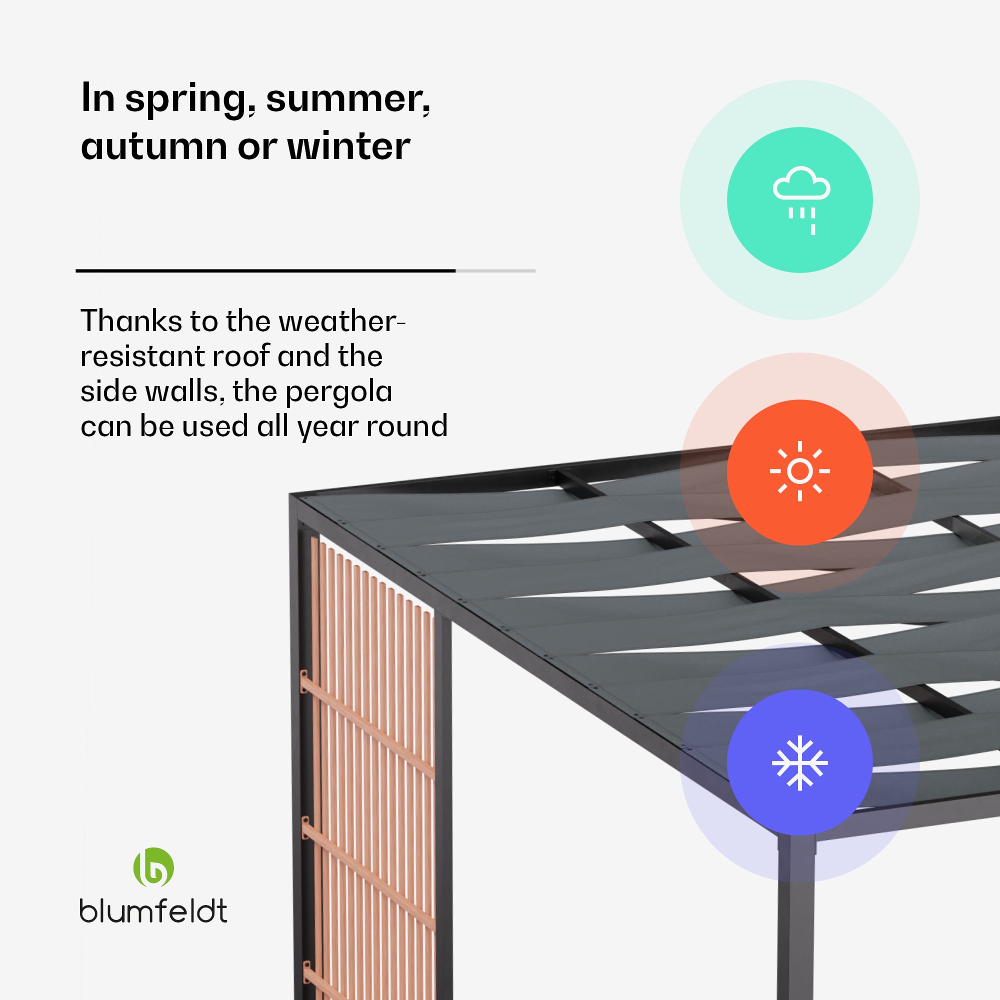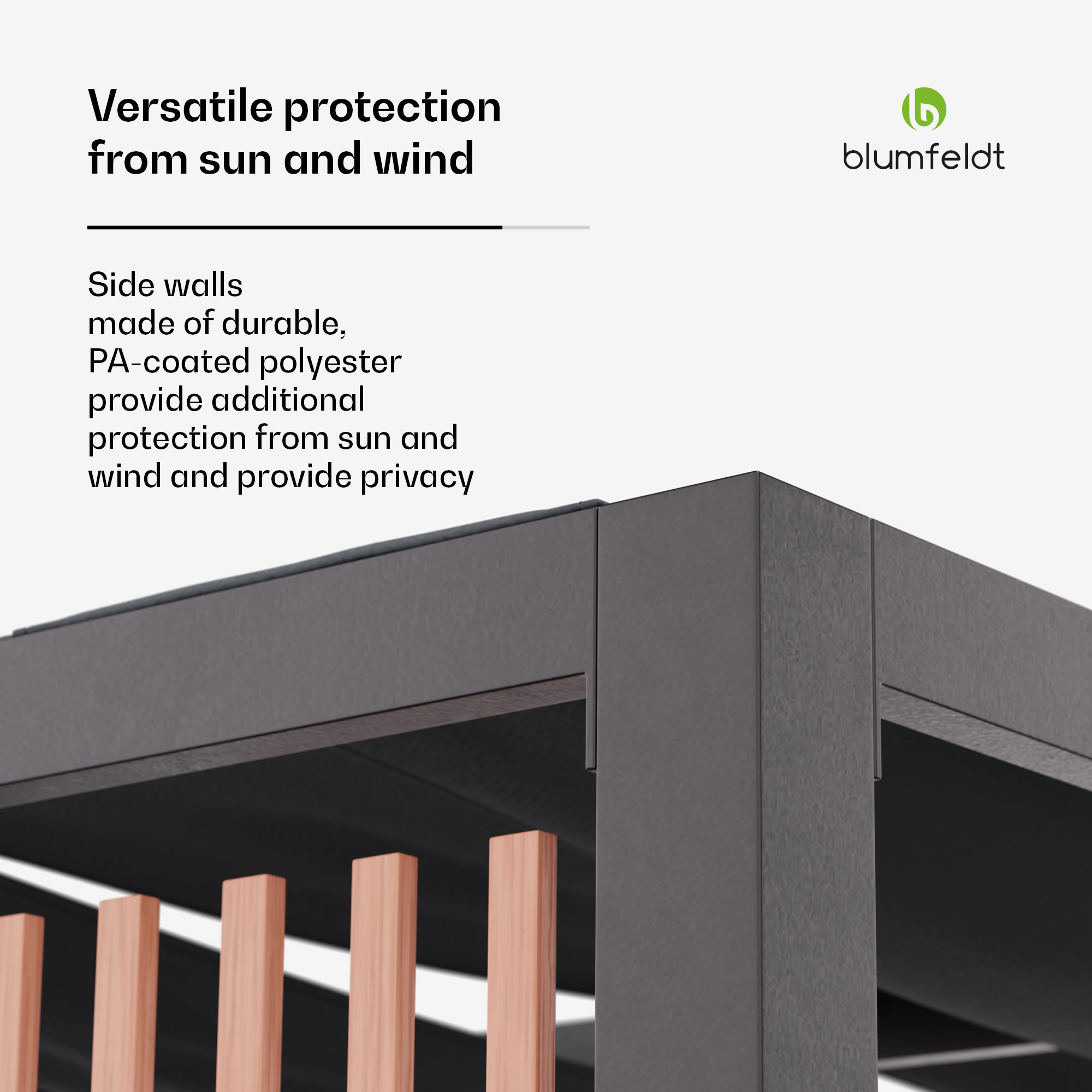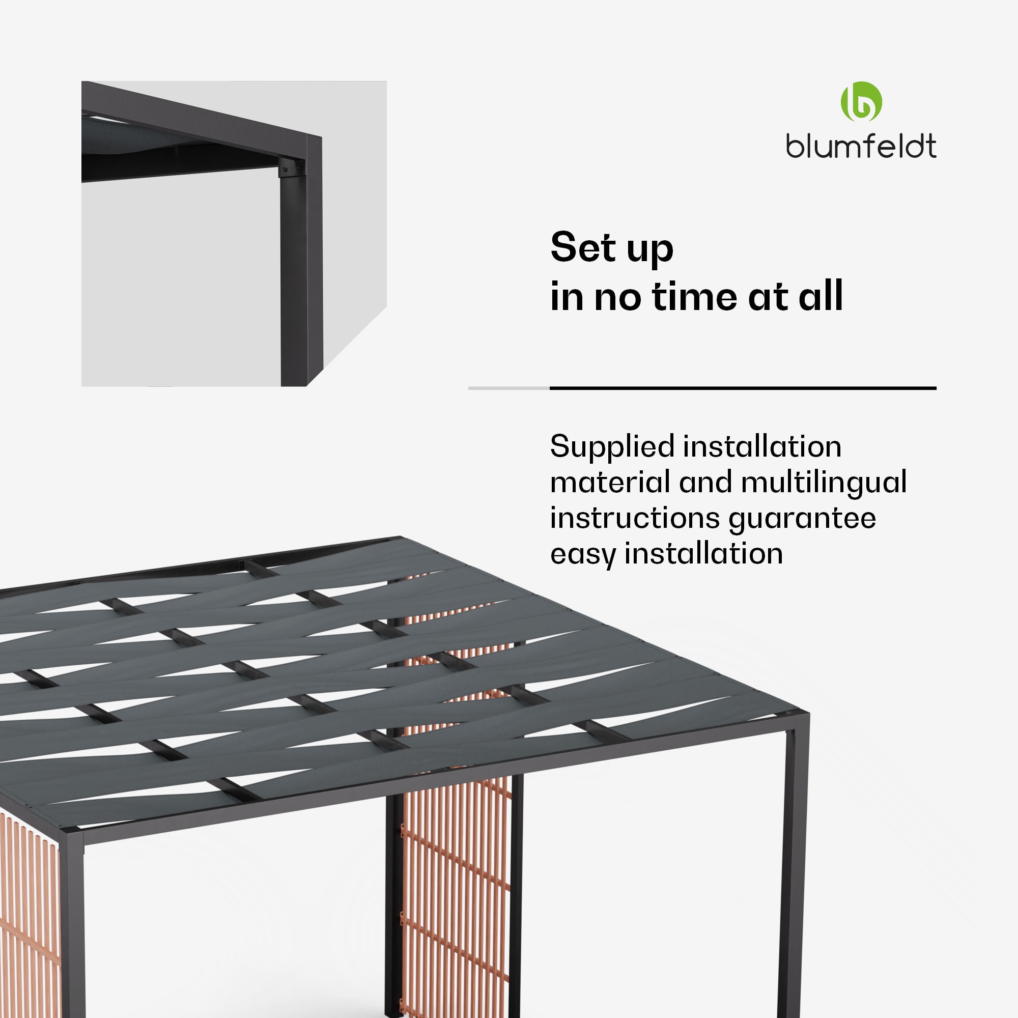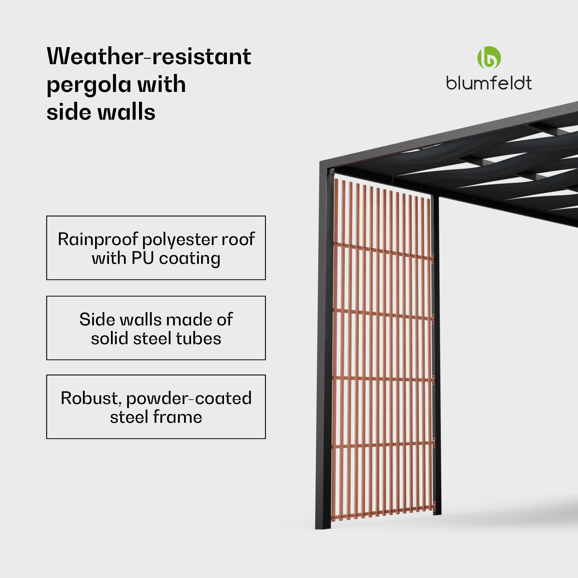 Pergola Blumfeldt Shade Cove Vert ponúka ideálny spôsob, ako rozšíriť váš vonkajší priestor a vytvoriť štýlové vonkajšie útočisko. Vďaka svojmu modernému dizajnu a vysokokvalitným materiálom je nielen funkčným slnečníkom, ale aj estetickou ozdobou vašej záhrady alebo terasy.Táto pergola má robustný rám z práškovo lakovanej ocele, ktorý zaručuje nielen vysokú stabilitu, ale aj dlhodobú radosť z vášho nového vonkajšieho priestoru. Strecha je vyrobená z odolného polyesteru so špeciálnou PA vrstvou, ktorá spoľahlivo chráni pred slnkom, dažďom a inými poveternostnými vplyvmi. Takže si môžete užívať pobyt vonku po celý rok bez obáv z nepriaznivého počasia.Osobitnou prednosťou pergoly Blumfeldt Shade Cove Vert je integrovaná zástena z oceľových rúrok, ktorá vám poskytne súkromie a bezpečnosť vo vašej vlastnej vonkajšej obývačke. Táto zástena na ochranu súkromia zároveň zdôrazňuje moderný dizajn pergoly a dodáva vonkajšiemu priestoru modernú estetiku.Montáž pergoly je mimoriadne jednoduchá a nekomplikovaná vďaka priloženému montážnemu návodu a montážnemu príslušenstvu. Za krátku chvíľu si môžete užívať svoje nové obľúbené vonkajšie miesto a zrelaxovať od každodenného stresu. Doprajte sebe a svojim blízkym štýlové a pohodlné útočisko vo vlastnej záhrade alebo na terase s pergolou Blumfeldt Shade Cove Vert a zažite čistý relax na čerstvom vzduchu.