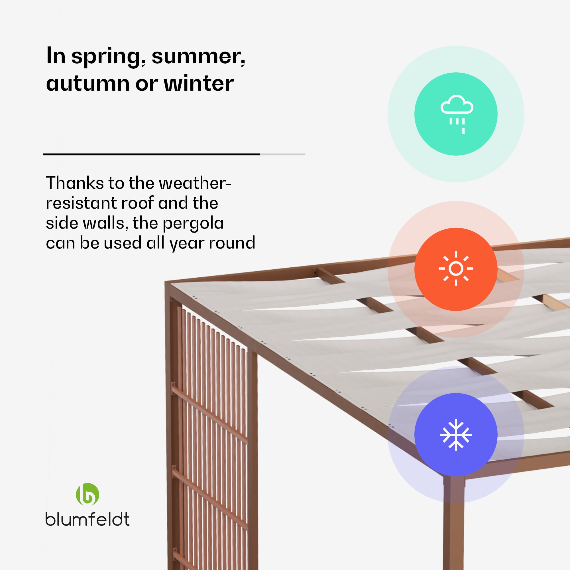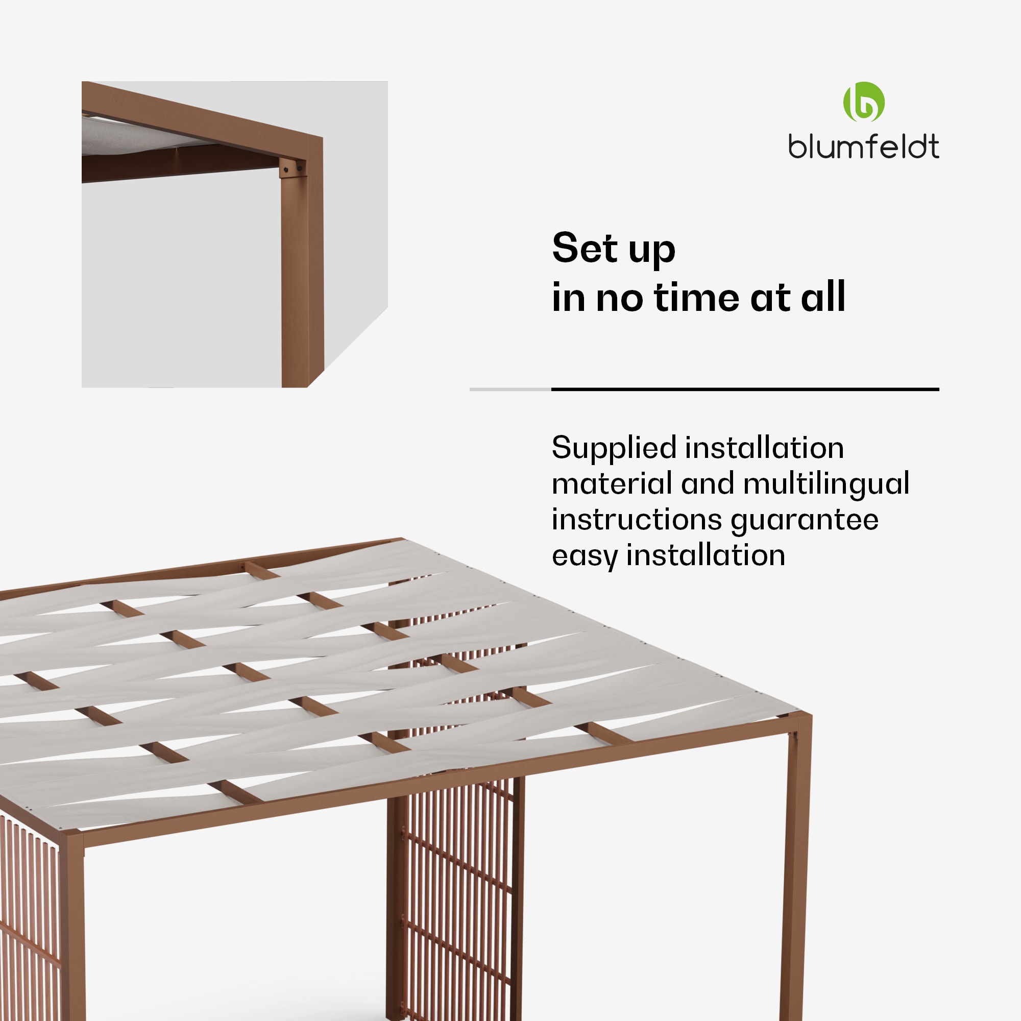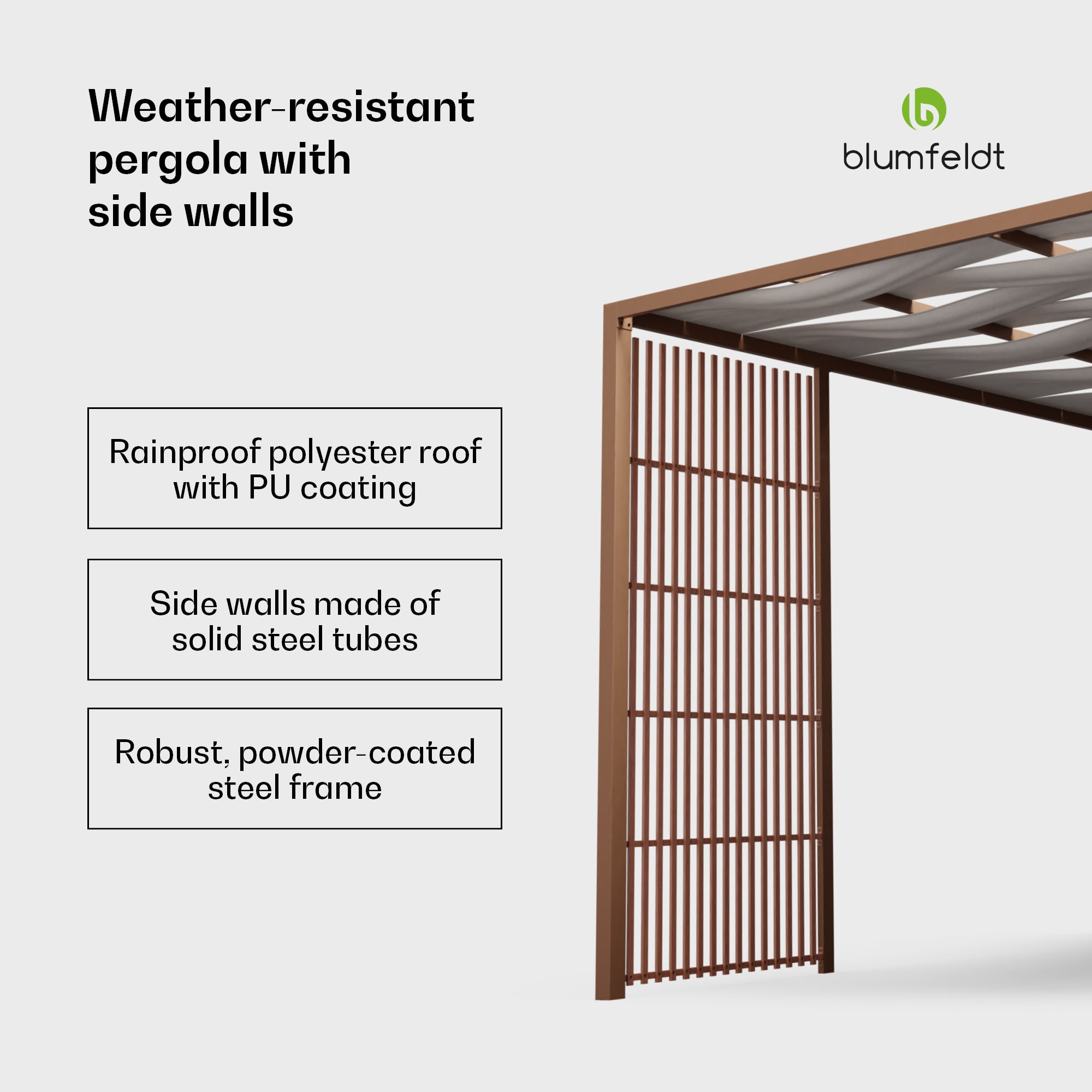 Pergola Blumfeldt Shade Cove Vert ponúka ideálny spôsob, ako rozšíriť váš vonkajší priestor a vytvoriť štýlové vonkajšie útočisko. Svojím moderným dizajnom a kvalitnými materiálmi je nielen funkčnou ochranou pred slnkom, ale aj estetickým spestrením vašej záhrady či terasy.Táto pergola má robustný rám vyrobený z práškovo lakovanej ocele, ktorá zaisťuje nielen vysokú stabilitu, ale sľubuje aj dlhodobý pôžitok z vášho nového vonkajšieho priestoru. Strieška je vyrobená z odolného polyesteru so špeciálnym PA povlakom, ktorý poskytuje spoľahlivú ochranu pred slnkom, dažďom a inými poveternostnými vplyvmi. Takže si môžete užívať pobyt vonku po celý rok bez obáv z nepriaznivého počasia.Osobitnou prednosťou pergoly Blumfeldt Shade Cove Vert je integrovaná zástena z oceľových rúrok, ktorá vám poskytne súkromie a bezpečnosť vo vašej vlastnej vonkajšej obývačke. Táto zástena na ochranu súkromia zároveň podčiarkuje moderný dizajn pergoly a dodáva vášmu vonkajšiemu priestoru súčasnú estetiku.Montáž pergoly je mimoriadne jednoduchá a nekomplikovaná vďaka priloženému montážnemu návodu a montážnemu príslušenstvu. Za krátku chvíľu si môžete užívať svoje nové obľúbené vonkajšie miesto a zrelaxovať od každodenného stresu. Doprajte sebe a svojim blízkym štýlové a pohodlné útočisko vo vlastnej záhrade alebo na terase s pergolou Blumfeldt Shade Cove Vert a zažite čistý relax na čerstvom vzduchu.