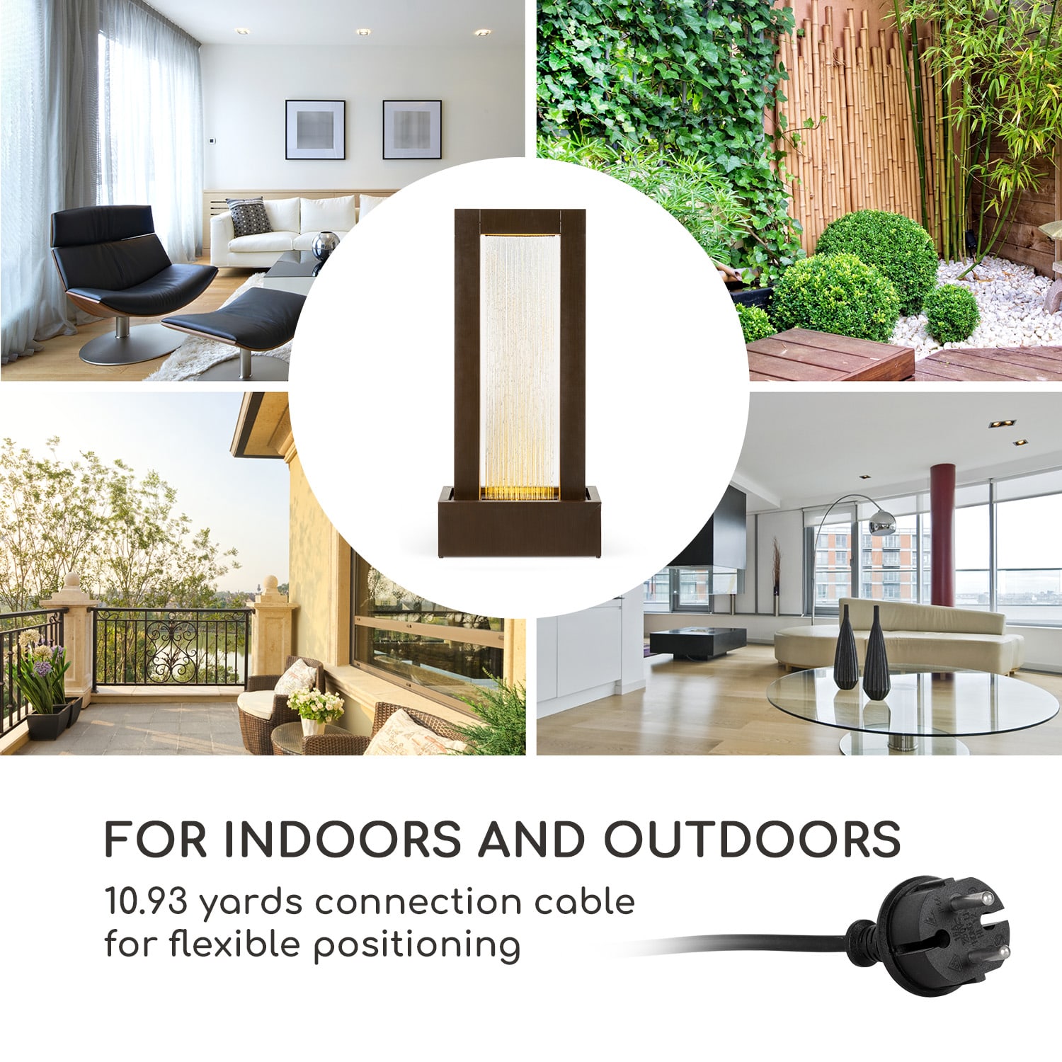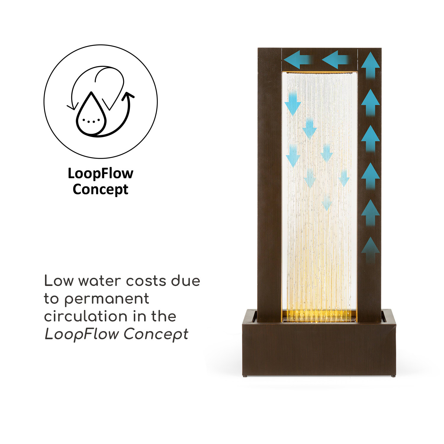 Mystický vodný svet fontány Blumfeldt Skyriver premieňa záhradu, terasu, obývaciu izbu alebo zimnú záhradu na rekreačné prostredie pre oči a uši – očarujúca kombinácia žblnkajúceho prúdu vody, čistej formy a žiarivých odrazov svetla.S jemným žblnkaním okrasnej fontány Blumfeldt Skyriver bude relaxovanie ešte krajšie. Z jej veľkej brány sa vylieva 20 cm široká kaskáda jemne žblnkajúcej vodnej hry do vodnej nádrže, vďaka ktorej sa postará fontána o meditatívnu relaxáciu. Fontána však vizuálne poteší nielen stálym prúdom vody: priamo v nádrži spôsobuje 20 cm široký LED pás, že voda žiari odrazmi teplého bieleho svetla. Kubisticky inšpirovaný fontánový oblúk z pozinkovaného kovu má bronzové prevedenie. Fontána Skyriver poteší myseľ opticky aj akusticky. Je nielen mimoriadne robustná a vďaka kovu odolná voči poveternostným vplyvom, ale je aj plne pozinkovaná: bez hrdze a poškodení sa dokonale začlení do rôznorodých prostredí. Aby sa vodná hra nikdy neunavila, je udržiavaná v nepretržitom obehu pomocou čerpadla s výkonom 12 W. Jemne šumiac odhaľuje maximálny meditačný účinok a osviežuje svoje okolie.Vďaka extrémne dlhému 10 m káblu môže byť fontána Blumfeldt Skyriver umiestnená skutočne ľubovoľne. Všetky časti sú odolné voči poveternostným vplyvom a môžu zostať v exteriéri dokonca aj v nepriaznivom počasí.Stredobod vo Vašej záhrade s krásnym tvarom a vodou: so záhradnou fontánou Blumfeldt Skyriver urobíte zo svojej záhrady alebo bytu mystické miesto odpočinku.