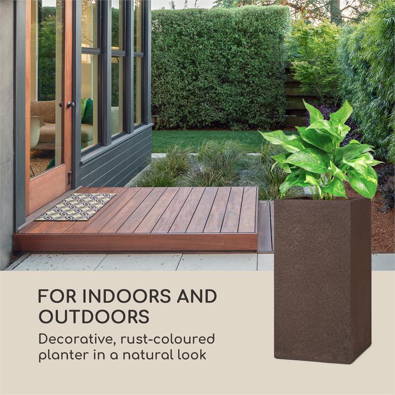 Vytvorte prirodzený vzhľad vo vnútornom aj vonkajšom prostredí s kvetináčom Blumfeldt Solid Grow Rust a oživte svoje okolie zeleňou a farebnými kvetmi.Okrasný kvetináč s rozmermi 40 x 80 x 40 cm (Š x V x H) ponúka dostatok priestoru pre kvety, izbové a záhradné rastliny, ako aj pre vlastné bylinky a zeleninu. Vďaka vyhotoveniu z robustného fibreclay, špeciálnej zmesi zo sklolaminátu a hliny, ktorá je mimoriadne vhodná na kvetináče, je kvetináč Solid Grow Rust nielen odolný voči poveternostným vplyvom, ale tiež chránený pred UV žiarením a mrazom. Môže sa preto používať a uchovávať vonku po celý rok. Ďalšou výhodou tohto materiálu je jeho relatívne nízka hmotnosť, ktorá výrazne uľahčuje premiestňovanie aj prepravu kvetináča. Vďaka svojmu hrdzavému sfarbeniu a svojmu prirodzenému a rustikálnemu vzhľadu sa Solid Grow Rust perfektne hodí do každej záhrady a bývania.Štýlový, všestranný a jednoducho prenosný kvetináč do vnútorného a vonkajšieho priestoru: Solid Grow Rust od spoločnosti Blumfeldt!