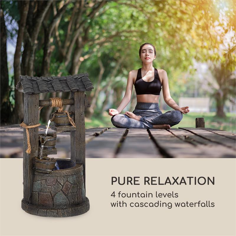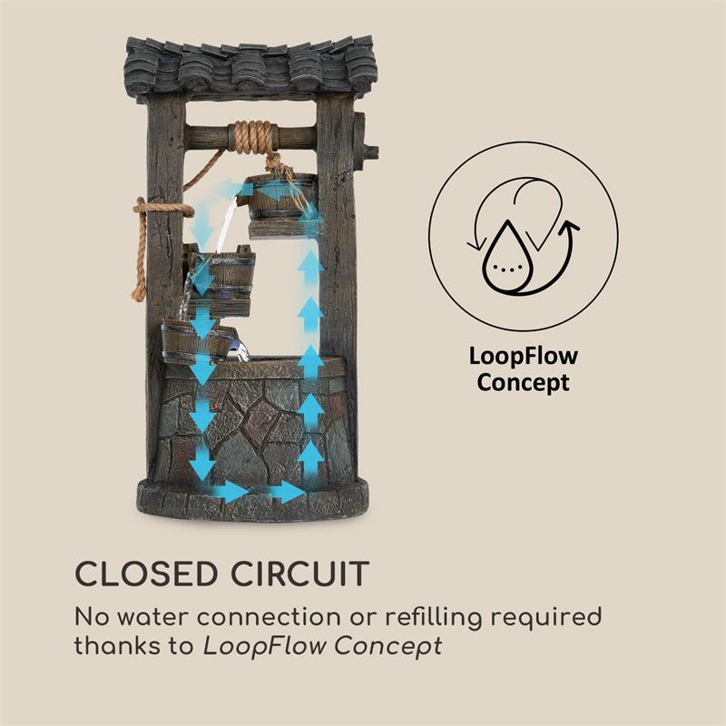 Fontána vo vlastnej záhrade: solárna kaskádová fontána Blumfeldt Speyer umožňuje prúdenie vody medzi jej štyrmi poschodiami vďaka energii slnka a svojou hrou vody pomáha spomaliť svet. Klamlivo skutočne pôsobiaca fontána je mimoriadne dekoratívna a je ozdobou každej záhrady, balkóna alebo obývacej izby.Technológia kaskádovej fontány Blumfeldt Speyer Sunriver Technology sa so svojím 9 V/2,8 W solárnym panelom a integrovaným lítiovo-iónovým akumulátorom postará o to, aby fontána pracovala úplne nezávisle od napájania. Vďaka úložisku energie v akumulátore je možná dokonca aj nočná prevádzka počas 5 hodín. Relaxujte a užívajte si: voda sa so žblnkotom prelieva stálym prúdom cez štyri úrovne fontány. A vďaka pracovnému princípu v koncepcii LoopFlow Concept nie je potrebný žiaden prívod vody ani doplňovanie vody. Výkonné mini čerpadlo udržuje vodu, ktorá sa do fontány jednorazovo naleje, v konštantnej cirkulácii. Postará sa pritom o zdvih vody až do 100 cm a transportuje až 200 litrov vody za hodinu.Nádhera aj v tme: hneď ako sa zotmie, integrované LED osvetlenie začne dodávať vode v záhradnej fontáne Blumfeldt Speyer trblietavé akcenty a pôsobivo osvetľuje záhradu alebo terasu. Vďaka zhotoveniu z polyresinu je fontána nielen vizuálnym stredobodom, ale je tiež mrazuvzdorná, odolná voči poveternostným vplyvom a ľahká.Žiadne náklady na elektrinu, ideálna pre nepretržitú prevádzku: kaskádová fontána Speyer od spoločnosti Blumfeldt.