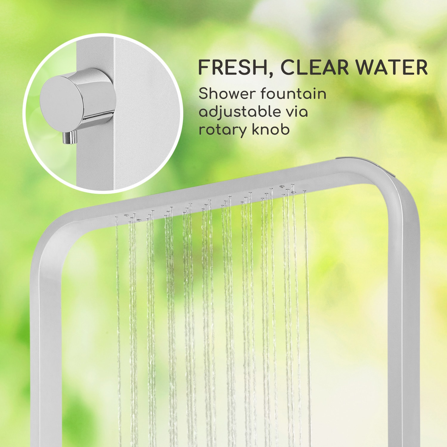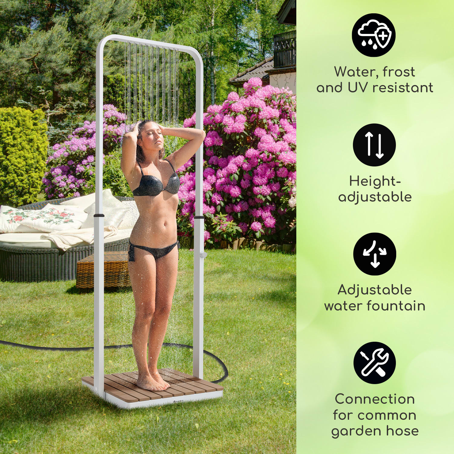 Do studenej vody: podlahová sprcha Blumfeldt Sumatra Breeze prináša chladné osvieženie počas horúcich letných dní.Tento rok si v záhrade úplne jednoducho zachováte chladnú hlavu. Postará sa o to vonkajšia sprcha Blumfeldt Sumatra Breze, jednoduchým a efektívnym spôsobom. Osviežujúci zázrak jednoducho pripojíte na záhradnú hadicu a zábava môže začať. Nožné nastavovacie koliesko nielen zapína vodu, ale tiež reguluje výšku fontán až do 4 metrov. Sprcha ochladzuje hneď dvakrát, pretože voda strieka zo zeme. Najprv sa ostriekať zospodu a potom ešte raz jemne z vrchu. Blumfeld Sumatra Breeze sa perfektne hodí ako sprcha do sauny – predovšetkým preto, lebo si ľahko nájde svoje miesto aj v obmedzenom priestore. Aby radosť z osvieženia bola aj stála, o to sa stará šikovný mix robustných materiálov. Základňa sprchy je z eloxovaného hliníka a zavŕšená je protišmykovým povrchom z WPC, Wood-Plastic-Composite. Nepozostáva ani zo 60% z dreva a tým chráni prírodné zdroje, ale je aj chránená proti plesniam, mrazu, vode a UV žiareniu a dá sa úplne jednoducho čistiť.Leto, slnko, ochladenie. So záhradnou sprchou Blumfeldt Sumatra Breeze si osviežujúcu zábavu z vodou užijete aj v malých záhradách.