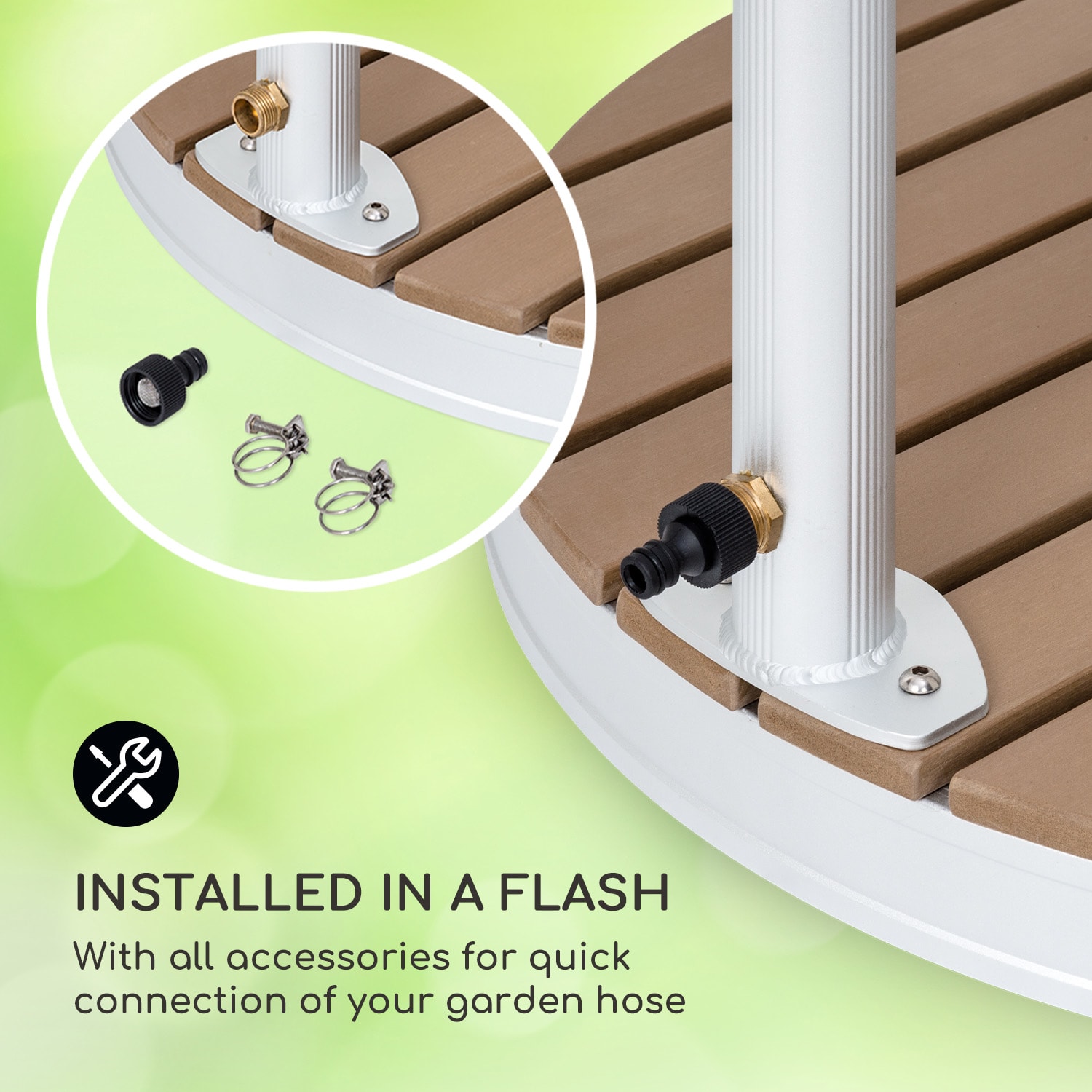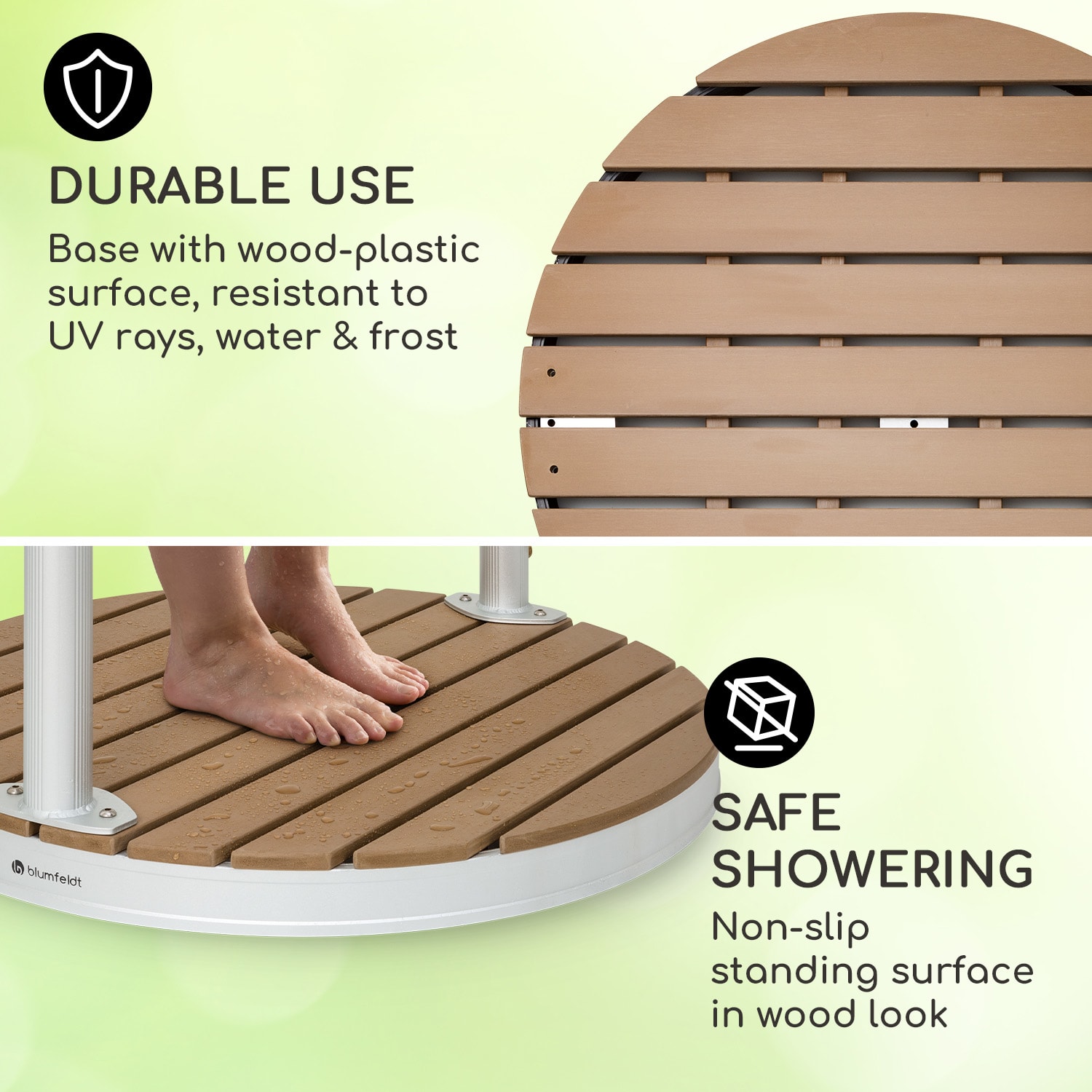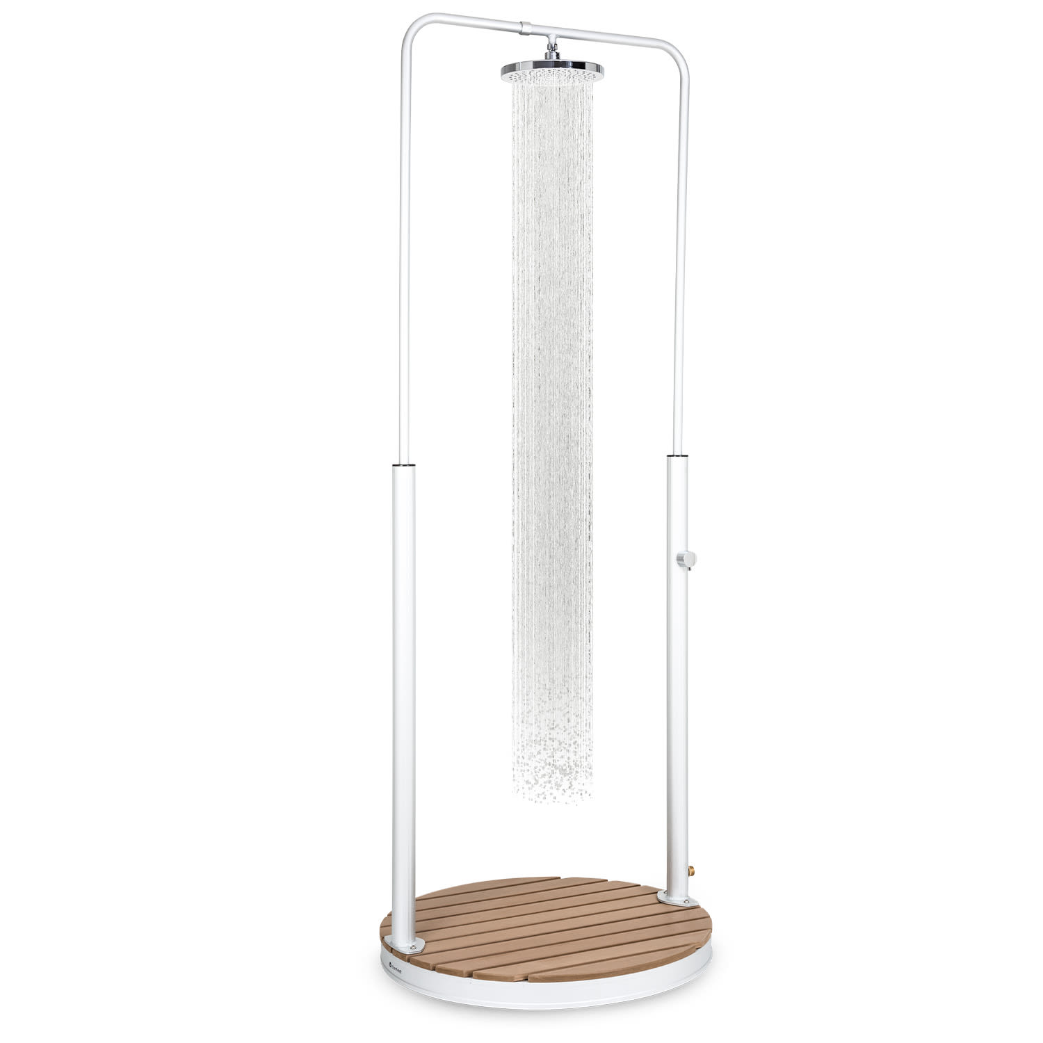 Do studenej vody: záhradná prízemná sprcha Cool Breeze od blumfeldt prináša chladné osvieženie počas horúcich letných dní.Tento rok bude ľahké zachovať si v záhrade chladnú hlavu. O to sa jednoduchým a efektívnym spôsobom postará vonkajšia sprcha Cool Breeze do blumfeldt. Chladivý osviežujúci zázrak stačí pripojiť k záhradnej hadici a zábava sa môže začať. Zapnite vodu a z okrúhlej sprchovej hlavice na vás bude pršať chladná voda ako vodopád. Vďaka tomu je blumfeldt Cool Breeze ideálna aj ako saunová sprcha – najmä preto, že si ľahko nájde miesto aj v obmedzenom priestore. Dômyselná kombinácia robustných materiálov zaručuje dlhotrvajúce osvieženie. Základňa sprchy je vyrobená z eloxovaného hliníka s matnou čiernou povrchovou úpravou a je zakončená protišmykovou doskou z WPC (Wood-Plastic-Composite). Nielenže je zo 60 % vyrobená z dreva, čím šetrí prírodné zdroje, ale je aj odolná voči plesniam, mrazu, vode a UV žiareniu a zároveň sa mimoriadne ľahko čistí. Vďaka nekomplikovanej montáži a demontáži možno prízemnú sprchu v zime skladovať priestorovo úsporne a bez obáv z jej zamrznutia.Leto, slnko, osvieženie. So záhradnou sprchou Cool Breeze od blumfeldt nájdete osviežujúcu zábavu počas kúpania aj v tej najmenšej záhrade.