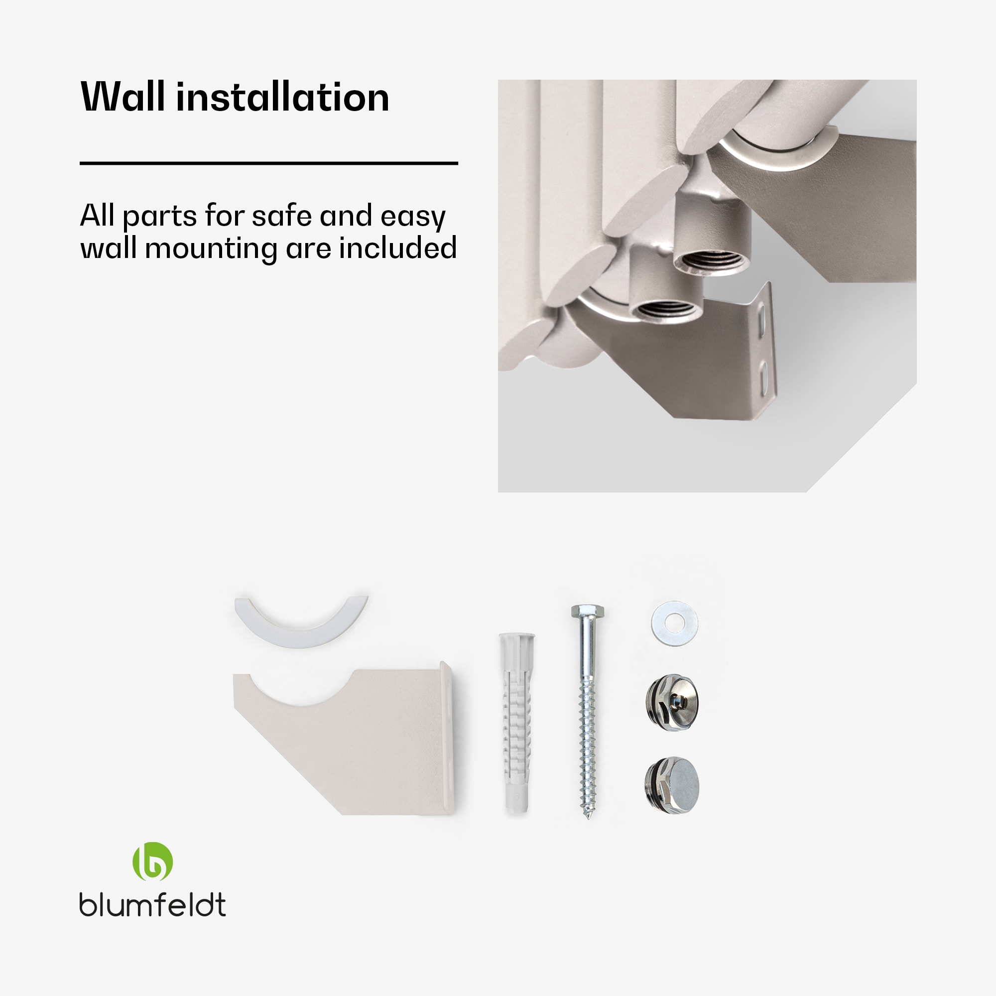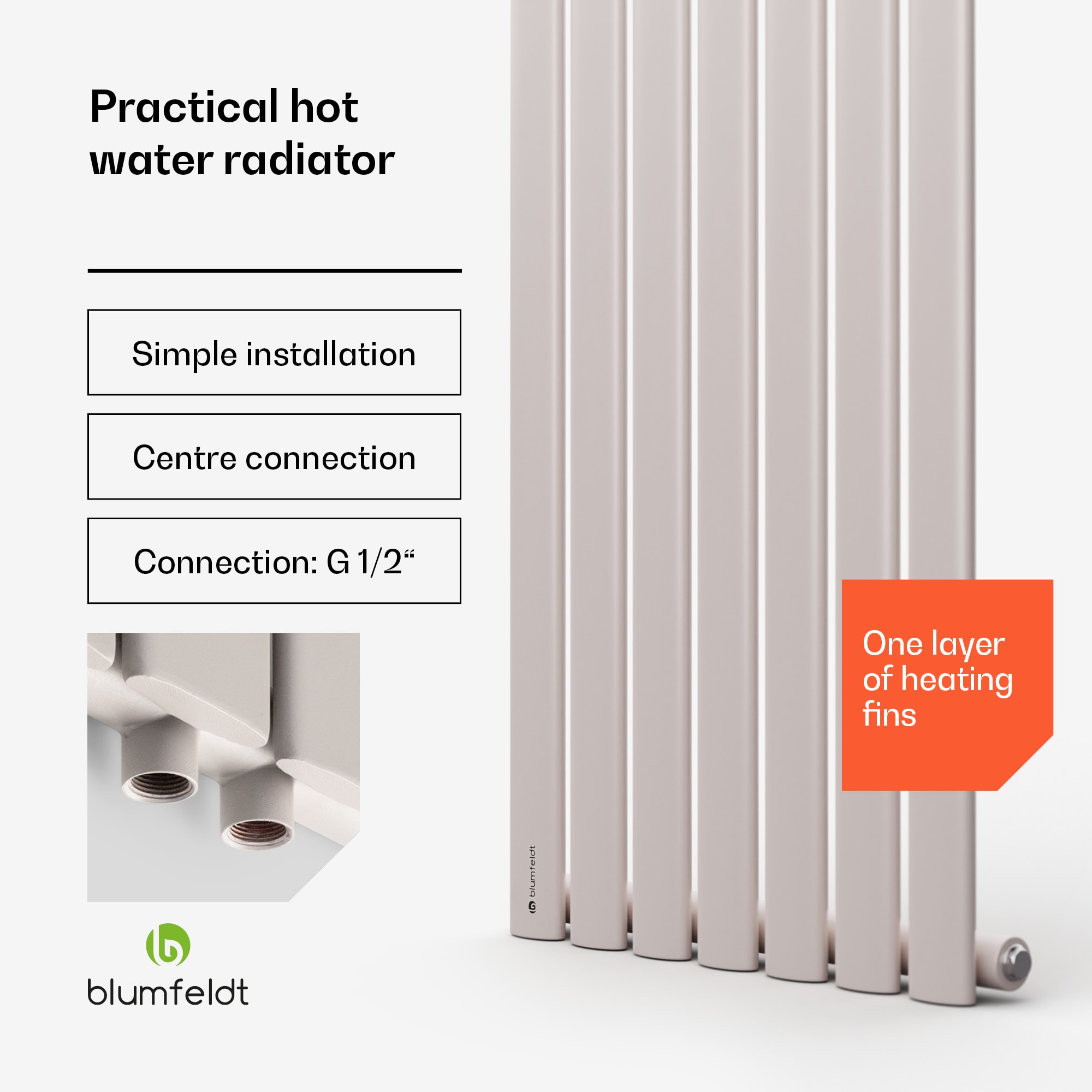 Príjemné teplo pre váš domov v modernom dizajne: radiátor Tallheo 41 x 180 cm od Blumfeldt nielenže vyhreje kúpeľňu na príjemnú teplotu, ale ešte aj atrakívne vyzerá.Rúrkový radiátor Blumfeldt Tallheo 41 x 180 možno jednoducho integrovať do existujúceho systému teplej vody alebo diaľkového vykurovania a funguje aj s elektrickými vykurovacími telesami alebo elektronickými termostatmi. Poskytuje spoľahlivý a rovnomerný zdroj tepla v kúpeľni. Pripojenie je veľmi jednoduché: konštrukcia umožňuje pripojenie v strede aj na bočných rúrkach. Vďaka tomu dokáže Tallheo optimálne reagovať na mnohé konštrukčné podmienky. Potrebné nástenné konzoly sú tiež priamo súčasťou balenia. Robustný systém kovových rúrok optimálne vedie a rozvádza teplo až do 70 °C. Vďaka svojim 7 vertikálnym vykurovacím rúram má navyše optimálne zväčšený povrch a dosahuje tak tepelný výkon až 691 W.Vďaka špeciálnemu tenkému dizajnu so šírkou len 41 cm a hĺbkou 5,5 cm sa perfektne hodí do všetkých miestností s obmedzeným priestorom. Vďaka medzerám medzi 7 rúrkami sa radiátor veľmi jednoducho čistí. Príjemné teplo hneď po sprchovaní alebo kúpaní s radiátorom Tallheo 41 x 180 od Blumfeldt – štýlový zážitok.