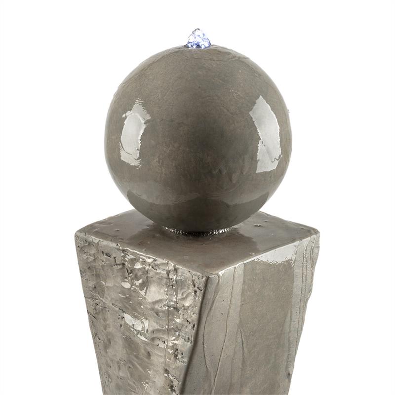 Impozantný stredobod záhrady: záhradná fontána Blumfeldt Trafalgar víťazne dominuje v záhrade a svojou hrou vody jej poskytuje osviežujúce aspekty.Záhradná fontána Blumfeldt Trafalgar z robustného sklolaminátového cementu s dizajnom liateho cementu prevýši iné záhradné dekorácie. So svojou výškou 1,50 m víťazne vytŕča spomedzi všetkých záhonov a stáva sa tak stredom záhrady. Z vyvýšenej guľovitej časti centrálneho stĺpa osviežujúco vyviera voda, ktorá prúdi cez zaoblené povrchy späť do nádrže. Malé, no výkonné čerpadlo sa postará o neustálu cirkuláciu, takže vodu netreba dopĺňať. V nádrži špeciálne priťahuje pozornosť 4,5 kg dodávaných ozdobných kameňov z červeného tufu (každý s priemerom približne 8 cm), ktoré je možné rozdeliť podľa vlastných preferencií. Malý LED veniec zabezpečuje nočné osvetlenie, ktorý rozžiari ako korunka vodu na guli. To však nie je zďaleka všetko. Elektrický systém je inštalovaný vo vnútri okrasnej fontány a nenarúša teda jej vzhľad. Pre vonkajšie použitie odolné voči poveternostným vplyvom je fontána certifikovaná podľa IP44. 5 metrov dlhý kábel umožňuje ľubovoľné umiestnenie v záhrade.Triumf záhradnej dekorácie: okrasná fontána Blumfeldt Trafalgar odvážne vystupuje zo záhradnej scenérie a poskytuje impozantný pohľad.